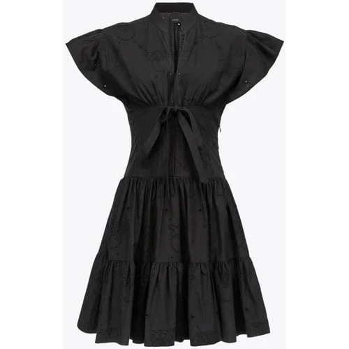 Sukienka mini marki PINKO w kolorze czarnym oraz ozdobnymi wiązaniami na z przodu w okolicy dekoltu. Całość uzupełniona jest falbanami przy rękawach oraz spodzie sukienki. Charakteru sukience dodają ozdobny motyw z logo Love Birds na całej powierzchni. Sukienka sprawdzi się doskonale na wakacyjne wypady oraz w codziennych stylizacjach.