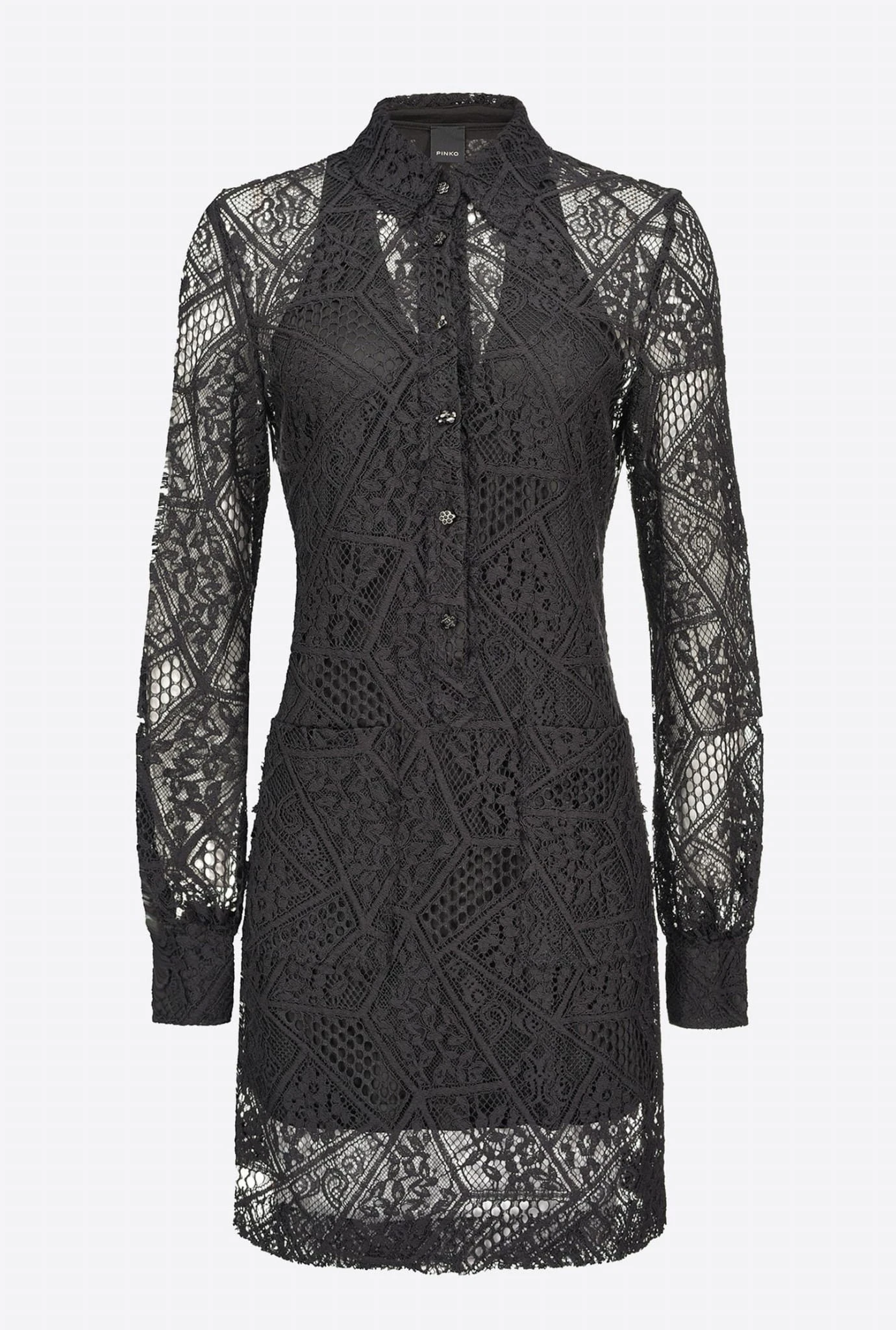 Koronkowa sukienka mini włoskiej marki PINKO w kolorze czarnym. Prosty, dopasowany krój, głęboki dekolt w kształcie litery "V" oraz koronkowe wykończenia dodają charakteru i zmysłowości sukience. Sukienka Main Street będzie doskonałą propozycją na wyjątkowe okazje oraz wieczorne wypady na miasto.