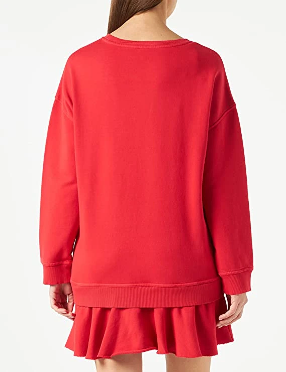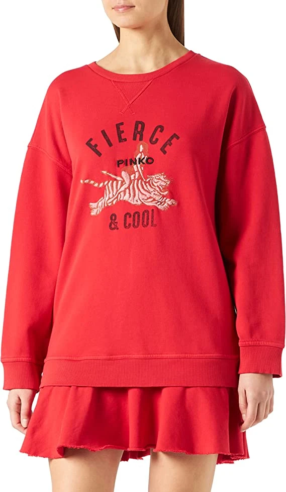 Sukienka mini włoskiego domu mody PINKO w kolorze czerwonym. Wykonana została z wysokogatunkowej bawełny, a całość ozdobiona printem z logiem marki oraz falbaną na dole. Sukienka posiada okrągły dekolt, długie bufiaste rękawy oraz luźny krój.