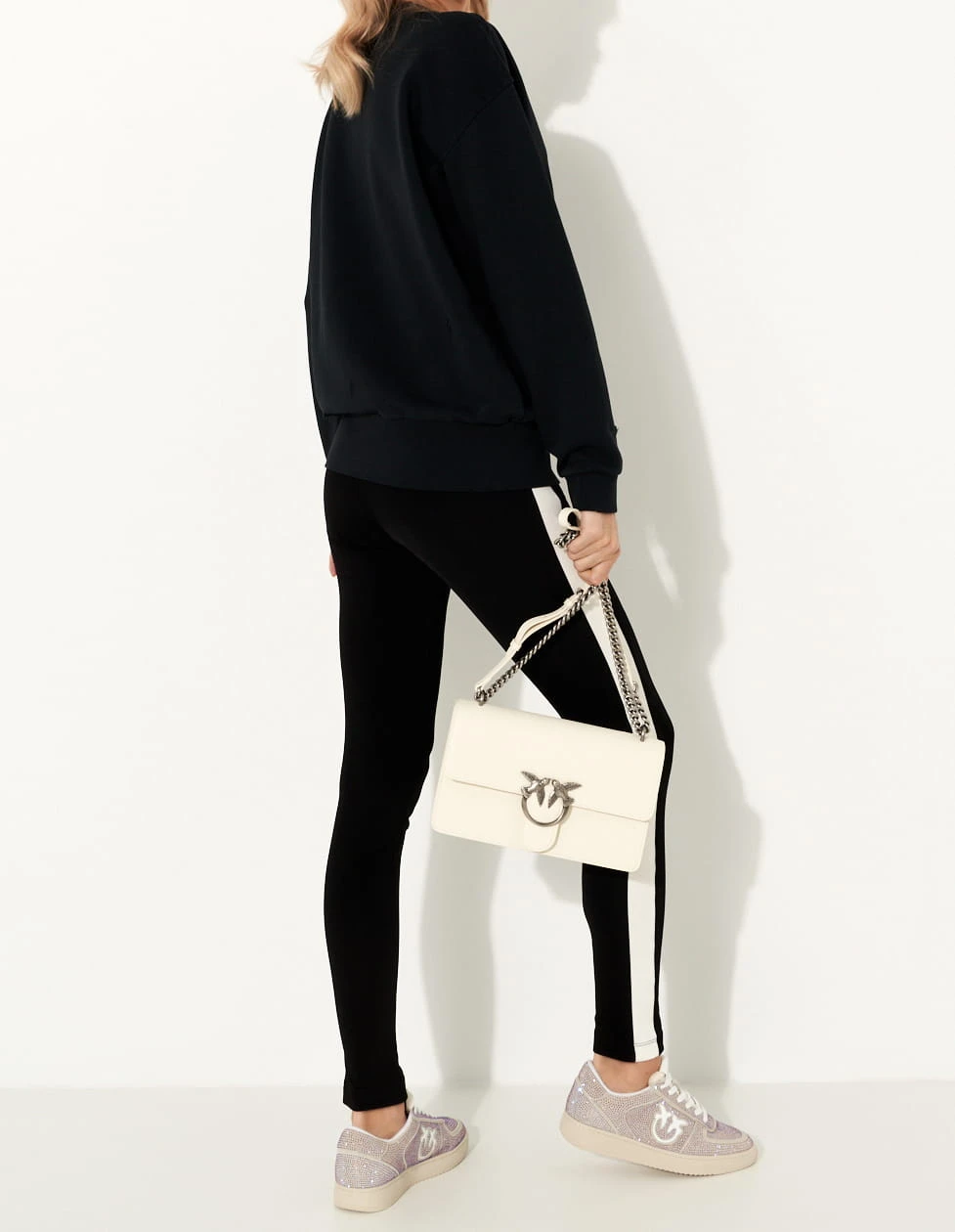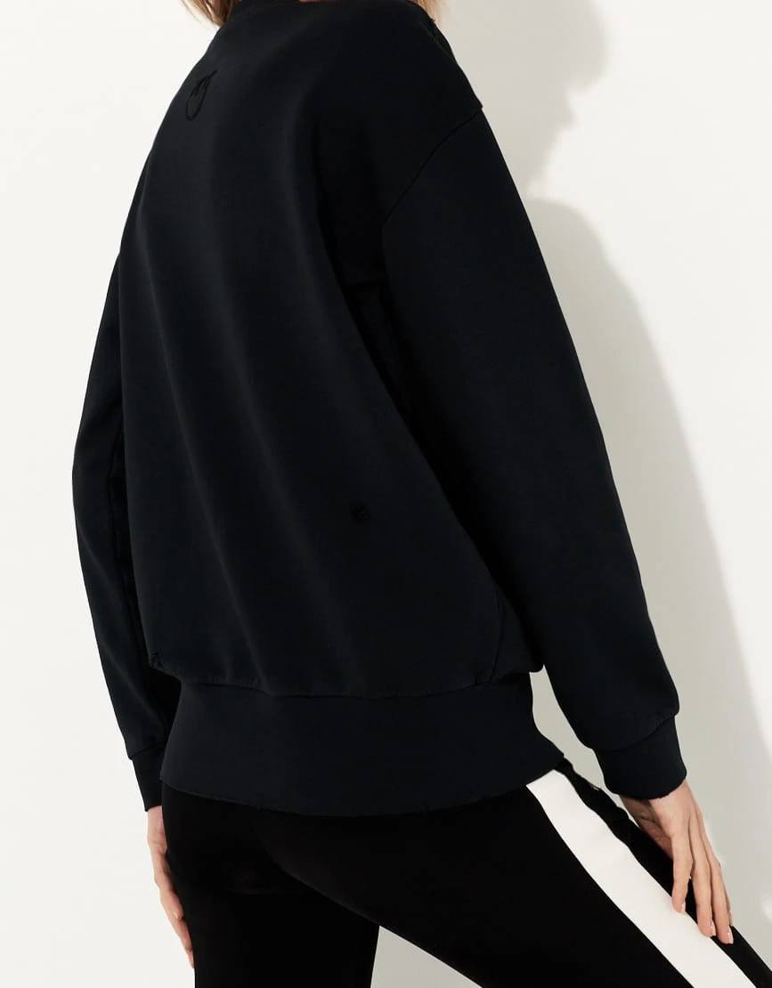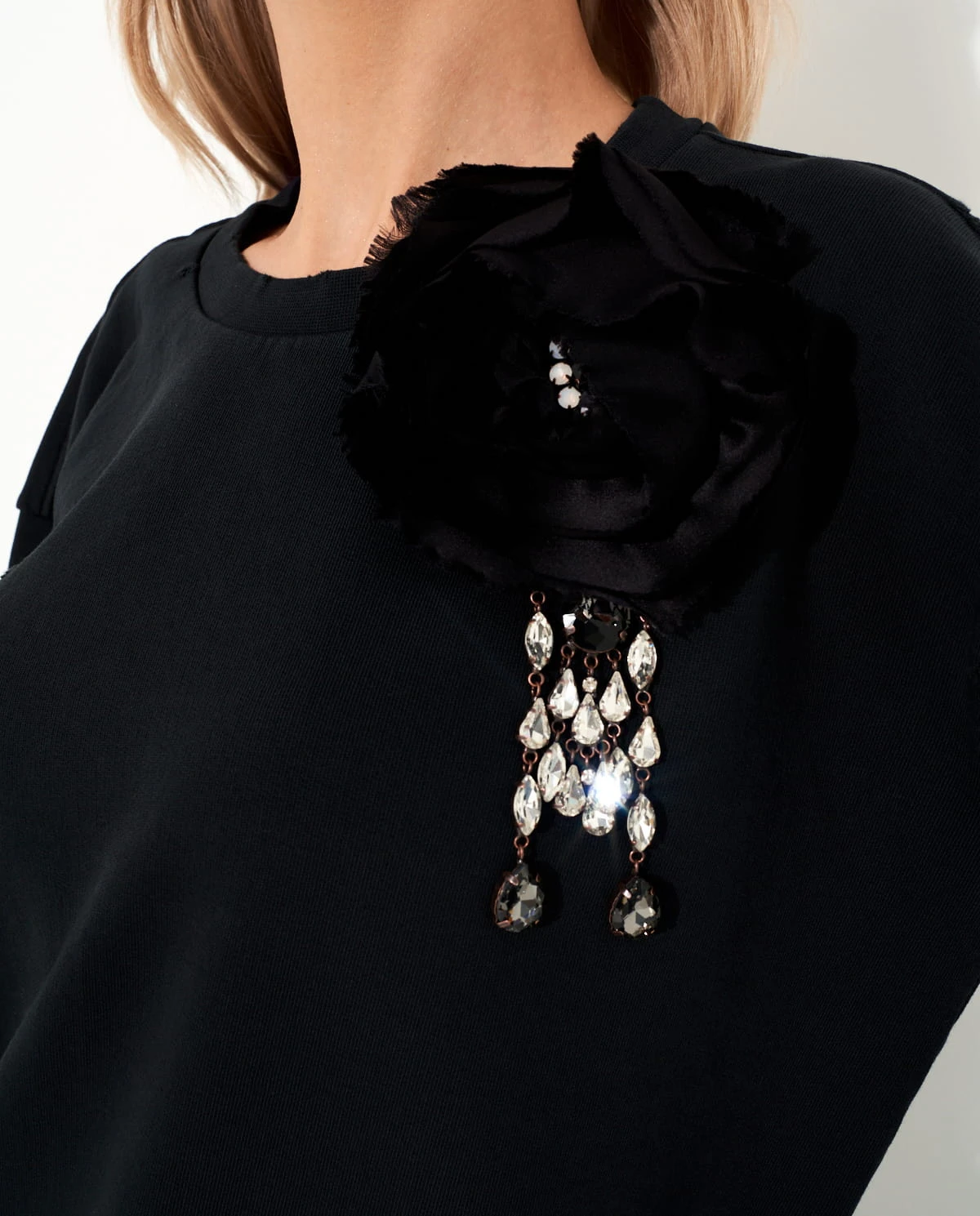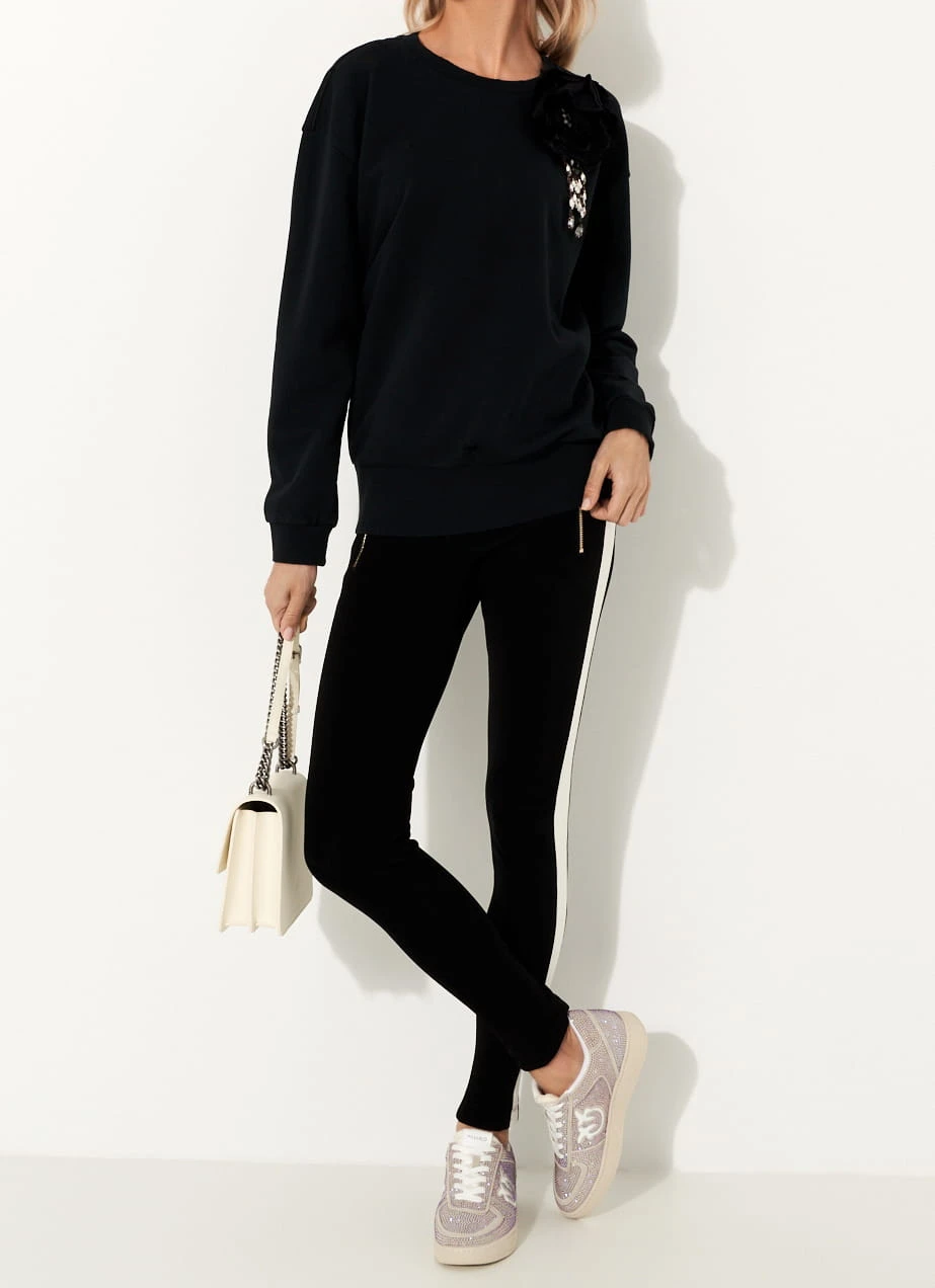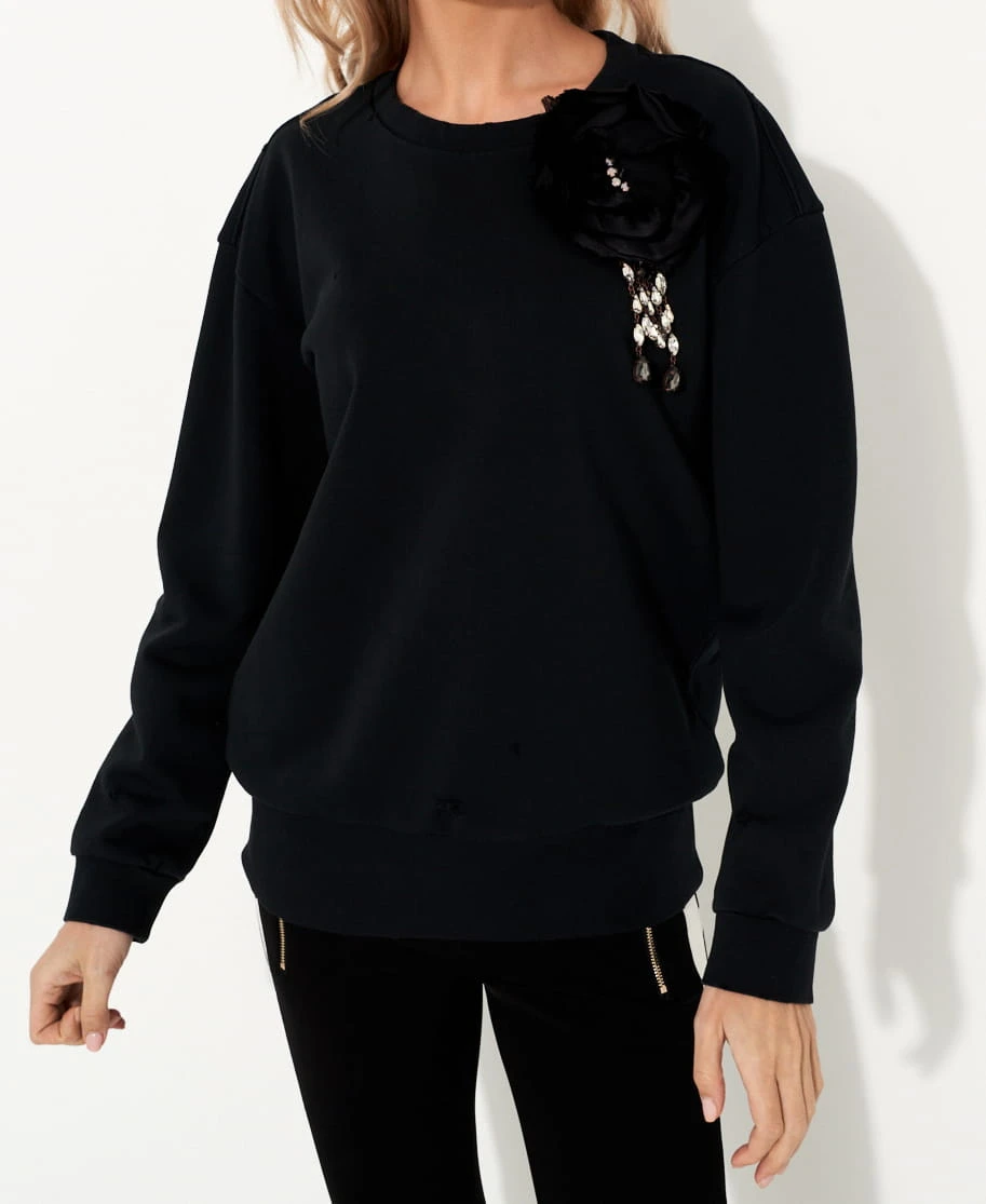 Czarna bluza z broszką Sano marki Pinko to elegancka i wyjątkowa propozycja na co dzień. Wykonana z wysokiej jakości bawełny, zapewnia wygodę i komfort. Okrągły dekolt oraz długie rękawy nadają jej klasyczny, ponadczasowy wygląd. Z tyłu, na karku, subtelny haft z logo *Love Birds* dodaje jej ekskluzywności. Całość uzupełnia ozdobna broszka z kwiatem i kryształkami, która wprowadza elegancki akcent, przełamując casualowy charakter bluzy. Idealna do stylizacji, które łączą wygodę z luksusowym detalem.