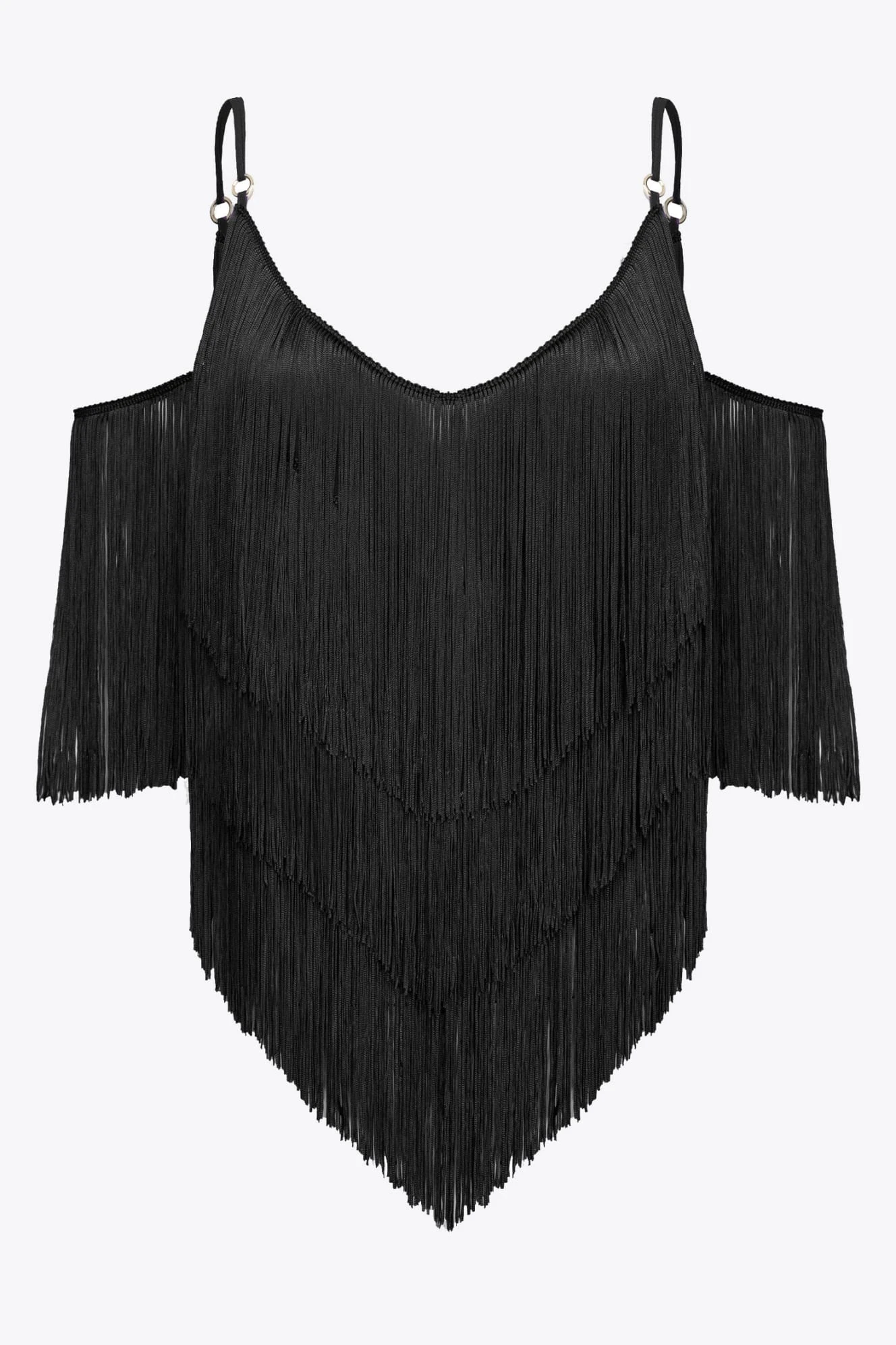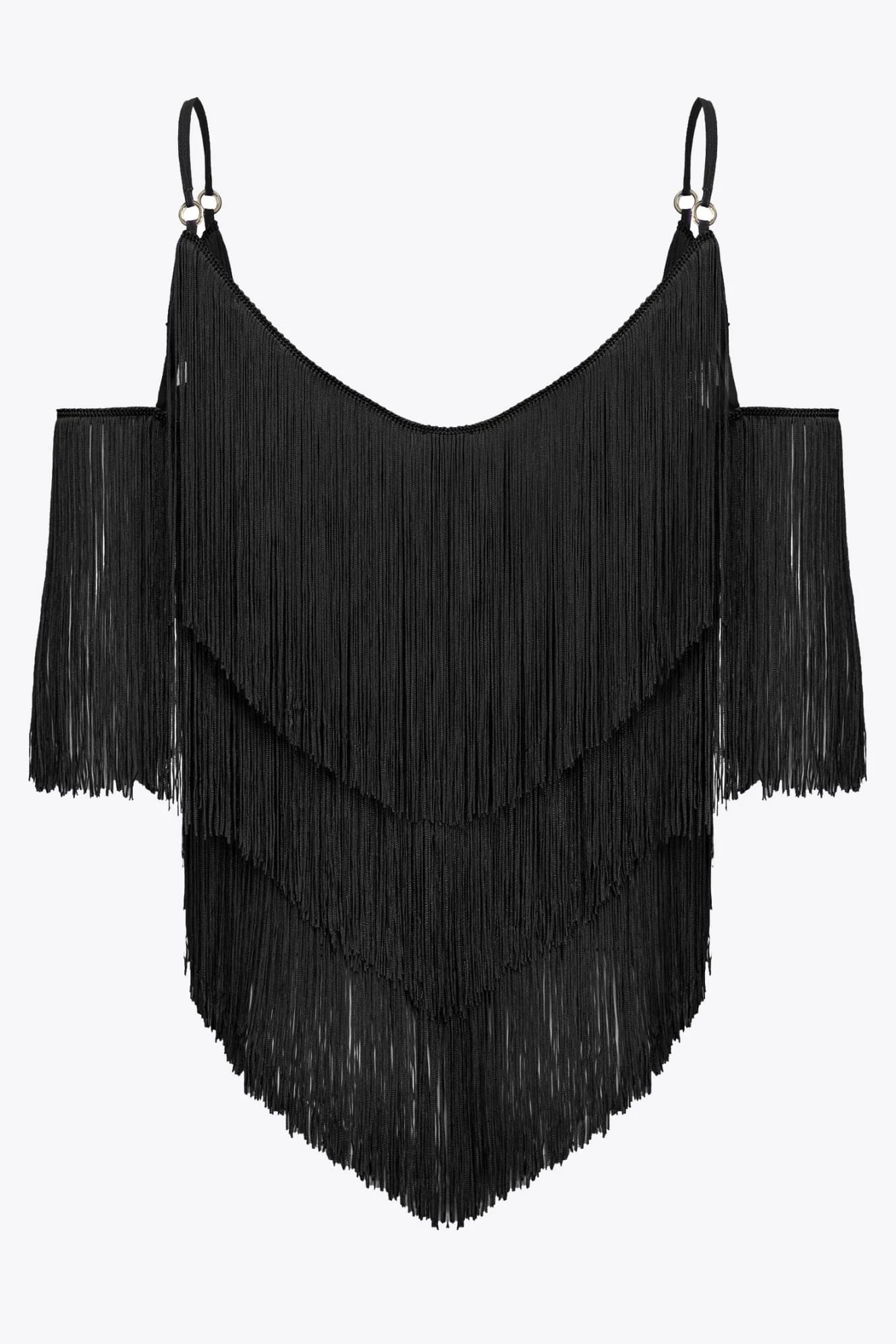 - Top bez rękawów, uszyty z krepdeszynu, z charakterystycznymi warstwami frędzli w tym samym odcieniu