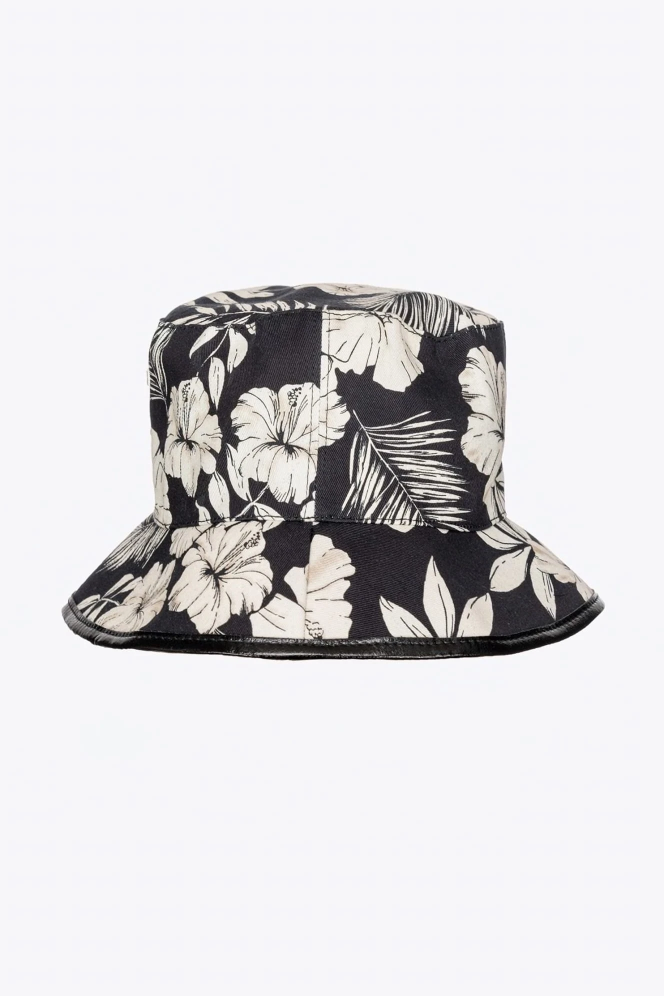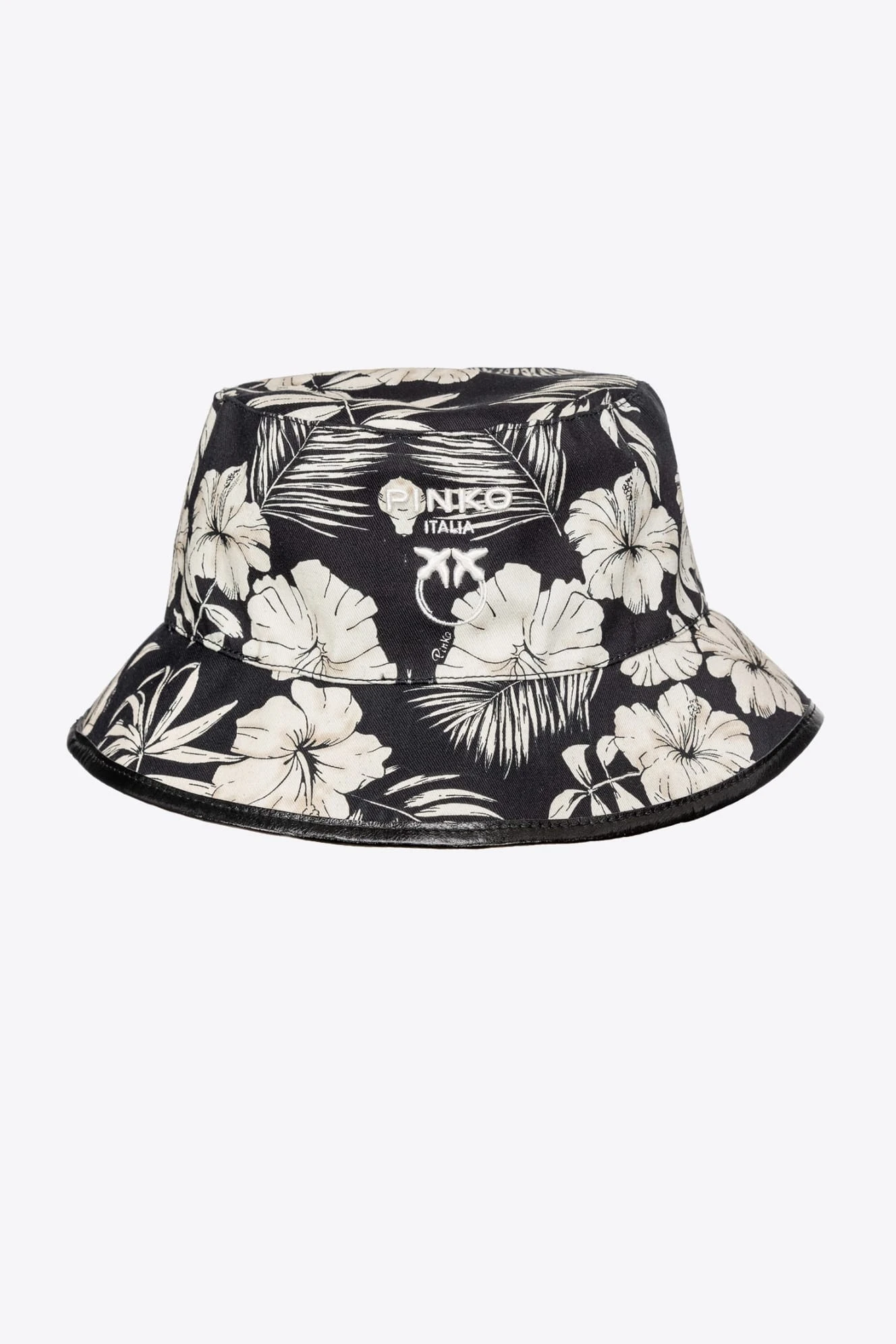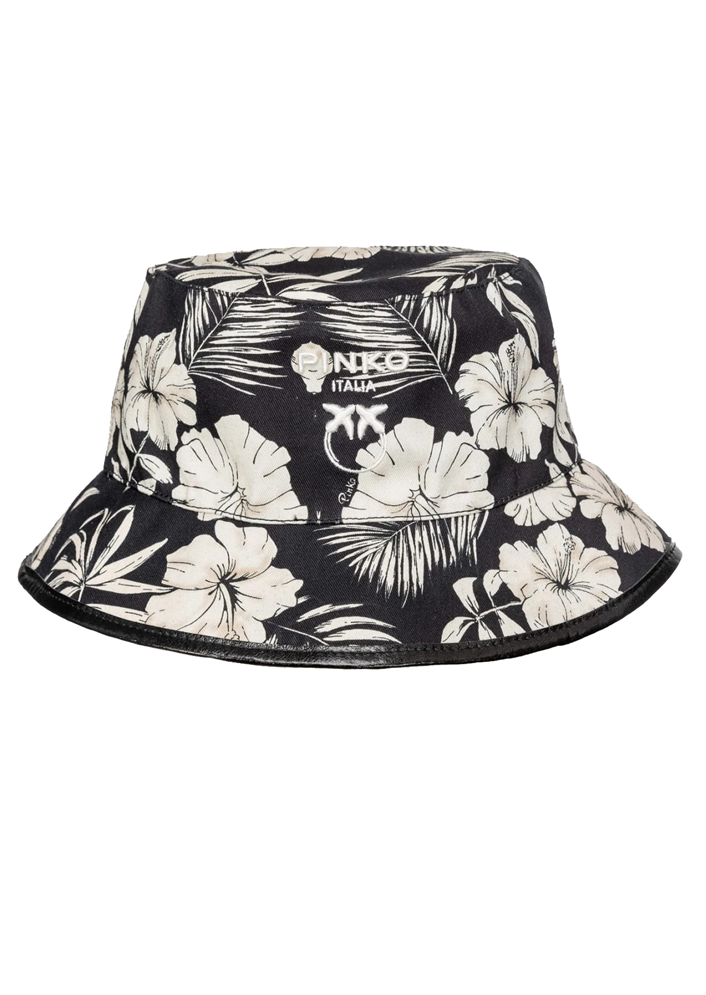 - Czapka z klamrą w rybackim stylu, uszyta z bawełnianej gabardyny, z nadrukiem graficznego kwiatu i z haftem Love Birds oraz logo PINKO z przodu