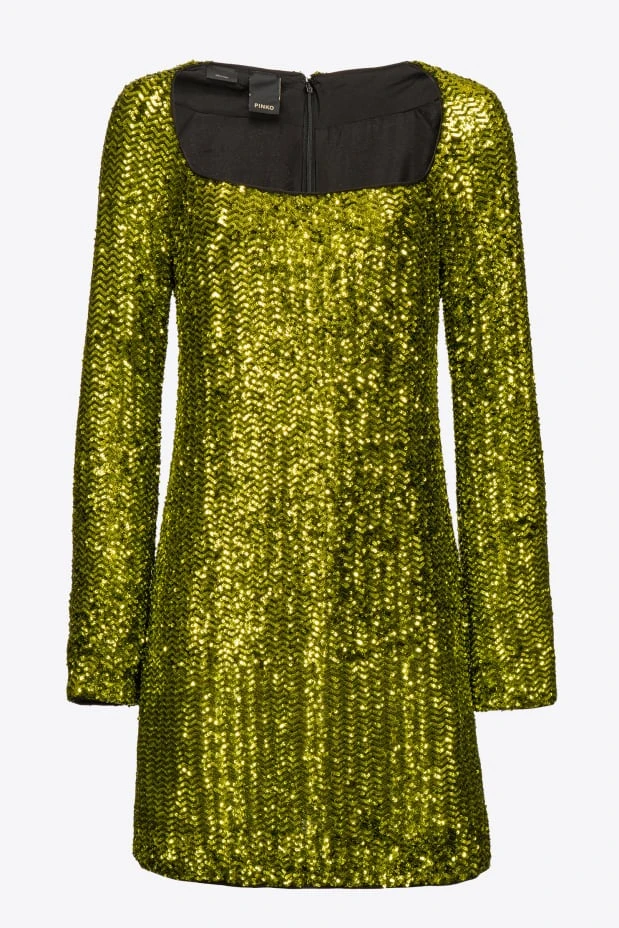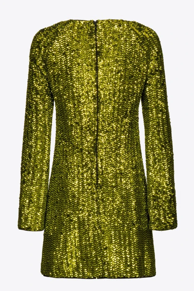 - Krótka sukienka, cała haftowana cekinami we wzór chevron