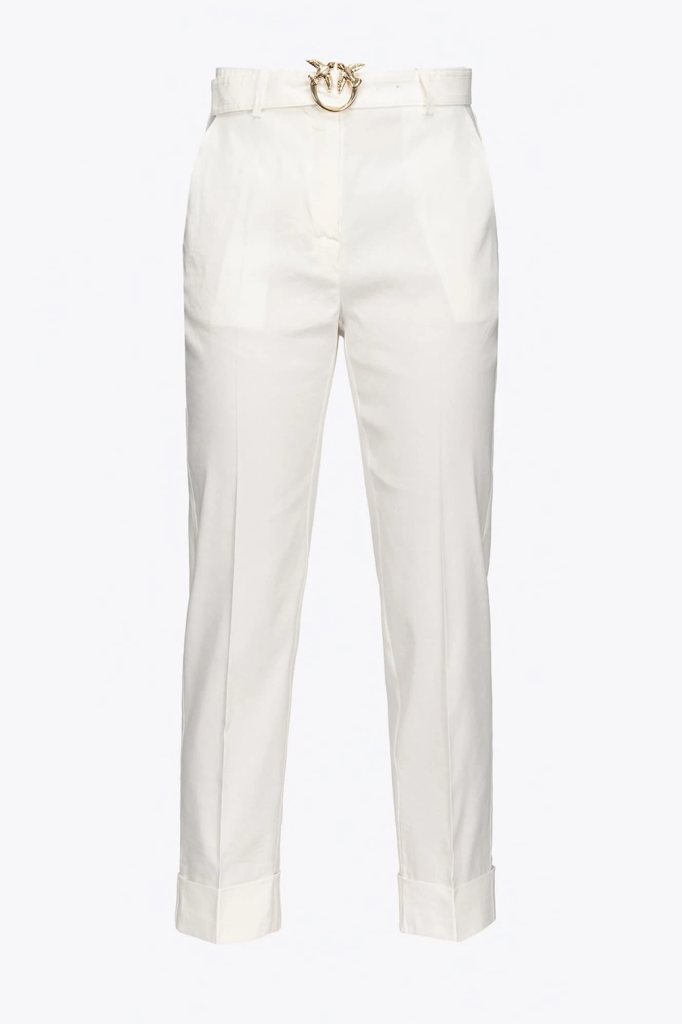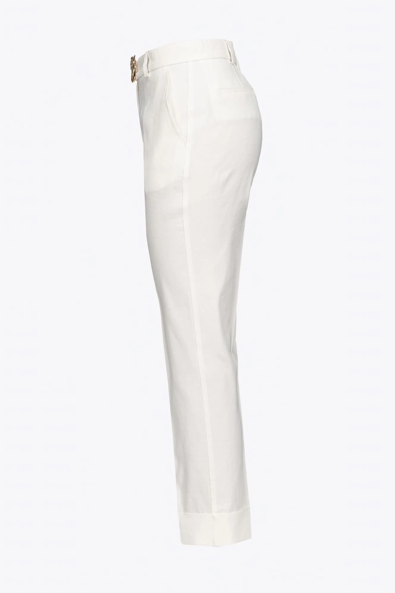 Białe spodnie z lnem Plaza marki Pinko to połączenie elegancji z nowoczesnym stylem. Wykonane z gładkiego materiału z dodatkiem stretchu, zapewniają komfort i doskonałe dopasowanie. Spodnie mają zwężane nogawki zaprasowane w kant, które nadają im schludny, formalny wygląd.