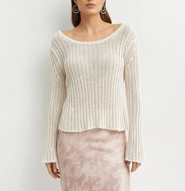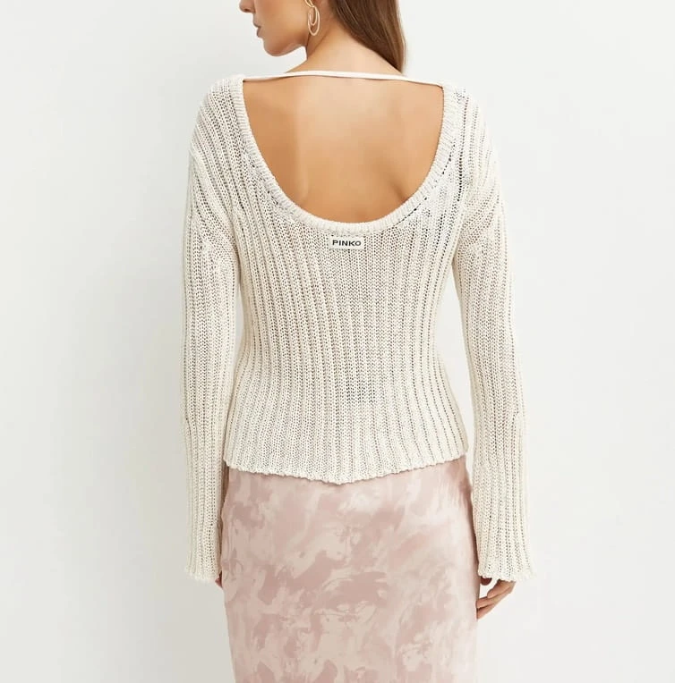 Sweter projektu marki Pinko z lekko rozszerzanymi rękawami i zaokrąglonym dekoltem. Zaskakuje efektownym tyłem z odkrytymi plecami – idealny wybór na wieczorne wyjścia i stylowe stylizacje.