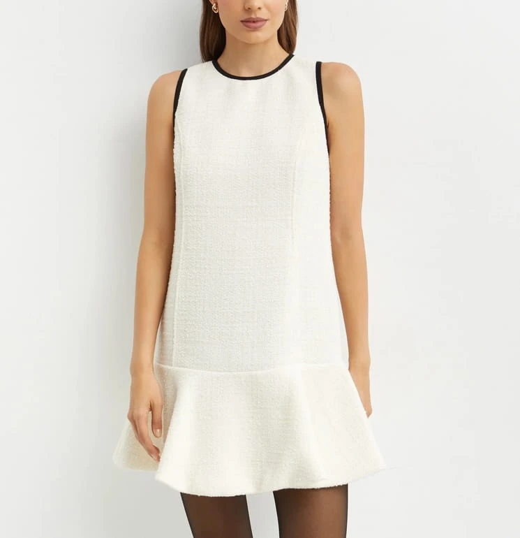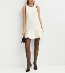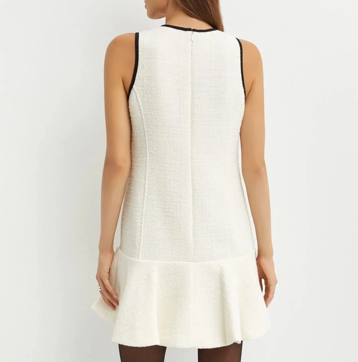 Elegancka biała sukienka Pinko wykonana z przędzy bouclé z metaliczną nicią. Model bez rękawów, z okrągłym dekoltem i falbaną na dole, zapinany na niewidoczny zamek z tyłu. Idealna sukienka Pinko na przyjęcia i uroczystości. Połączenie klasycznej formy z luksusowym wykończeniem.
