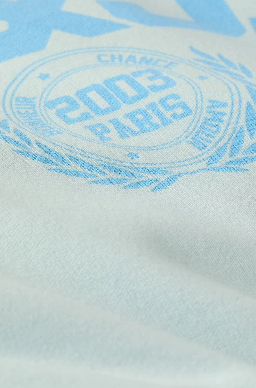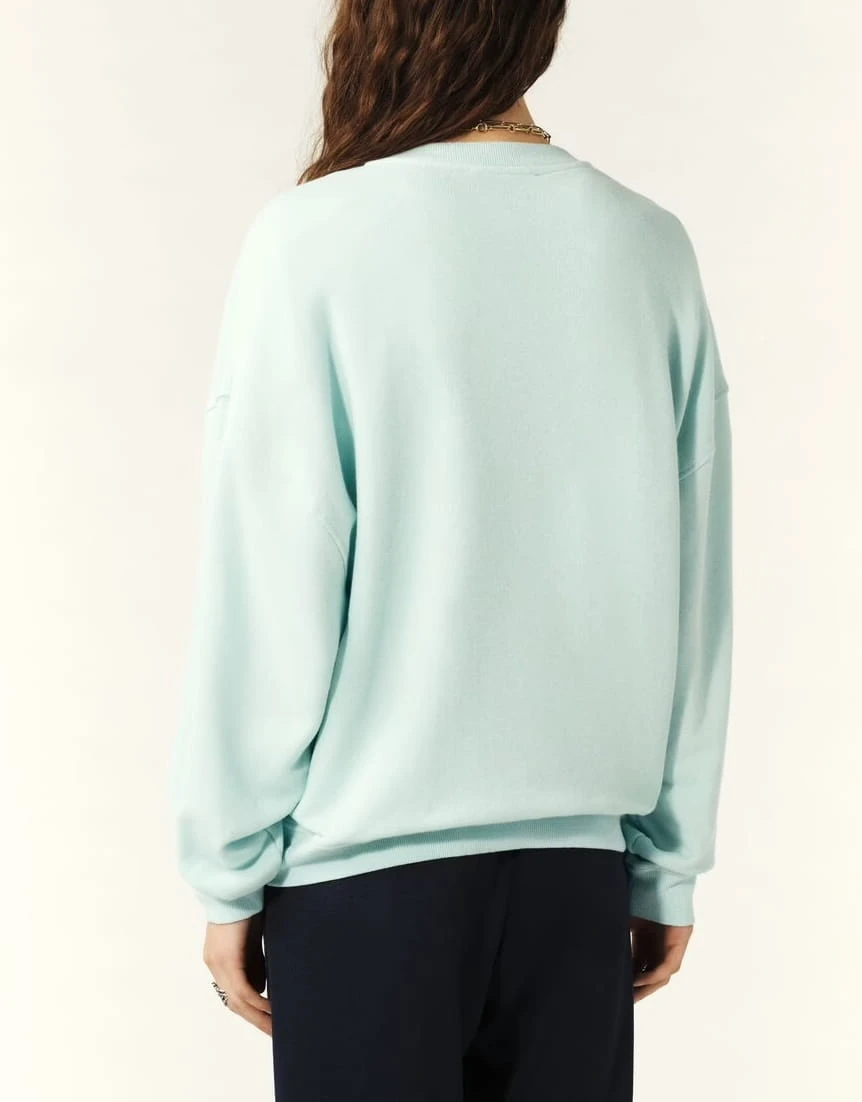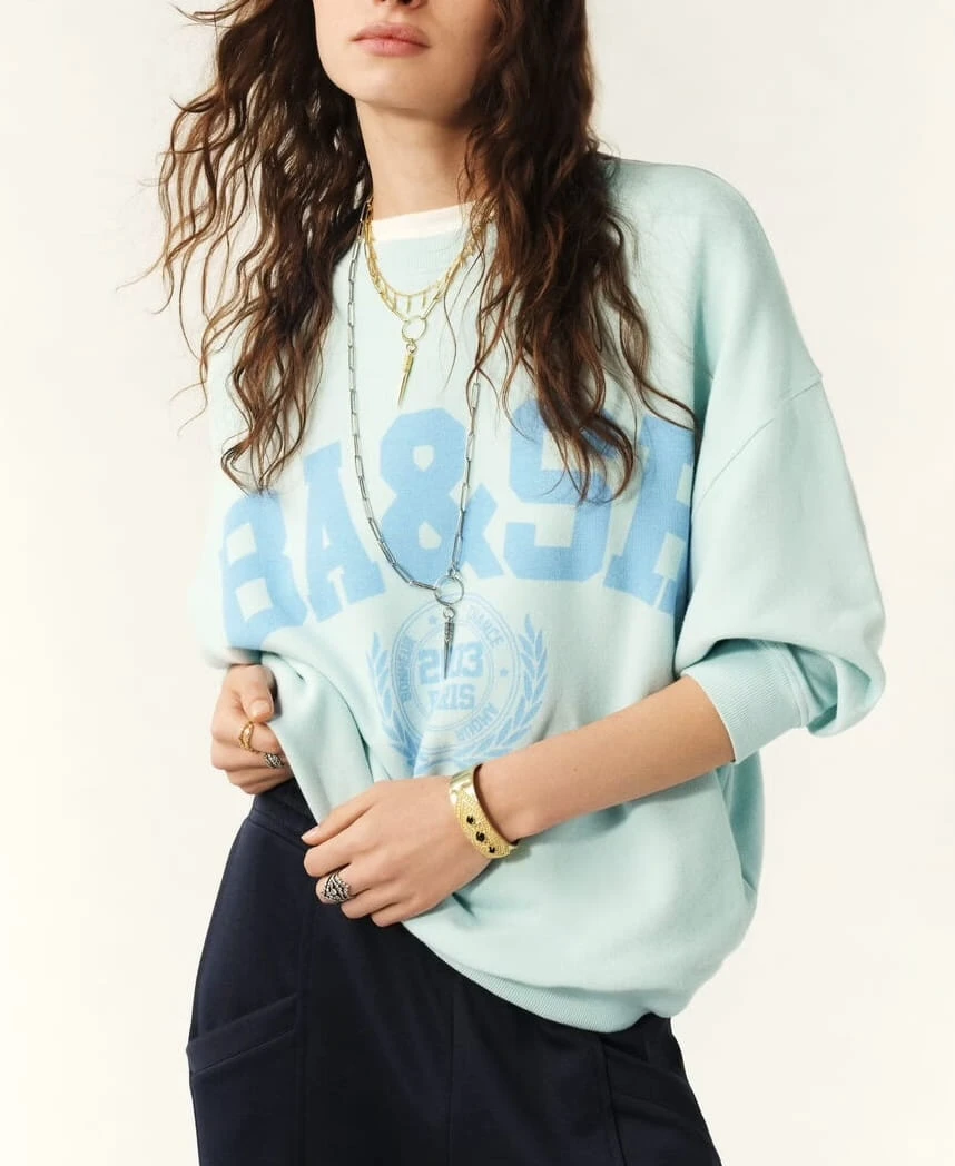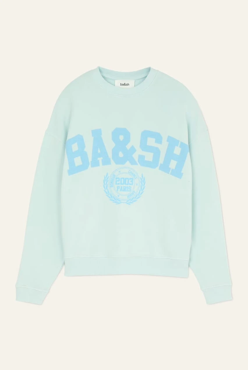Bluza ma obszerne, obniżone ramiona, długie rękawy oraz prążkowane wykończenia przy dekolcie, mankietach i u dołu. Na klatce piersiowej zdobi ją duże logo ba&sh, otoczone mantrą Happiness, Chance, Love i symbolem Paris 2003w otoczeniu laurowych liści.