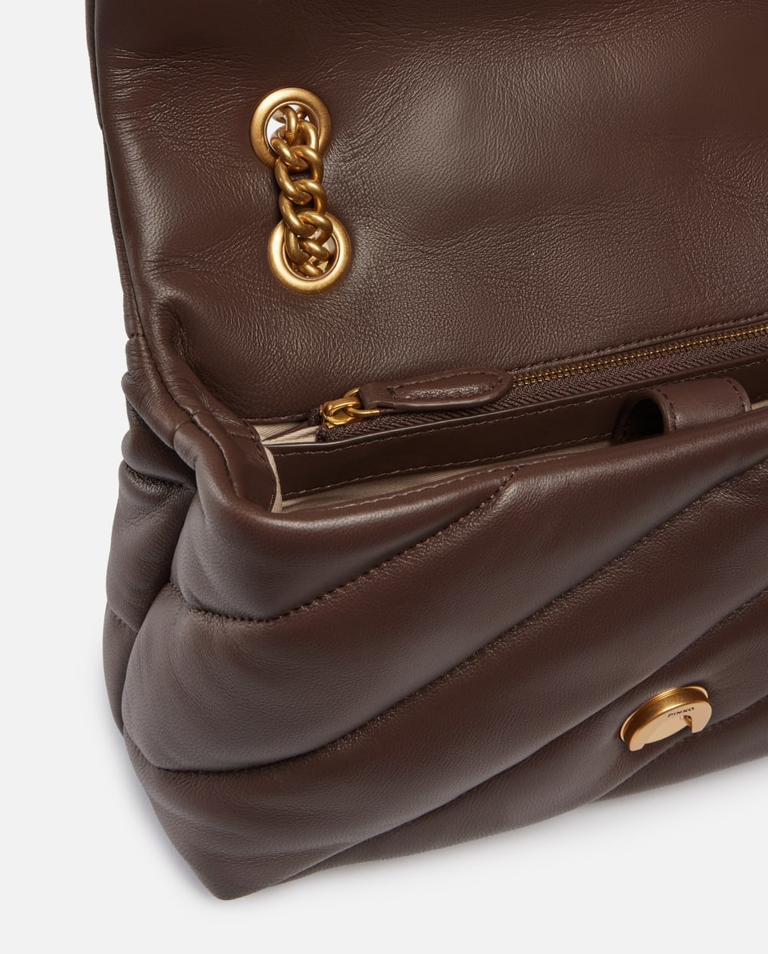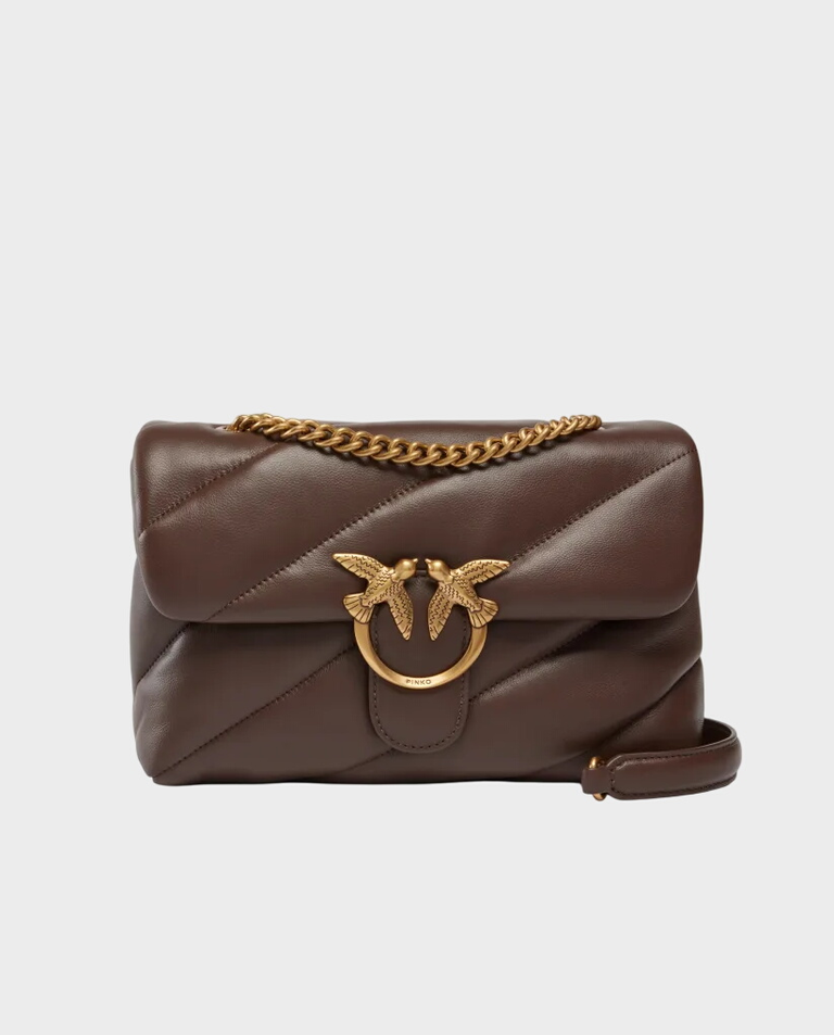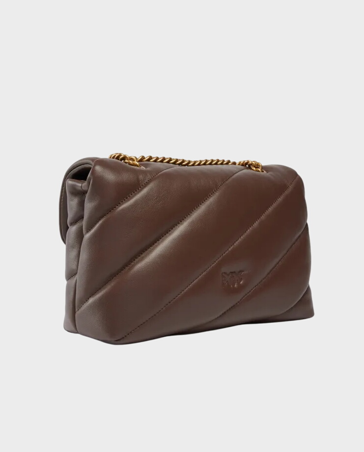 Postaw na ponadczasową elegancję z Classic Love Bag Puff Maxi Quilt marki Pinko. Torebka w odcieniu ciepłego brązu została wykonana z najwyższej jakości, miękkiej skóry nappa ozdobionej charakterystycznym skośnym pikowaniem.