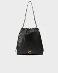 Torebka o luźnej, kwadratowej formie i maksymalnym rozmiarze, wykonana z cienkiej, gładkiej skóry w klasycznym czarnym kolorze. Subtelnie połyskująca powierzchnia podkreśla jej nowoczesny charakter. Zamykana za pomocą wszytego sznurka, który pozwala na regulację kształtu i pojemności. Całość dopełnia widoczne logo marki Pinko, dodające torebce rozpoznawalnego stylu.