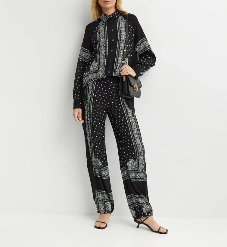 Czarna koszula marki PINKO to wyrazisty model ozdobiony wzorem bandany, który dodaje jej charakteru i luzu. Asymetryczny, wydłużony tył wprowadza nowoczesny akcent i efektowny ruch przy każdym kroku.
