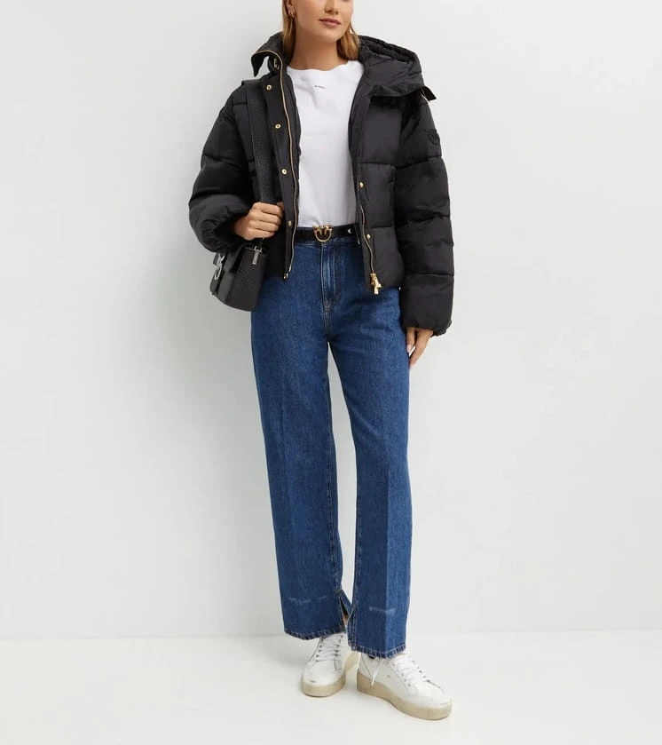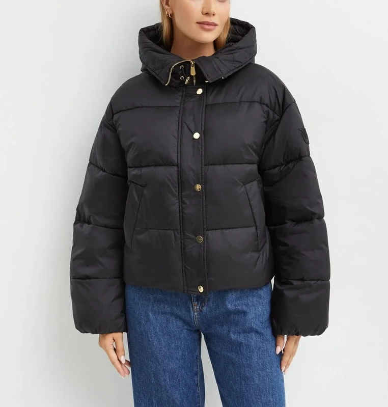 Krótka kurtka projektu włoskiej marki Pinko w czarnym kolorze. Model wyposażony w duży, otulający kaptur, zapinany na eleganckie metalowe zatrzaski, łączy wygodę z nowoczesnym fasonem. Modowa propozycja do miejskich stylizacji w chłodniejsze dni. Poczujesz się jak na wybiegu w Mediolanie!