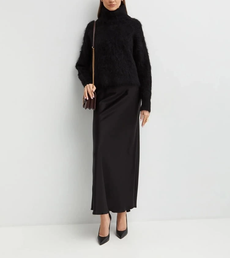 W kolorze czarnym, wykonana z połyskującej satyny, pięknie płynnie układa się na ciele.