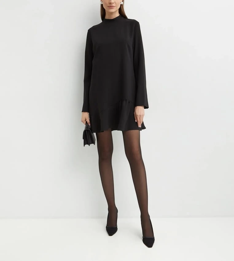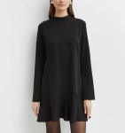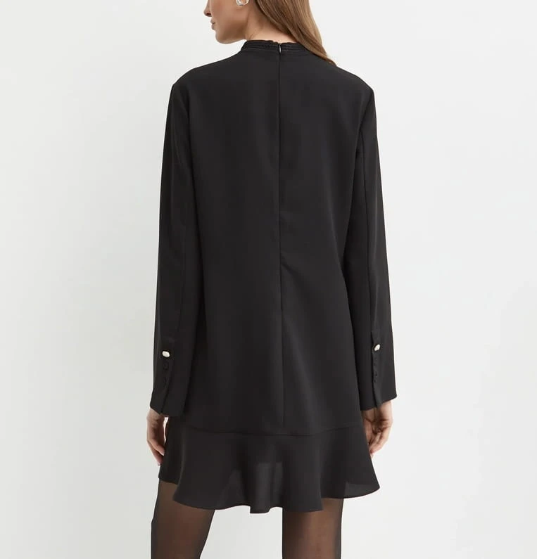 Czarna sukienka włoskiej marki Pinko o długości mini, z długimi rękawami i lekko uniesionym dekoltem. Model zdobi ozdobna falbana oraz efektowne rozcięcie. Elegancka i kobieca, wyprodukowana we Włoszech.