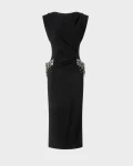 Posiada dekolt w kształcie łódki, krótkie rękawy oraz kryty zamek na plecach, a długość midi nadaje całości ponadczasowego, szykownego charakteru – idealnego na wyjątkowe okazje.