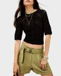 Czarny sweter Philo marki BA&SH to połączenie prostoty i subtelnej kobiecości. Wykonany z delikatnej dzianiny pointelle, zachwyca ażurowym wykończeniem i lekką fakturą. Model o prostym kroju, z okrągłym dekoltem i krótszymi rękawami, idealnie sprawdzi się zarówno w codziennych, jak i bardziej eleganckich stylizacjach.