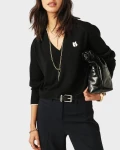 Sweter marki BA&SH w kolorze czarnym, wykończony kontrastową białą lamówką. Model z dekoltem w kształcie litery C i ozdobnym logo na przodzie, łączy elegancję z nowoczesnym, casualowym stylem.