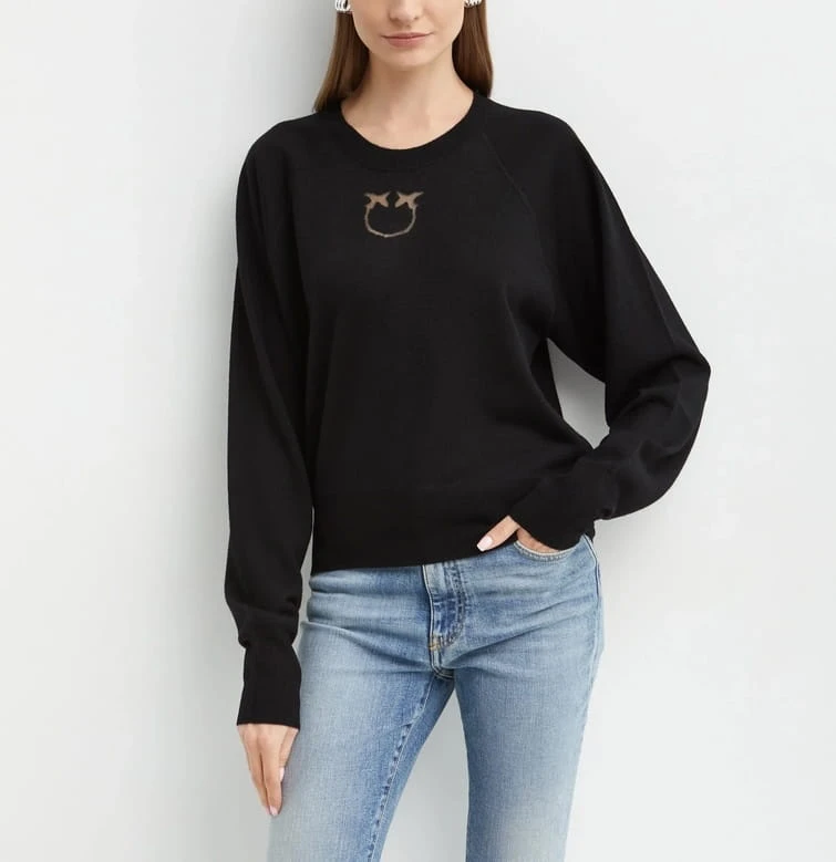 Sweter Lanzarote marki Pinko w kolorze czarnym, wykonany z miękkiej mieszanki wełny. Zdobiony charakterystycznym logo Love Birds na przodzie. Wyprodukowany we Włoszech, łączy komfort z elegancją w codziennym wydaniu.
