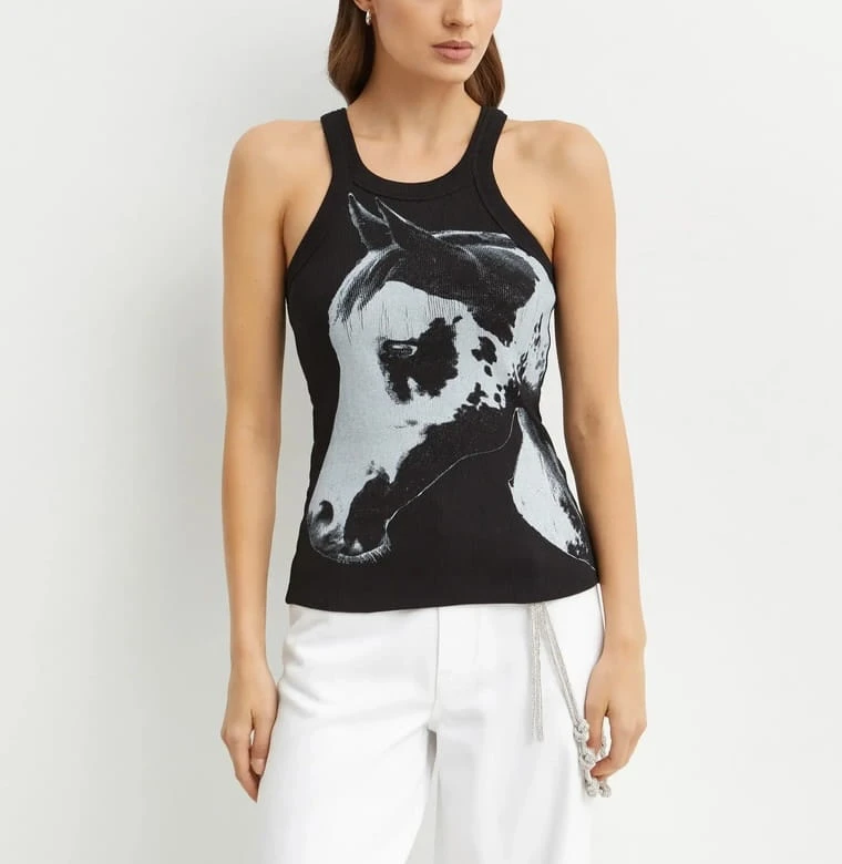 - Nazwa: Czarny top z nadrukiem konia Reimagine PINKO X Patrick McDowell