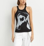 Czarny top marki PINKO z wyjątkowej kolekcji Reimagine PINKO X Patrick McDowell to połączenie modowego charakteru i świadomego podejścia do designu. Model wyróżnia się ozdobnym nadrukiem na przodzie, który nadaje mu unikalnego wyrazu.