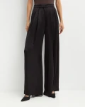 Czarne spodnie projektu marki Pinko wykonane z eleganckiej, błyszczącej satyny. Model z szerokimi nogawkami i podwójnymi zaszewkami, które podkreślają nowoczesny krój. Z tyłu znajdują się praktyczne kieszenie, dodające całości funkcjonalności i klasy.