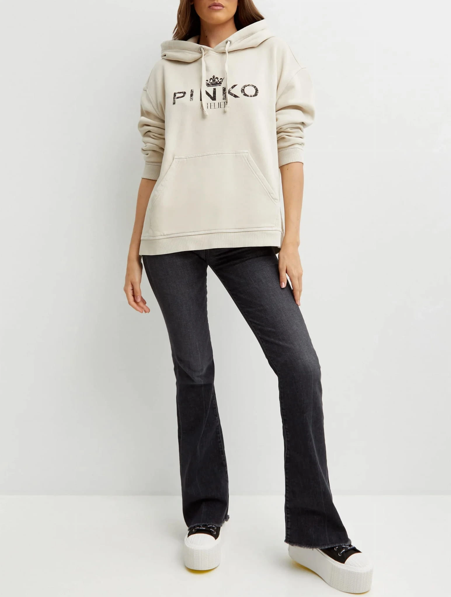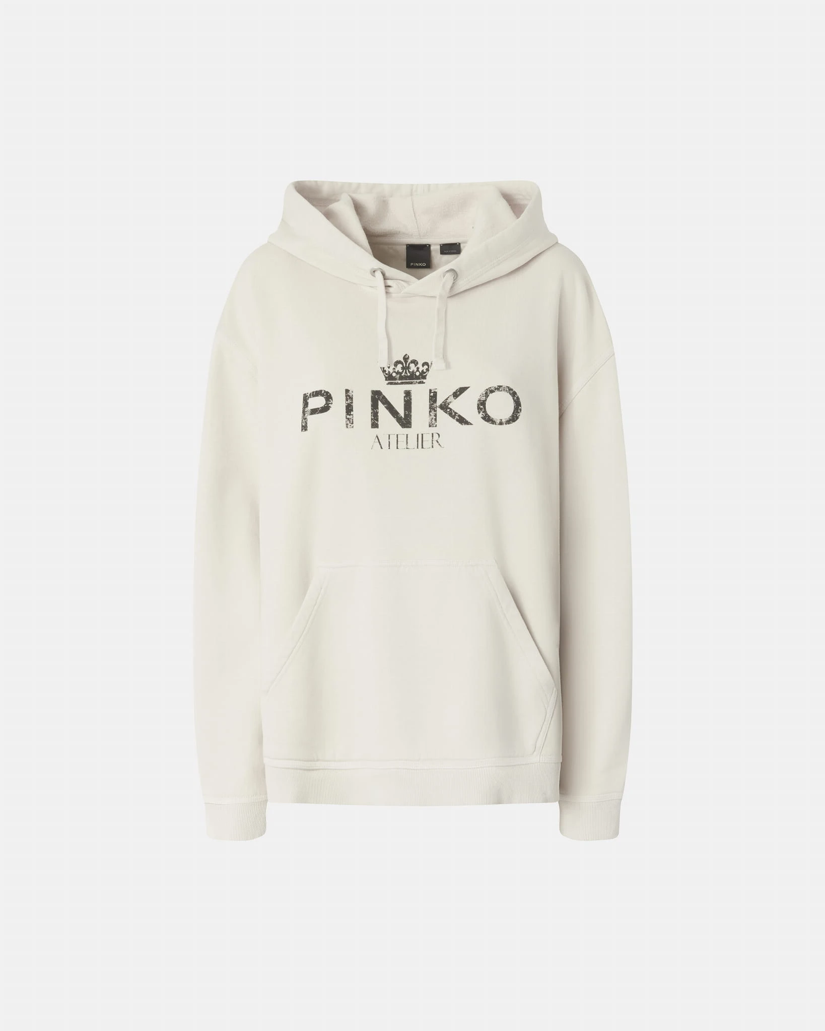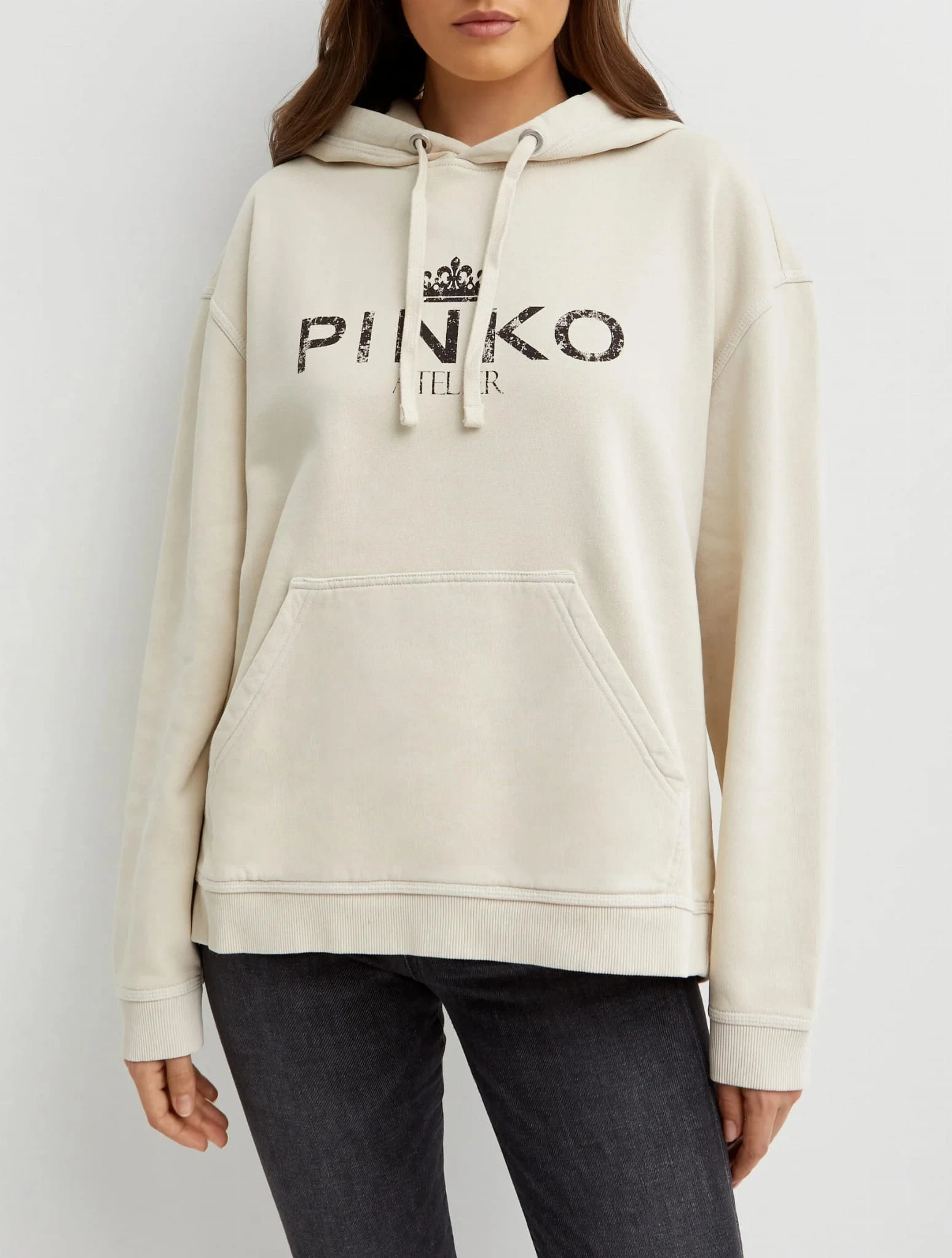 Bluza marki PINKO z kapturem w subtelnym kremowym odcieniu – doskonała propozycja dla miłośniczek komfortu i elegancji. Lekko oversize’owy krój zapewnia wygodę i swobodę, a nadruk "PINKO Atelier" na przodzie dodaje jej wyjątkowego charakteru. Wykonana z wysokogatunkowej bawełny, co gwarantuje miękkość i przyjemność noszenia. Idealna do codziennych stylizacji, które łączą casualowy luz z nutą luksusu. Must-have na każdą porę roku!