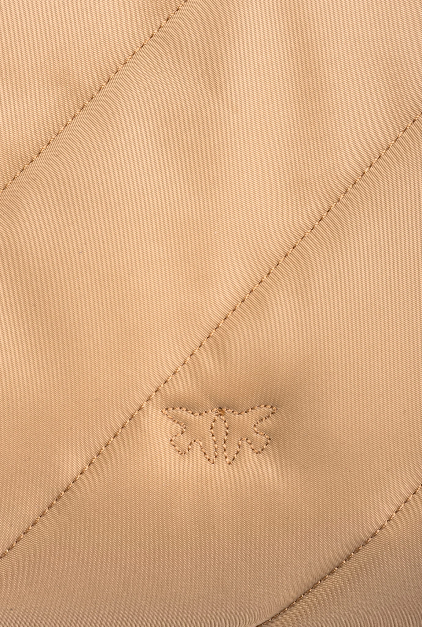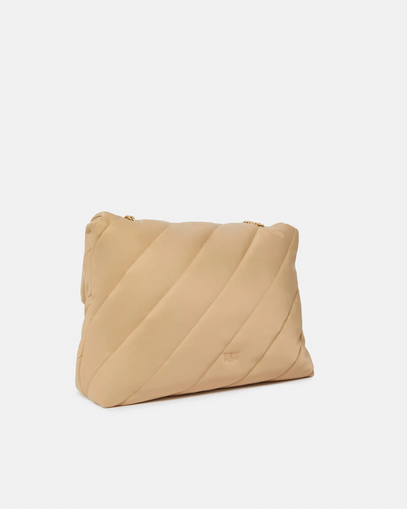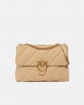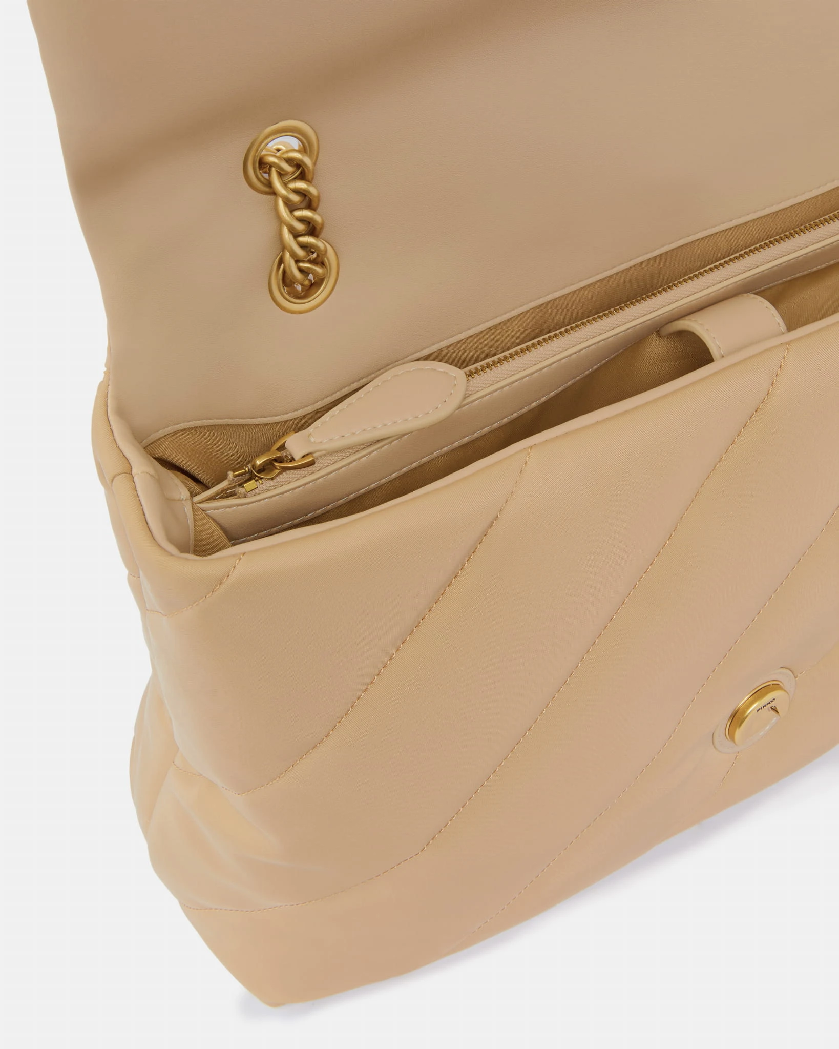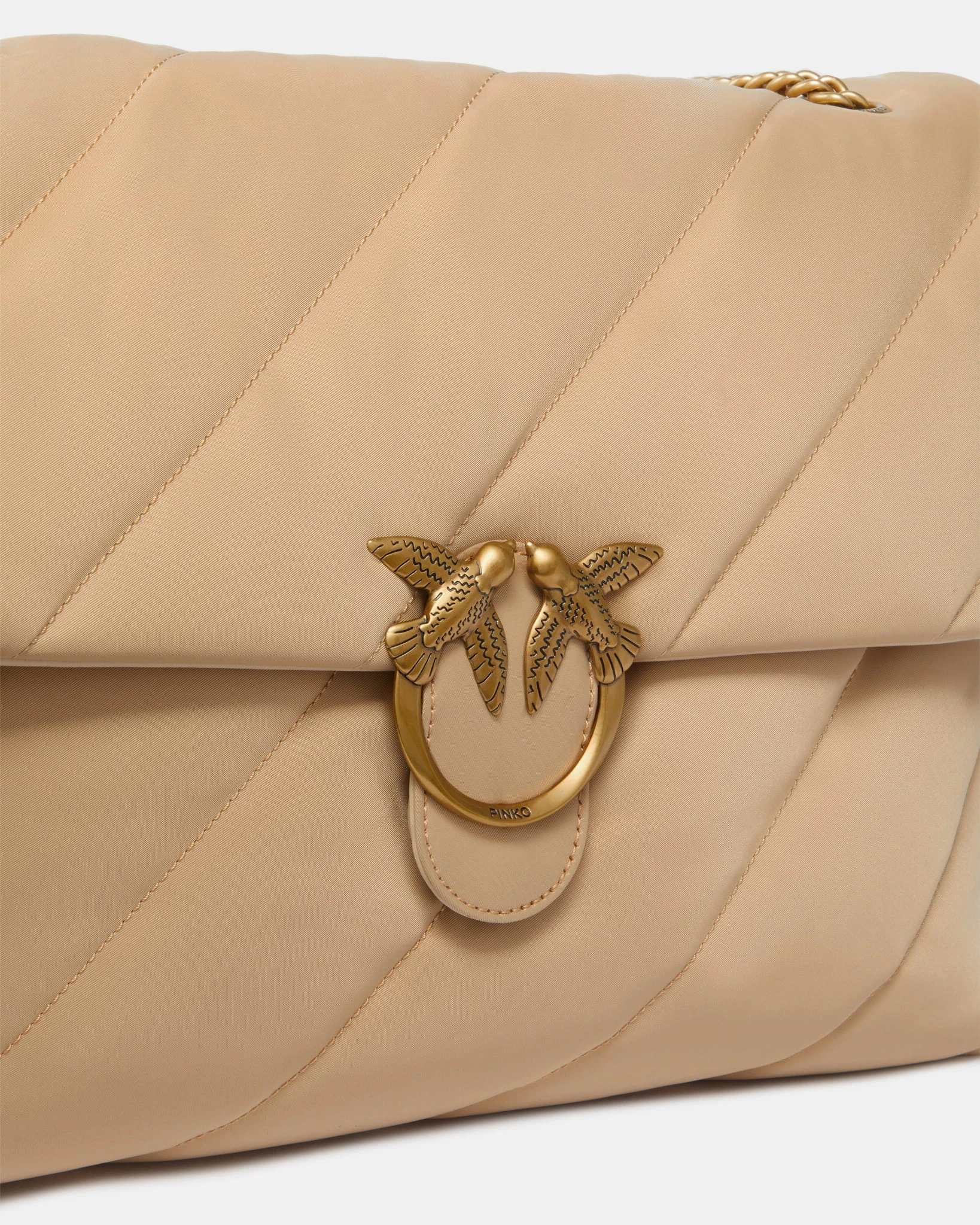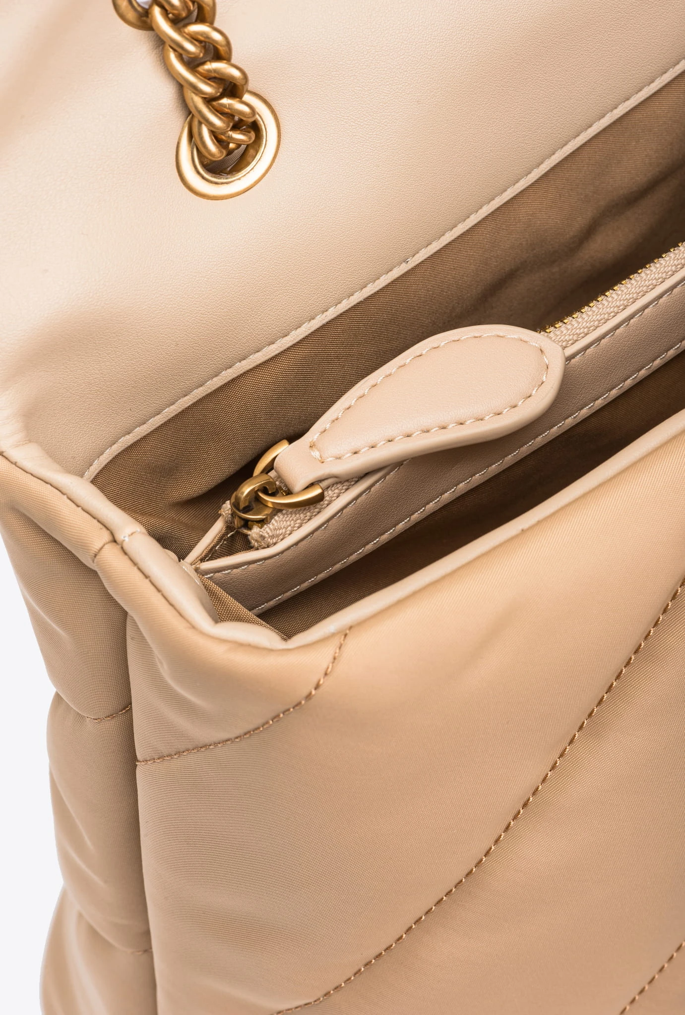 Torebka marki Pinko, model Love Puff Extra w kolorze beżowym. Zapięcie z klapką oraz klamra Love Birds Diamond Cut w kolorze starego złota, która dodaje jej elegancji. Posiada wygodną kieszonkę na zamek oraz pasek na ramię w postaci metalowego łańcuszka. Wykonana ze skośnie pikowanej tkaniny z włókien pochodzących z recyklingu, a wnętrze wykończone poliestrowo-bawełnianą podszewką z recyklingu. Idealna propozycja łącząca styl z dbałością o środowisko.