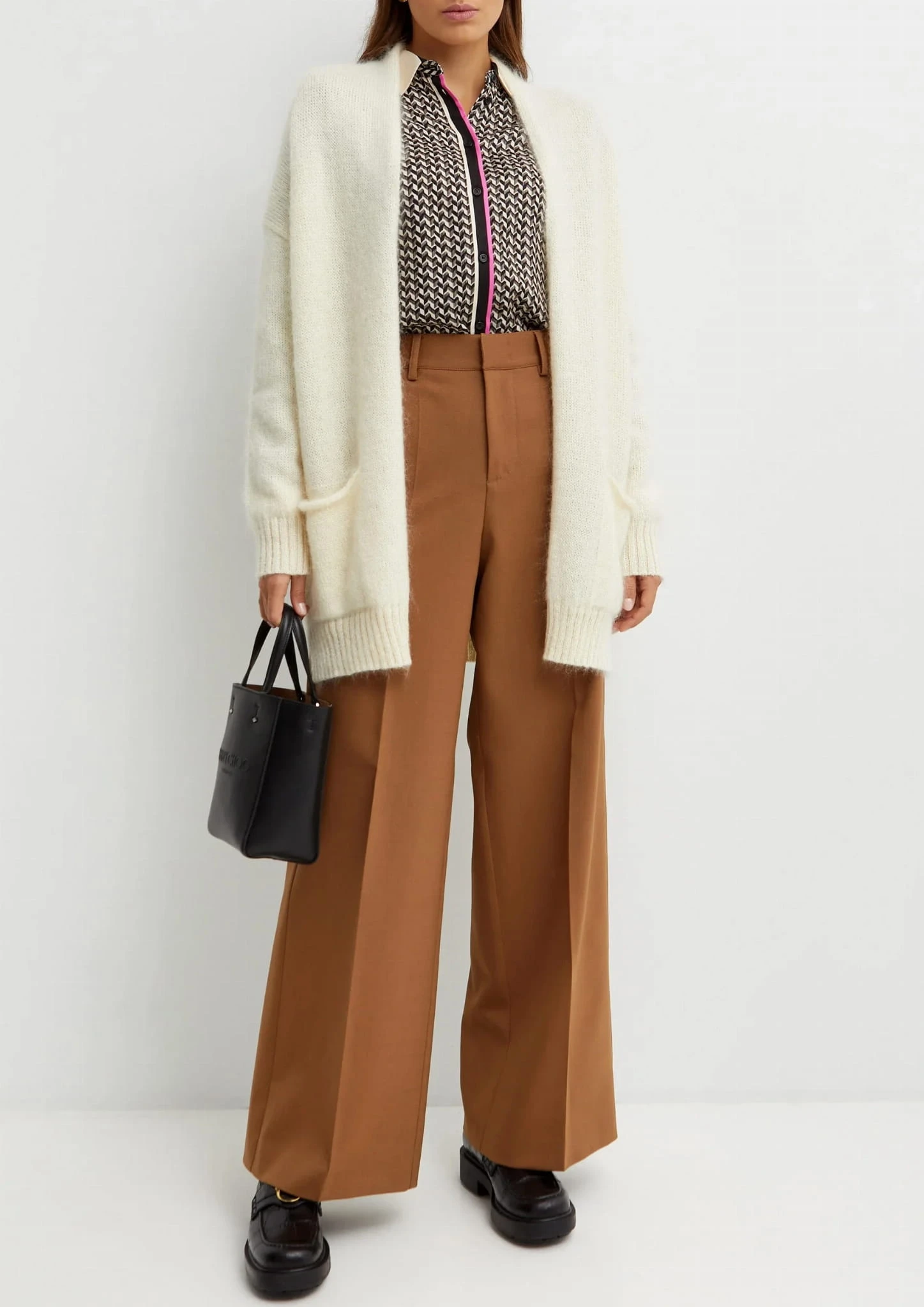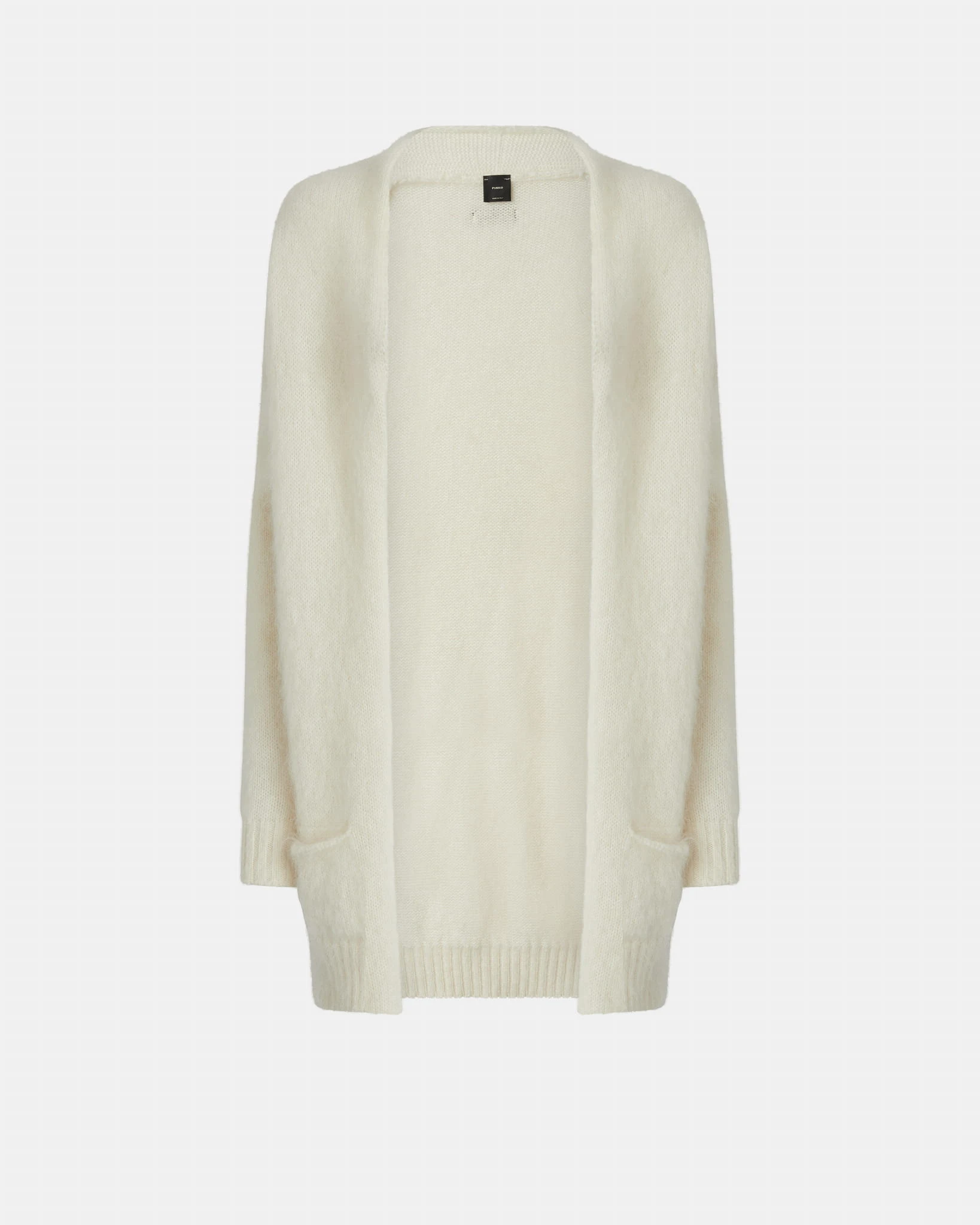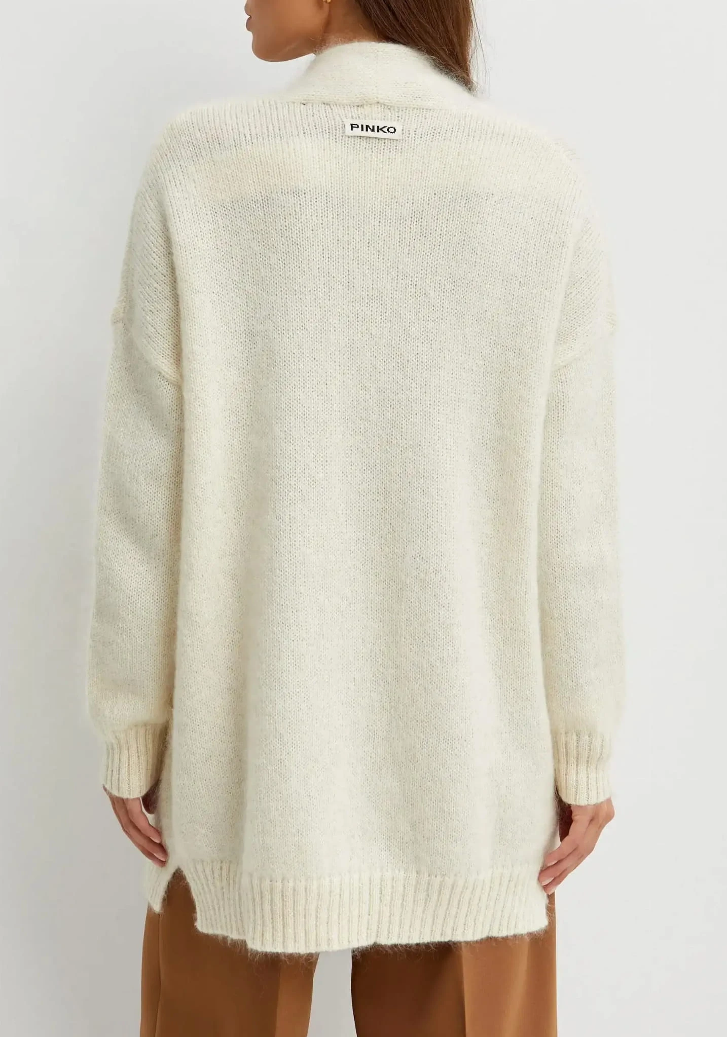 Kremowy kardigan marki Pinko to elegancka i komfortowa propozycja, która doskonale sprawdzi się w chłodniejsze dni. Ma otwarty fason bez zapięcia, co nadaje mu swobodny, casualowy charakter. Kieszenie z przodu dodają praktyczności i stylowego akcentu. Długość do połowy ud sprawia, że kardigan jest wygodny i idealny do noszenia z różnymi typami odzieży, od spodni po sukienki. Wykonany z miękkiej mieszanki kaszmiru, bawełny i moheru, zapewnia ciepło i komfort, jednocześnie zachowując lekkość i przyjemność w dotyku. To doskonały wybór dla osób ceniących wysoką jakość i subtelną elegancję.