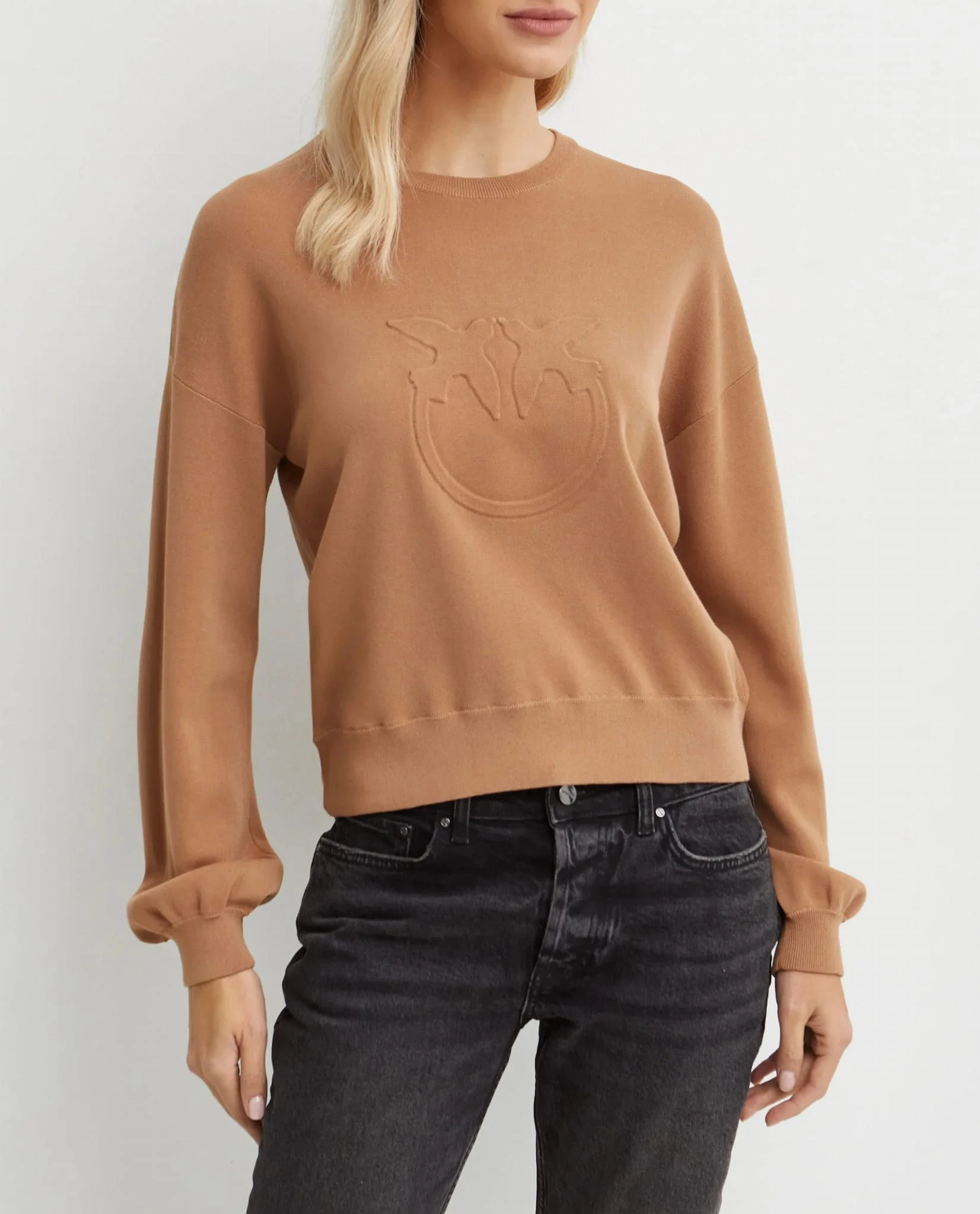 Bluza projektu marki Pinko w kolorze brązowym to stylowy i wygodny wybór, który łączy elegancję z casualowym akcentem. Ozdobne logo na przodzie przyciąga uwagę, nadając bluzie charakterystyczny, modny wygląd. Rozszerzane rękawy dodają jej nowoczesności i wyjątkowego stylu, a brzegi wykończone prążkowanym ściągaczem zapewniają odpowiednią strukturę i komfort. To idealna propozycja do codziennych stylizacji, łącząca wygodę z modnym designem.