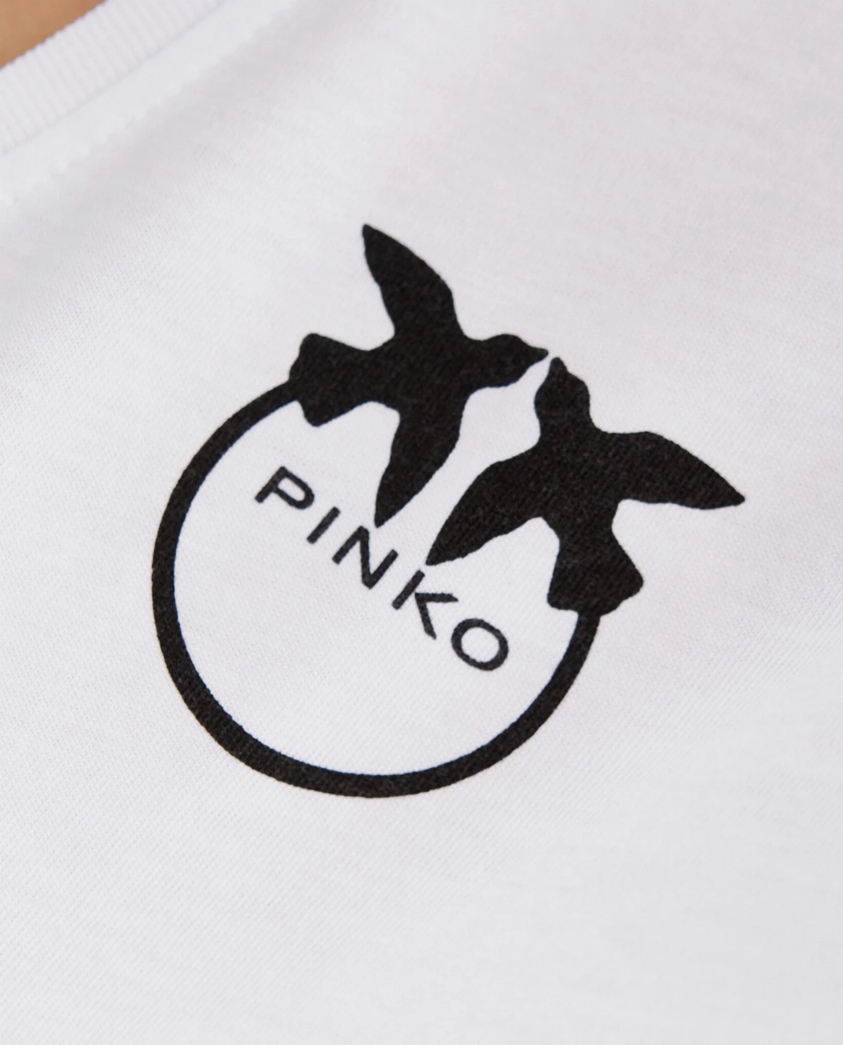 Na przodzie, po stronie serca, znajdziesz małe logo Love Birds - symbolu Pinko, który dodaje tej koszulce niepowtarzalnego uroku. To subtelne, ale znaczące wykończenie, które sprawia, że każde noszenie staje się wyjątkowe.