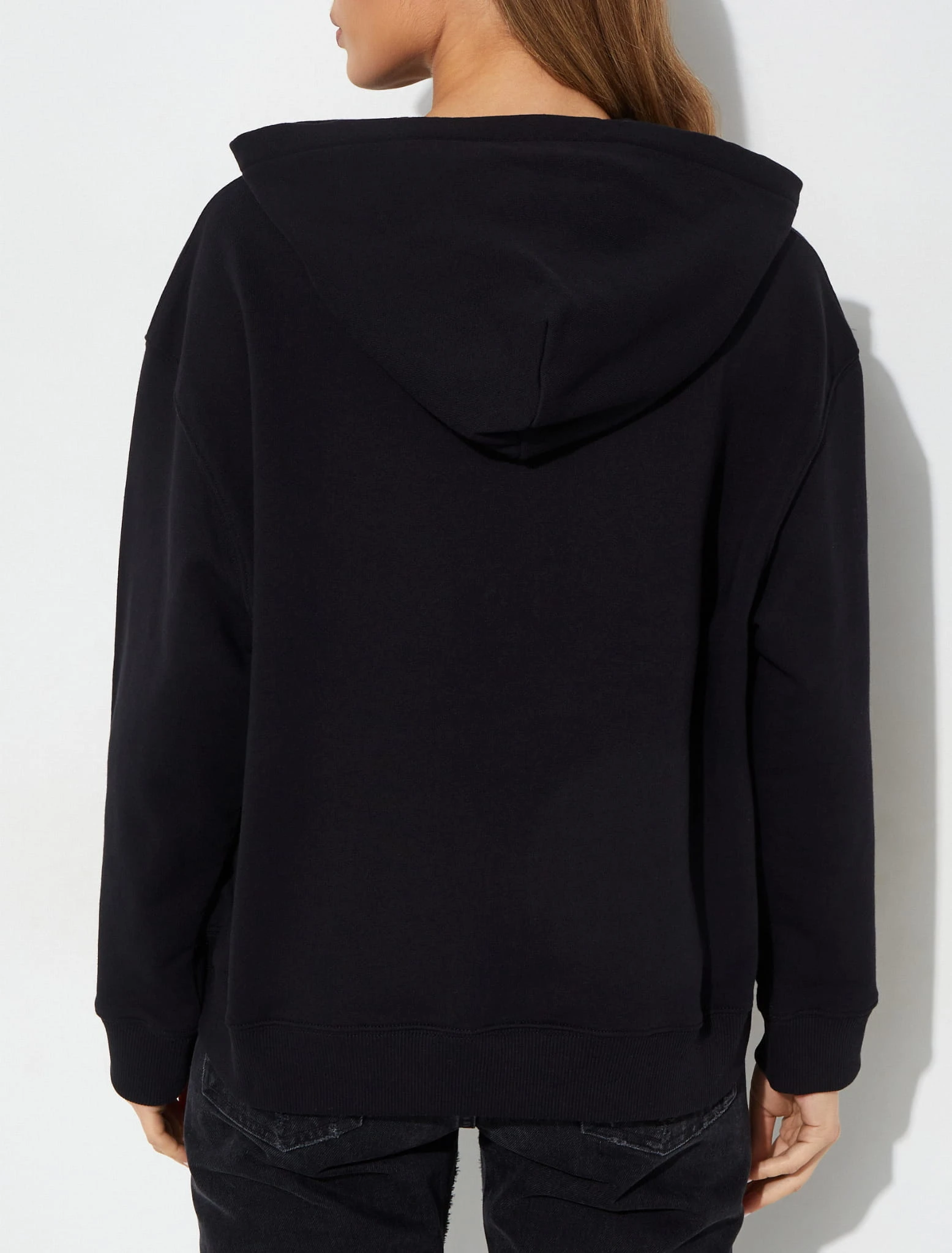 Czarna bluza z kapturem Sisma od Pinko to połączenie luksusu i wygody. Wykonana z wysokiej jakości bawełny, gwarantuje komfort noszenia przez cały dzień. Luźny krój zapewnia swobodę ruchów, a subtelny nadruk z logo i napisem na przodzie dodaje jej modowego charakteru. Kaptur bez ściągacza to nowoczesny detal, który nadaje bluzie oryginalnego wyglądu. Idealna do codziennych, casualowych stylizacji z nutą elegancji. Must-have w każdej garderobie!