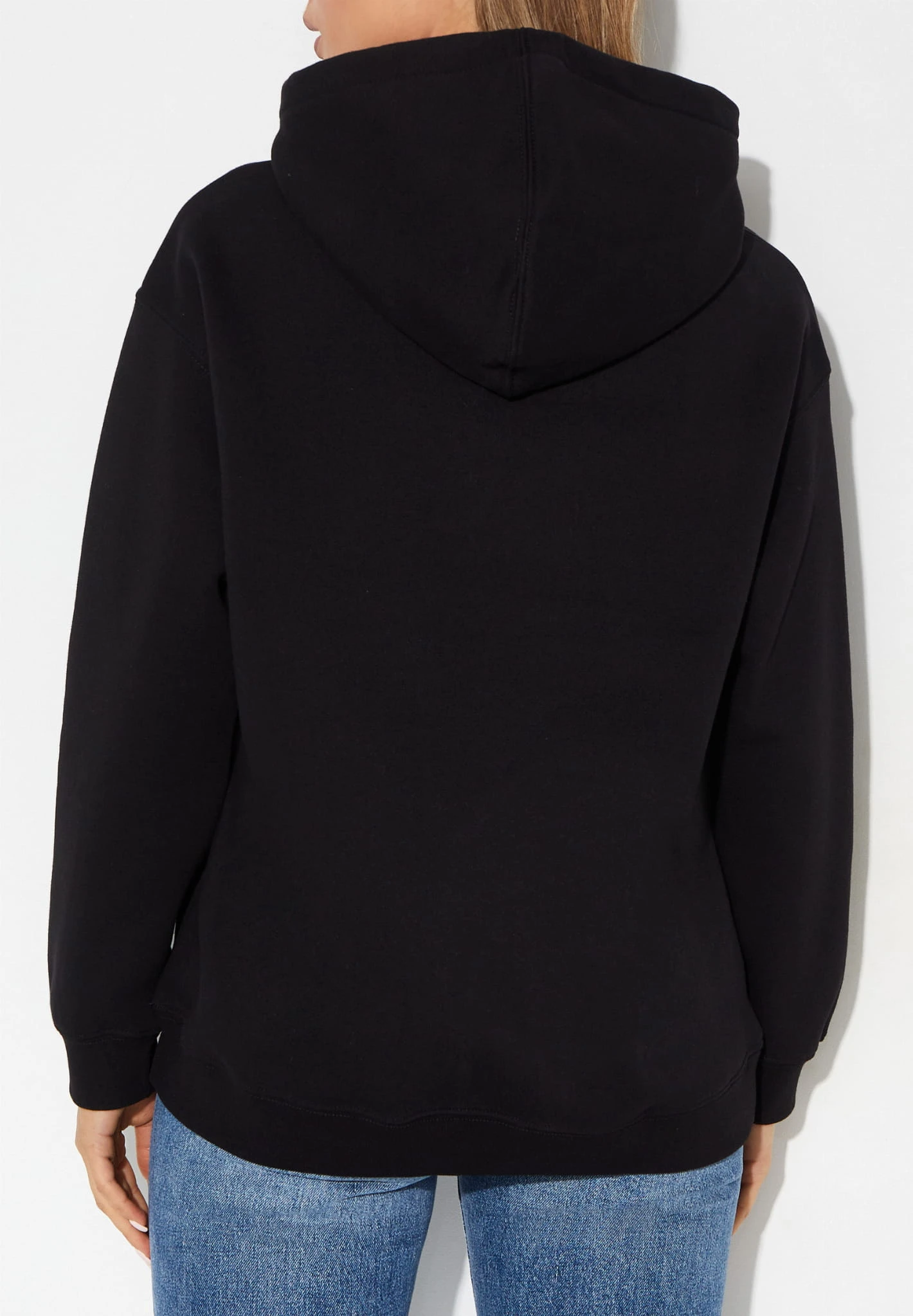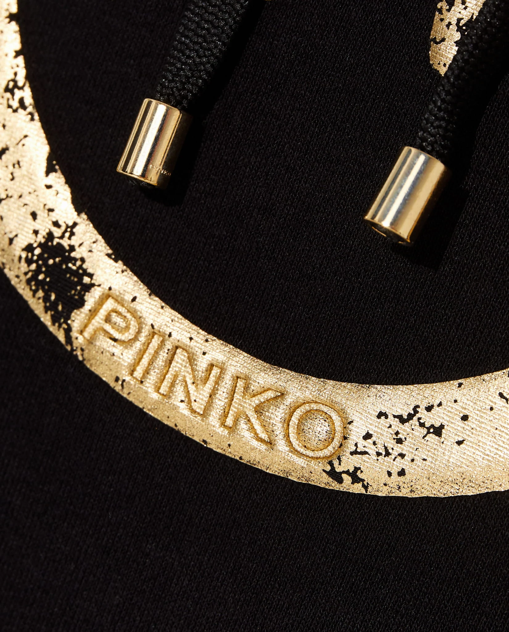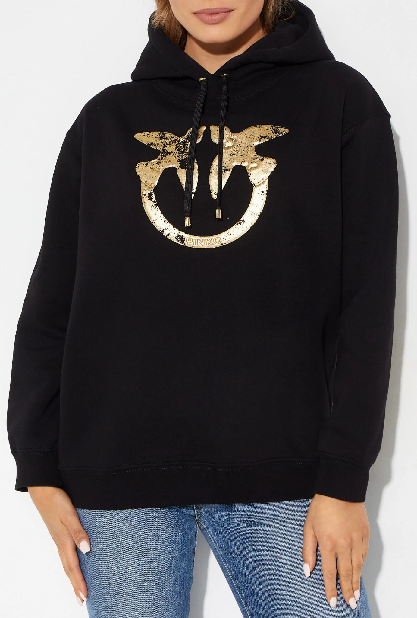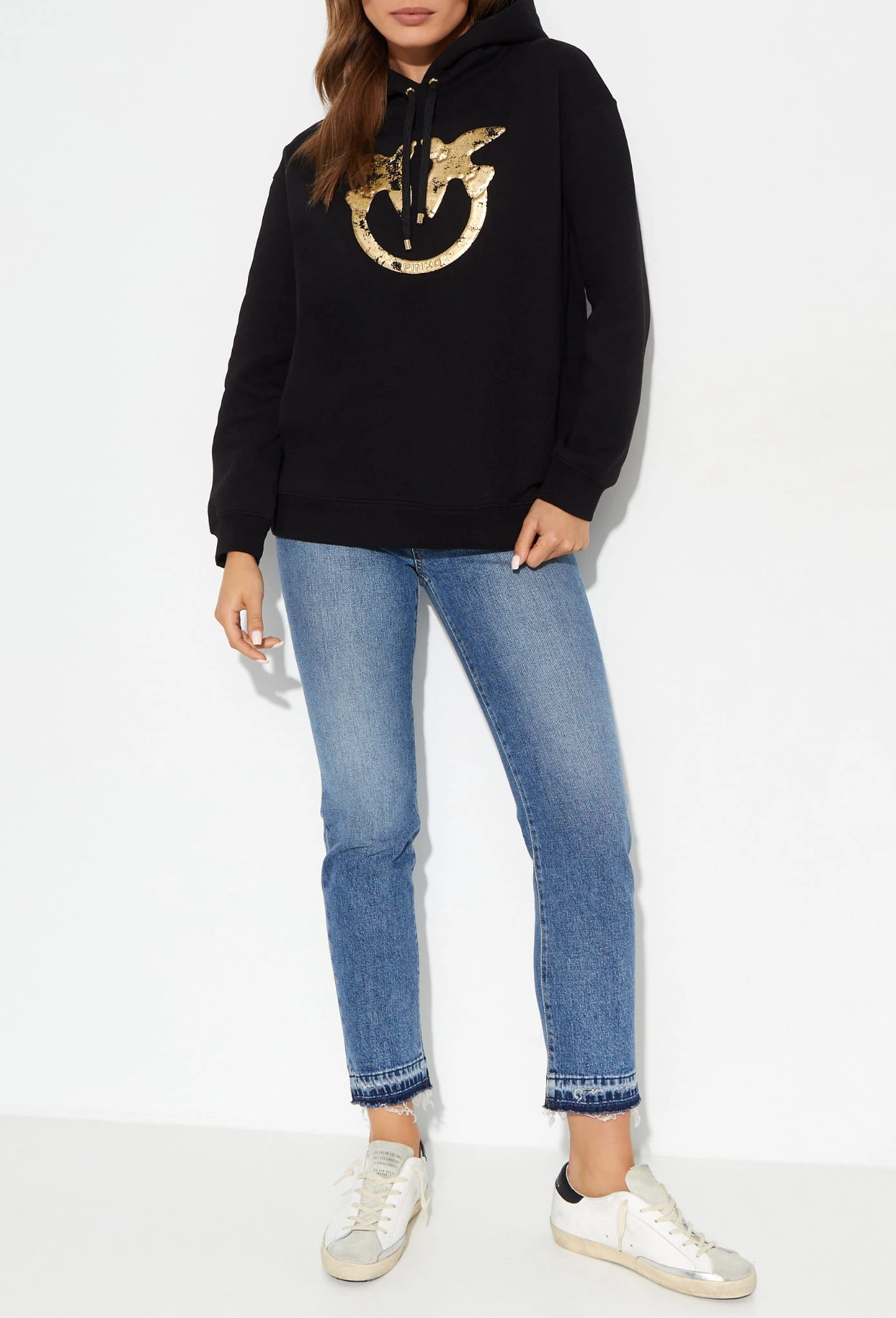 Czarna bluzka Skype projektu marki Pinko to połączenie mody i komfortu w jednym. Wykonana z miękkiego bawełnianego materiału, zapewnia wygodę na co dzień. Oversize'owy fason i kaptur dodają jej luźnego, casualowego charakteru, idealnego do tworzenia miejskich stylizacji. Z przodu znajduje się efektowny nadruk z logo *Love Birds* w złotym kolorze, który nadaje bluzce wyjątkowego blasku. To must-have dla fanek luksusowego, ale swobodnego looku.