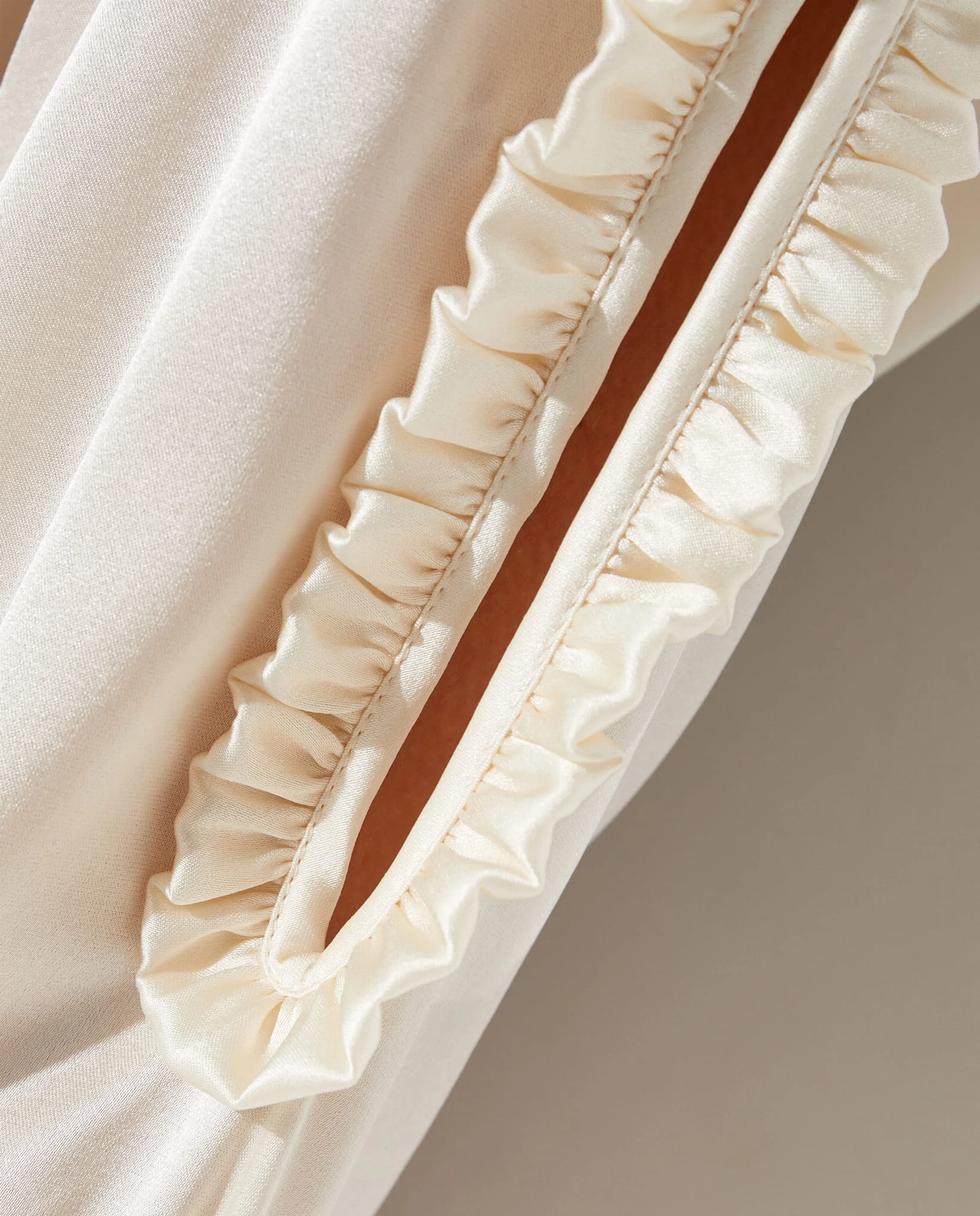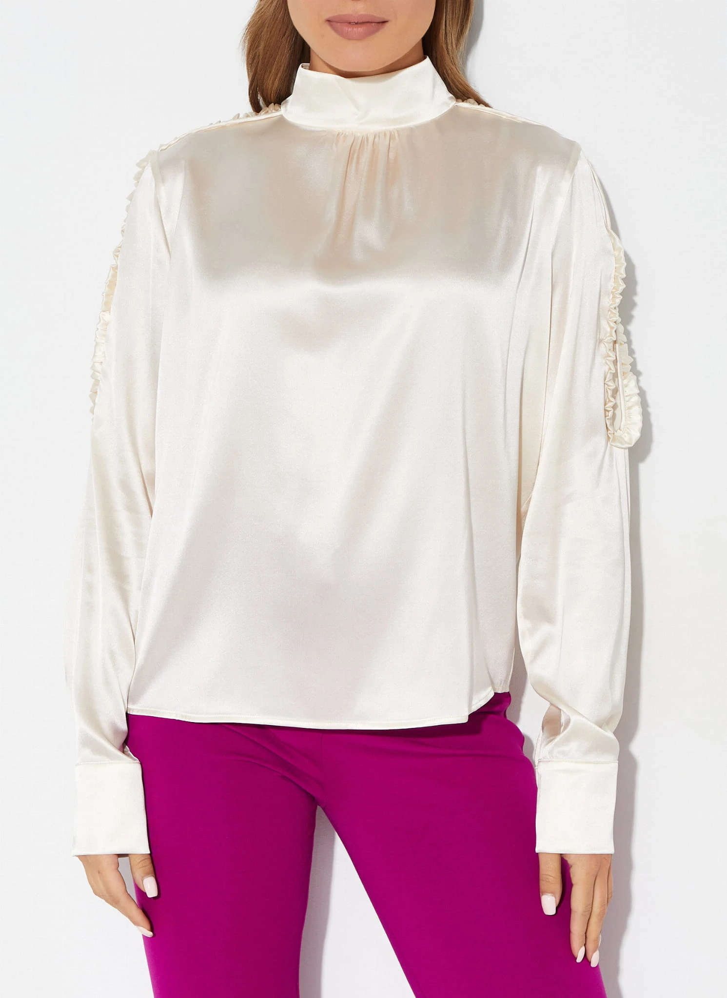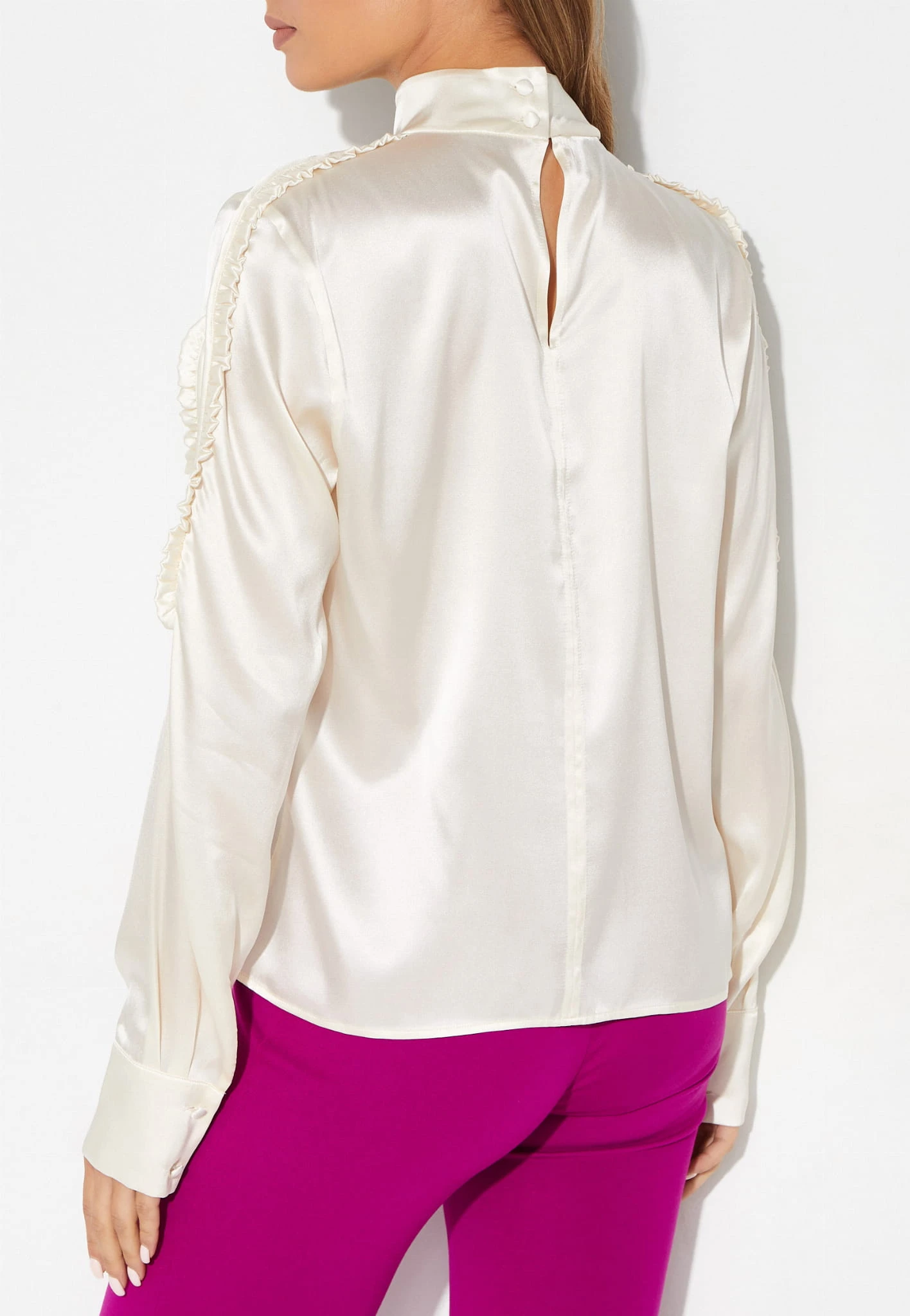 - Bluzka o miękkim kroju, z elastycznej jedwabnej satyny z brzegami wykończonymi małymi falbankami