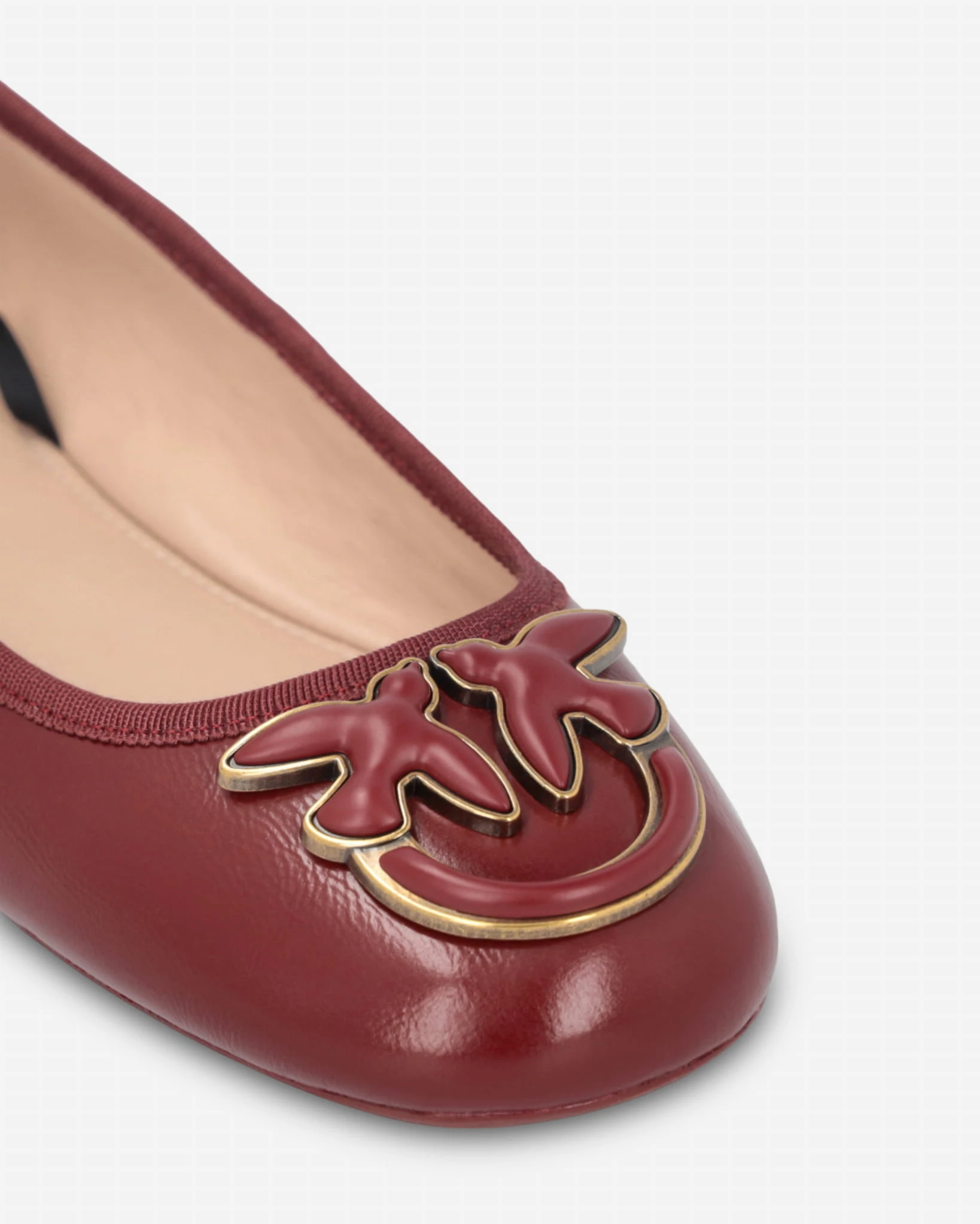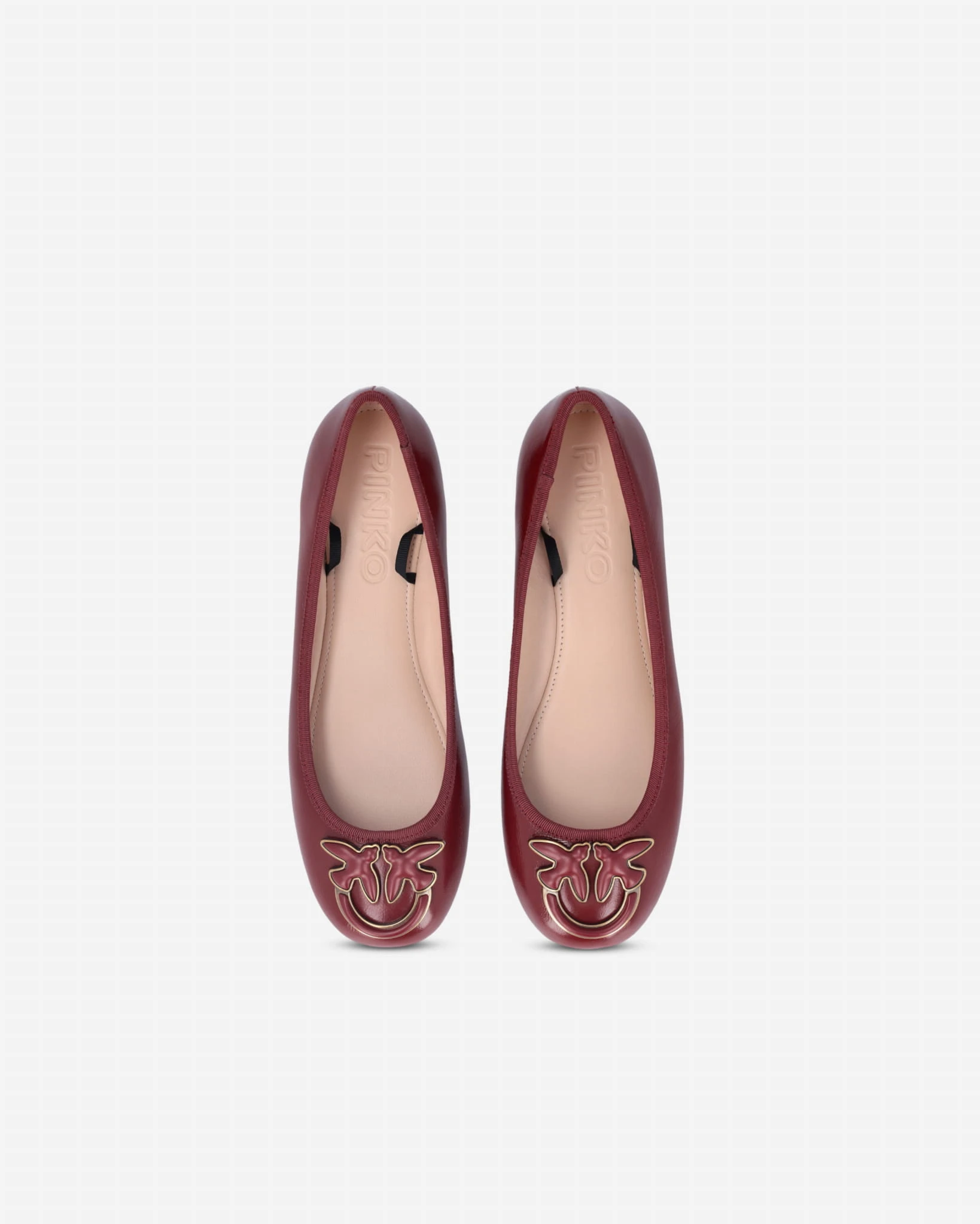 Baleriny marki Pinko w kolorze bordowym, wykonane ze skóry licowej nappa. Z wstążkami do wiązania wokół kostki oraz okrągłymi noskami ozdobionymi logo Love Birds. Skórzane wnętrze i gumowa podeszwa zapewniają wygodę i styl. Elegancka propozycja na co dzień.