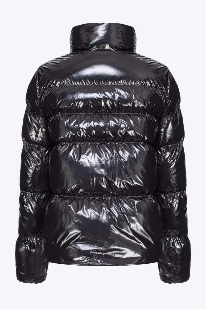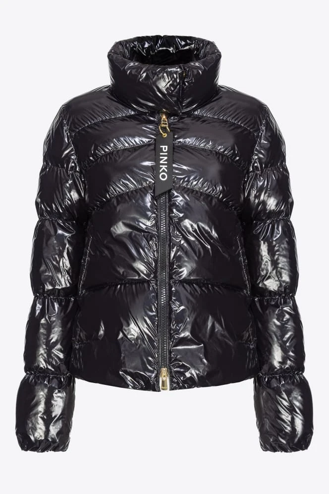 - Ocieplana kurtka puchowa o kroju bosmanki, wykonana z nylonowej tkaniny crystal o specjalnym błyszczącym wykończeniu, spersonalizowana naszywką z logo Love Birds na rękawie