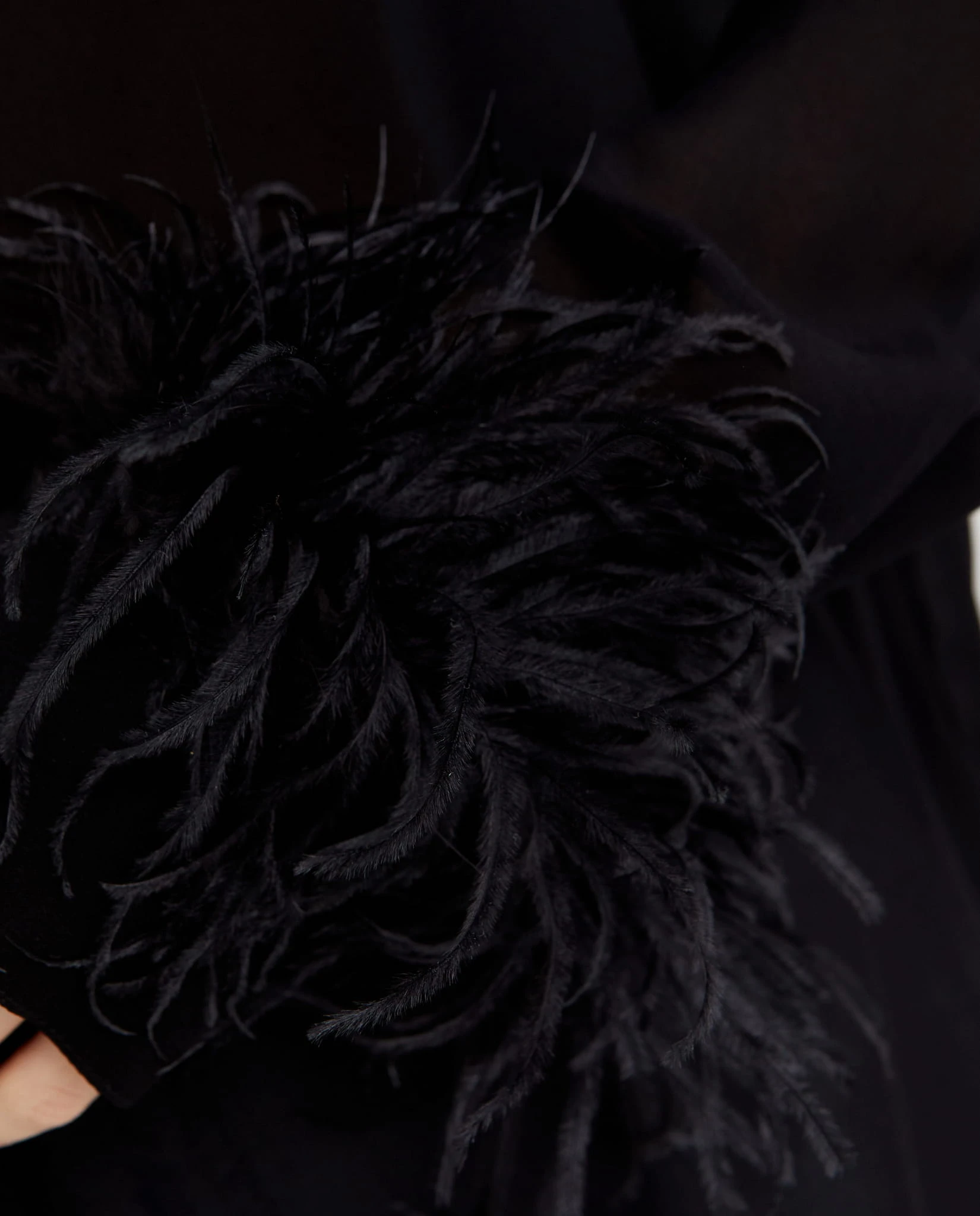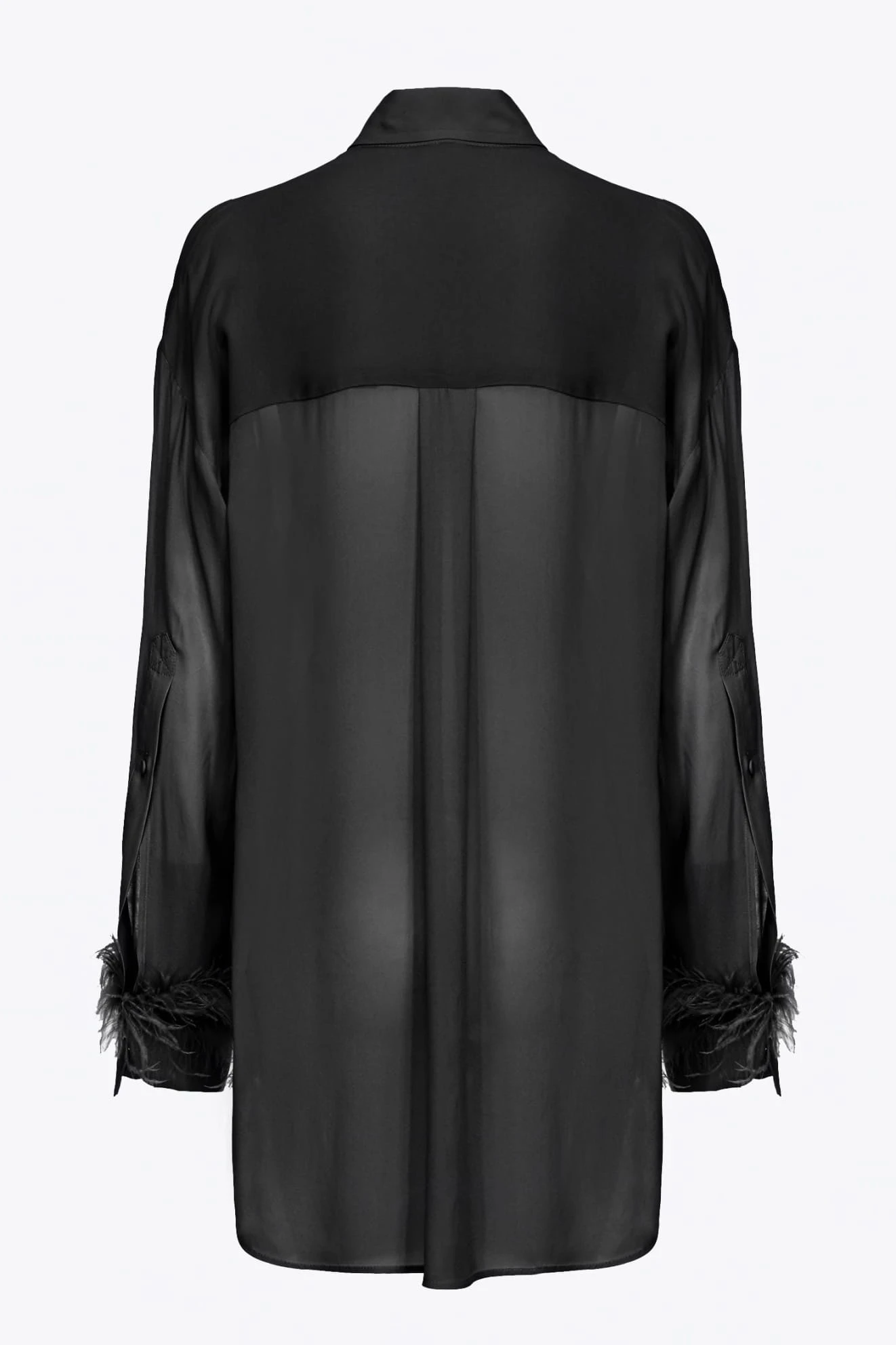 Odkryj czarną koszulę Pinko - doskonałą mieszankę wytworności i komfortu. Unikalna żorżetowa tkanina łączy się z detalami piór na mankietach, tworząc niepowtarzalny efekt elegancji.