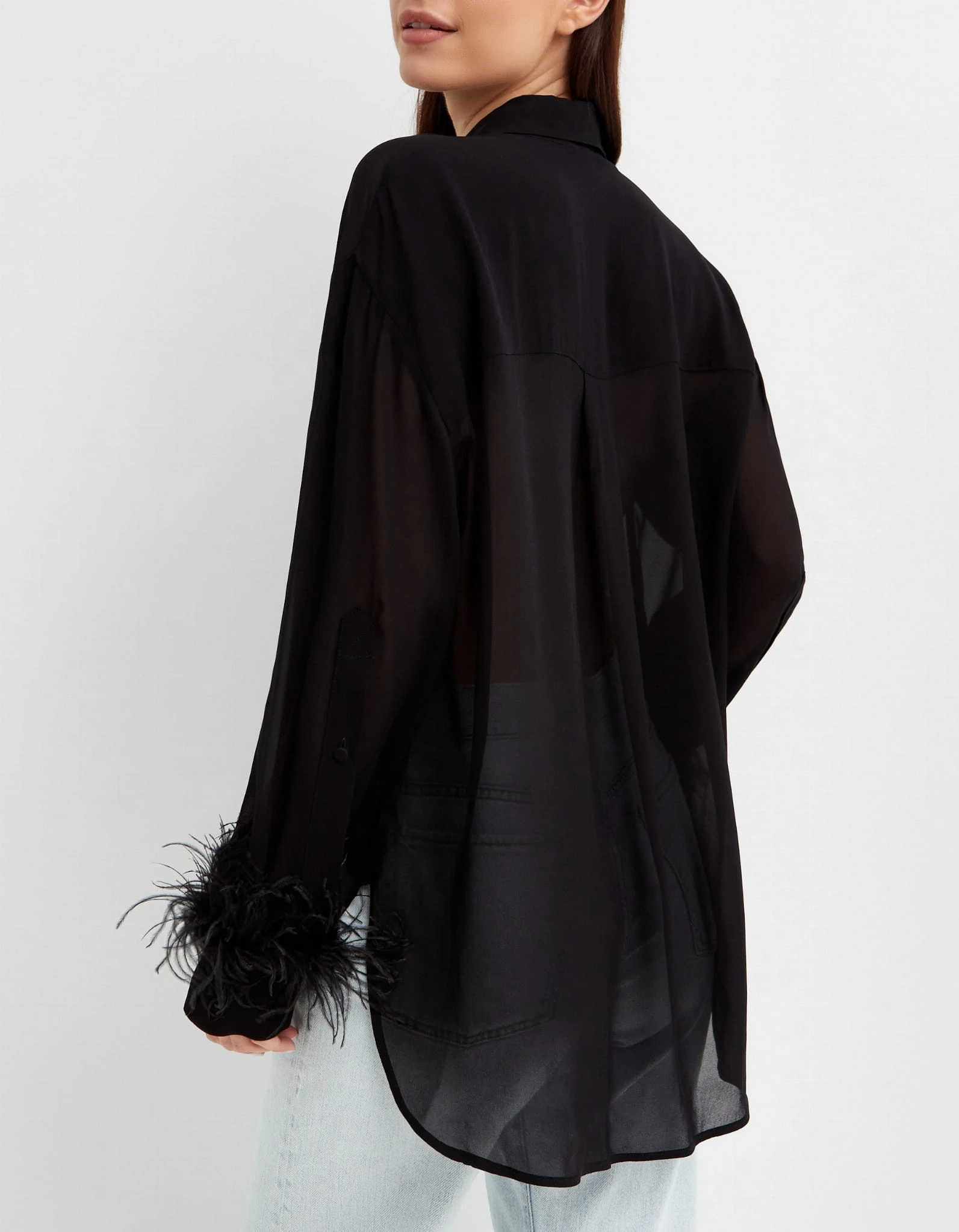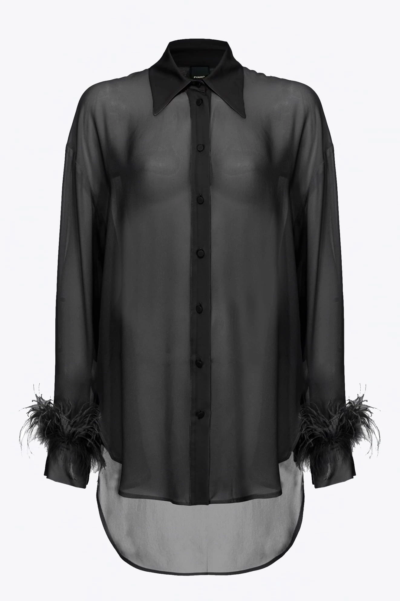 Odwieczna klasyka spotyka nowoczesny design w czarnej koszuli Pinko. Wykonana z lekkiej wiskozowej żorżety, ozdobiona mankietami obszytymi piórami, ta koszula podnosi poprzeczkę w dziedzinie elegancji.