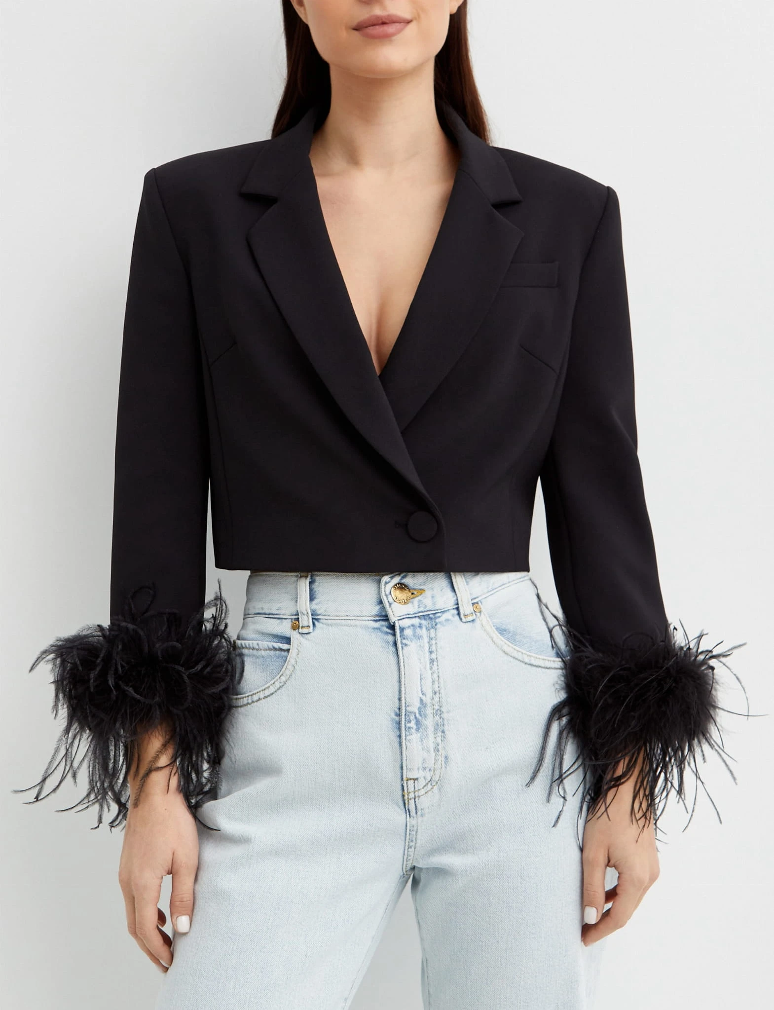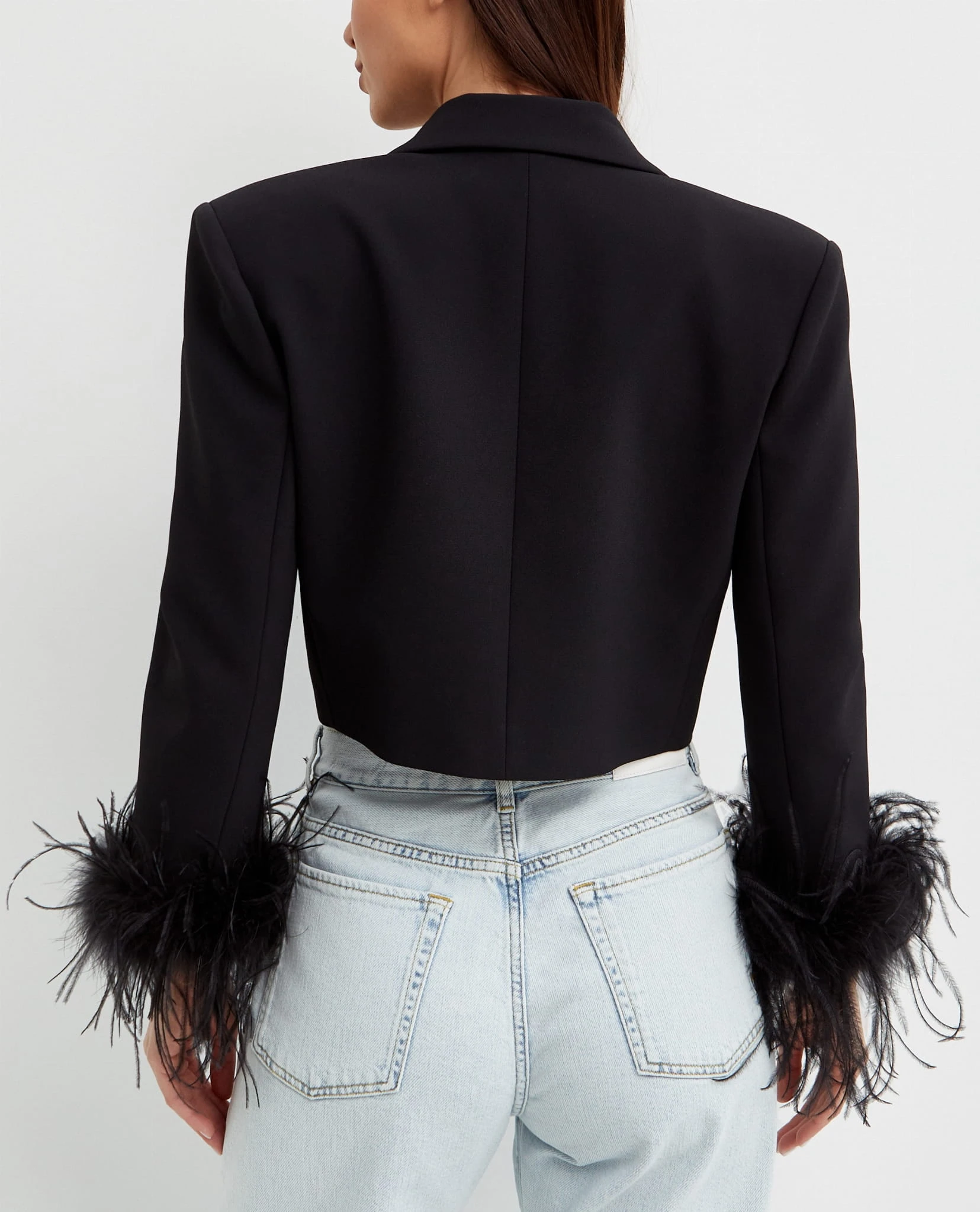 Krótki krój nadaje jej nowoczesnego wyglądu, podkreślając Twoją sylwetkę w subtelny sposób. Rękawy wykończone piórami strusia dodają niepowtarzalnego uroku i klasy, podkreślając Twój wyjątkowy styl.