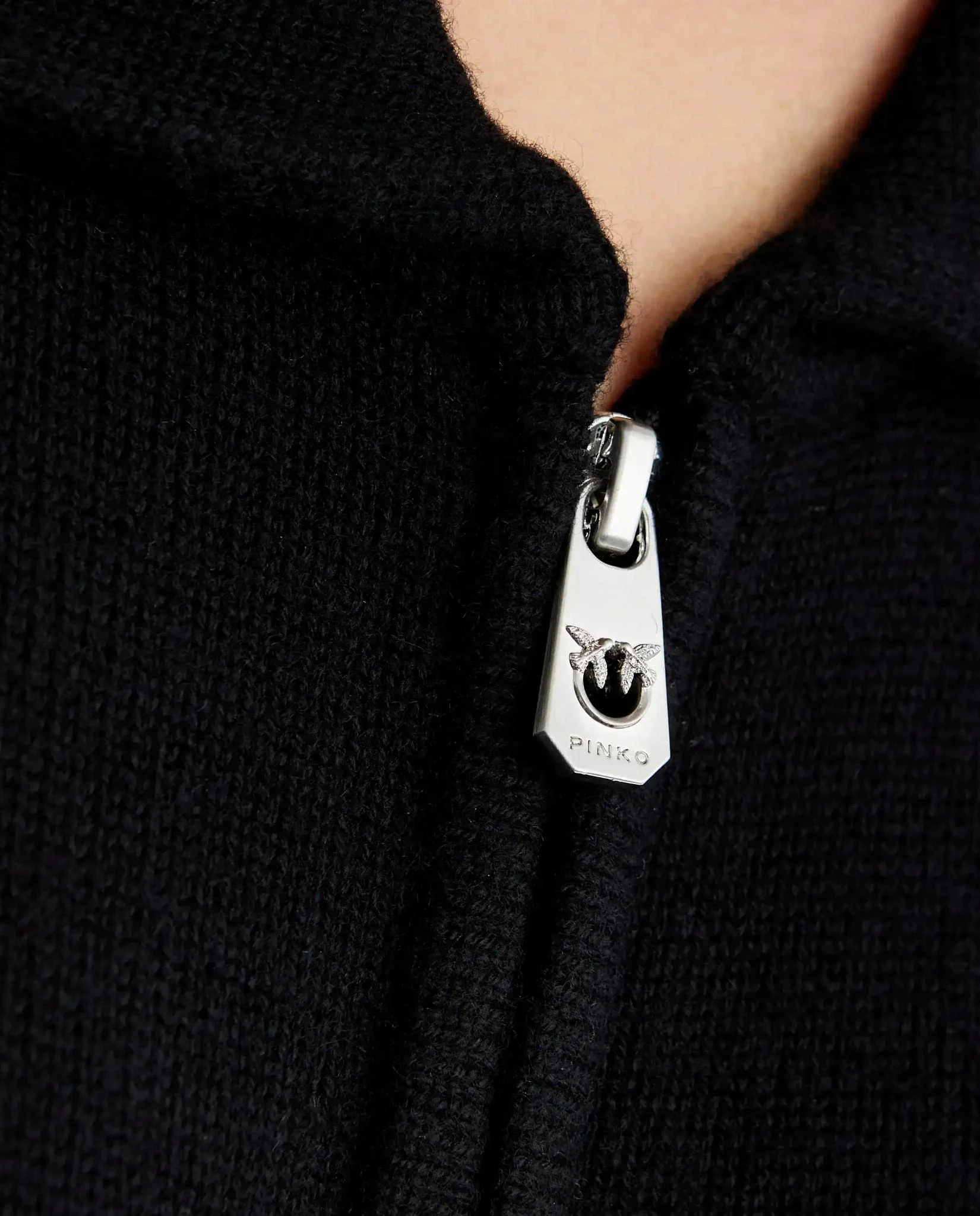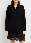 Sukienka marki Pinko w kolorze czarnym, z długimi rękawami i klasycznym kołnierzykiem. Zapinana na zamek z przodu, z koronkową wstawką, która dodaje jej subtelnej elegancji. Długość mini podkreśla jej kobiecy charakter. Wykonana z mieszanki wełny i kaszmiru, łącząc komfort z luksusowym wyglądem. Idealna na eleganckie wyjścia lub specjalne okazje.