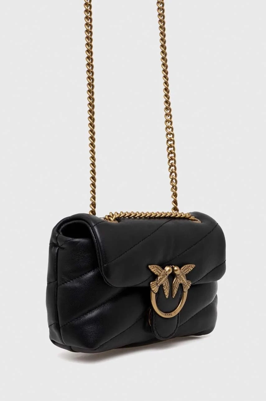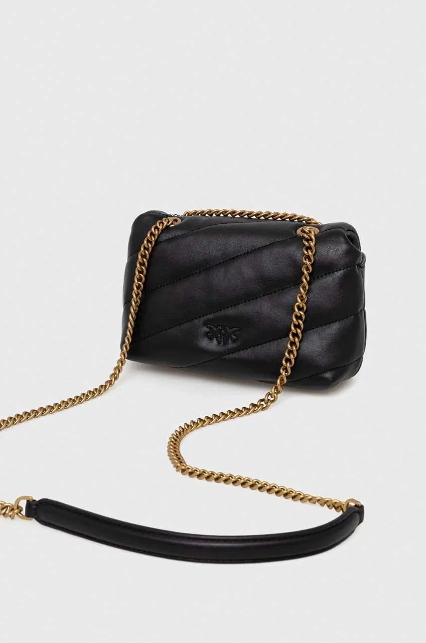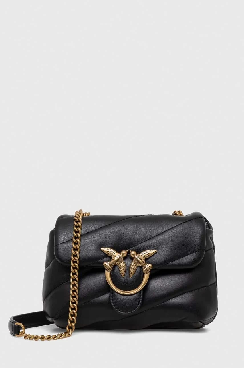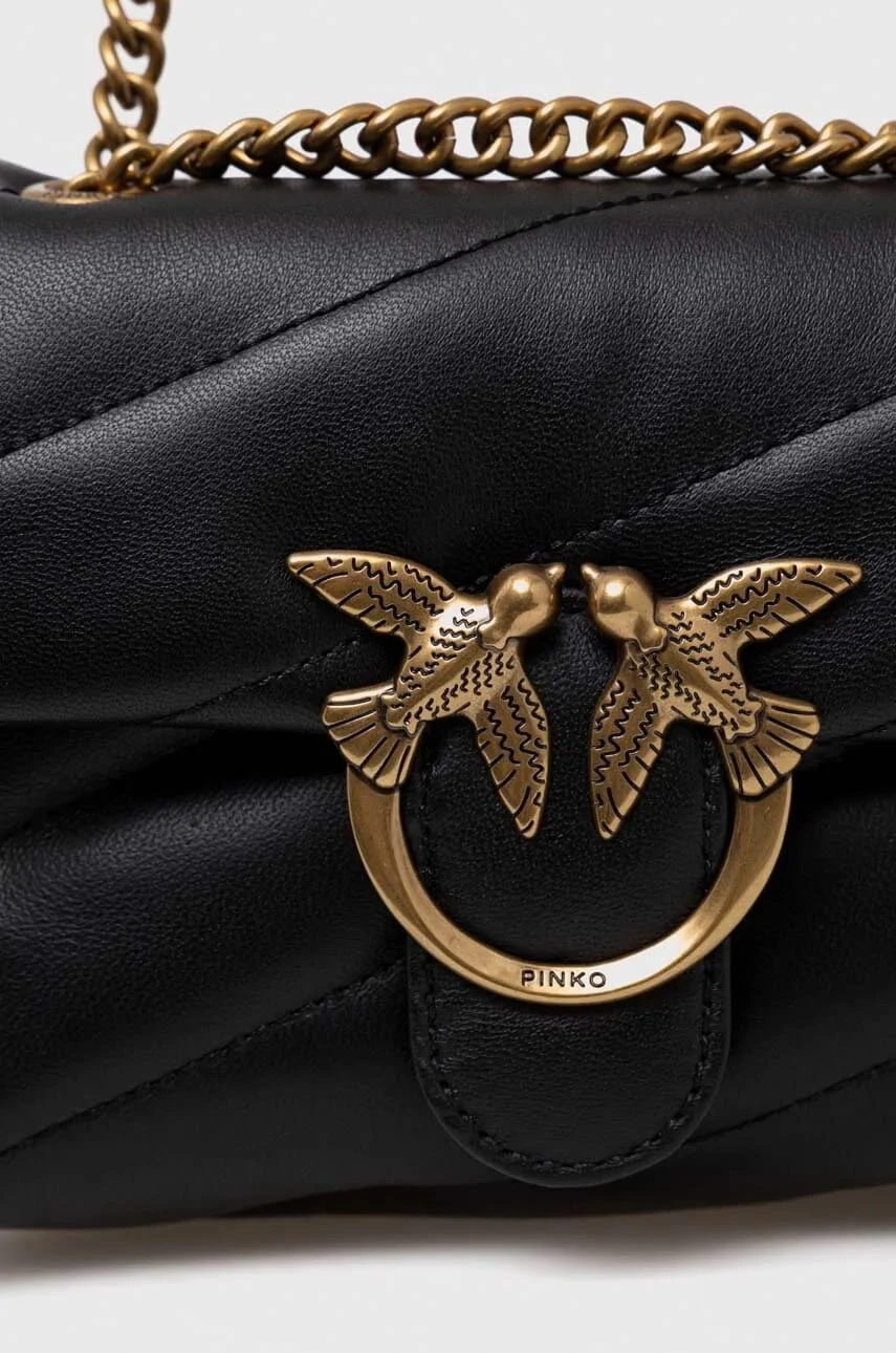 Zapięcie torebki to kultowa metalowa klamra Love Birds Diamond Cut oraz metalowe elementy w kolorze antique gold. To nie tylko funkcjonalne rozwiązanie, ale także wyraz stylu i marki Pinko.