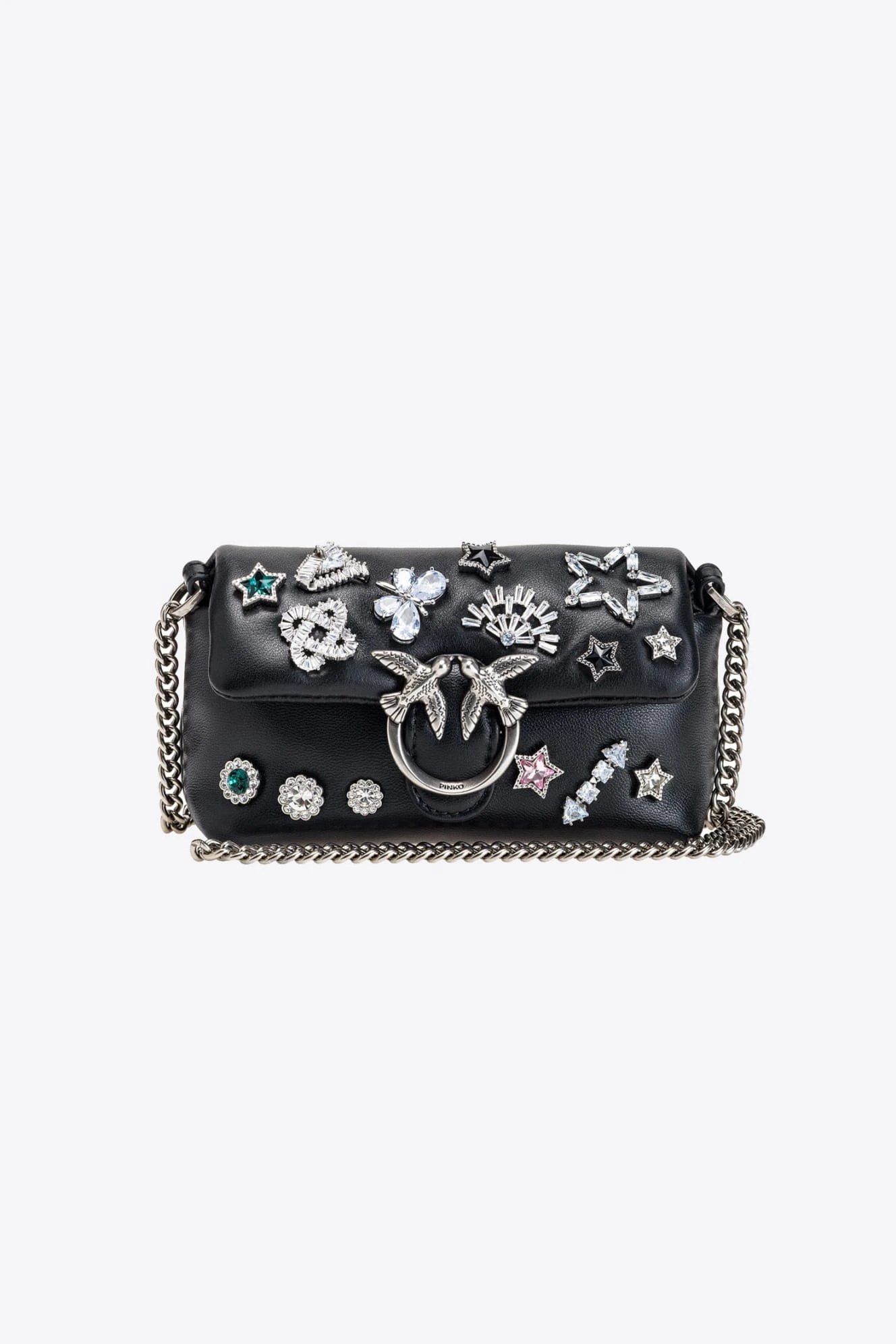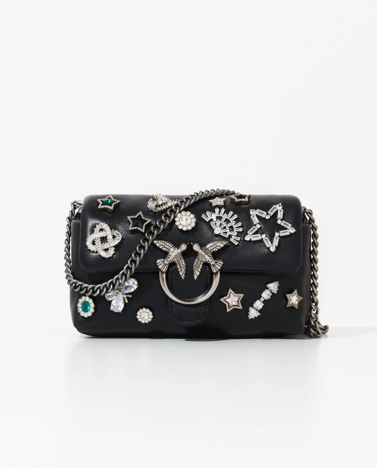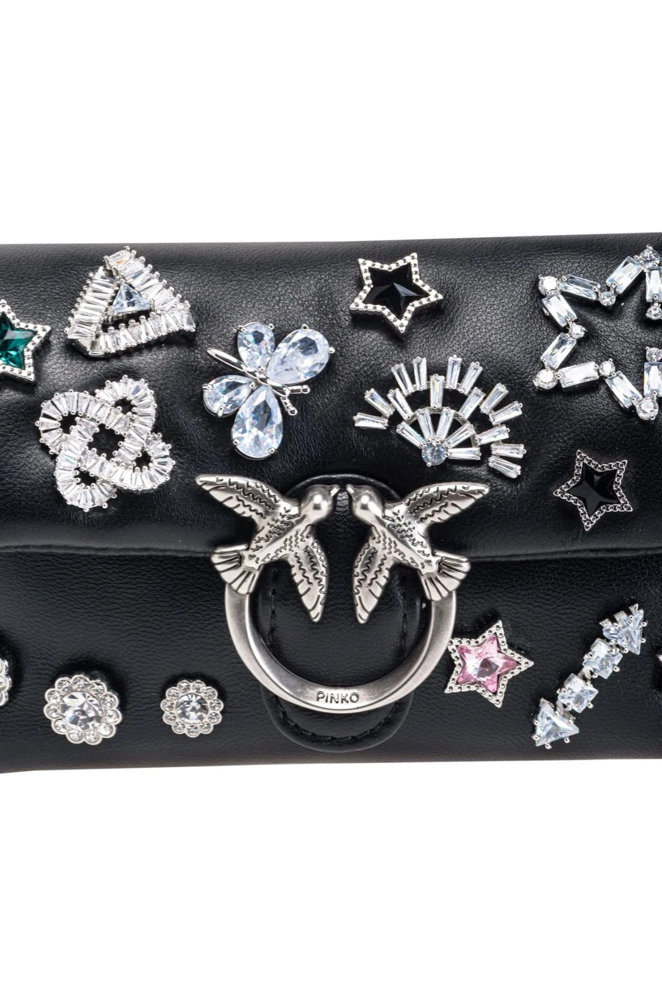 Biżuteryjne Agrafki i Kultowa Klamra: Zapięcie torebki ozdobione jest biżuteryjnymi agrafkami, które dodają mu wyjątkowego blasku. Dodatkowo, klamra Love Birds Diamond Cut to nie tylko element zamykający, ale i symbol stylu marki Pinko.