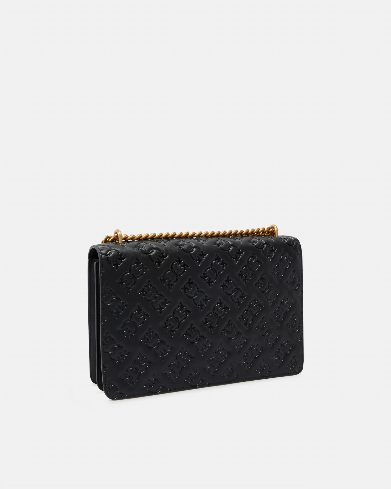 Torebka marki Pinko, model Love Bag, w kolorze czarnym, z wytłaczanym motywem Love Birds Monogram. Zapięcie z metalową klamrą Love Birds Diamond Cut w kolorze starego złota. Wewnątrz przegródka na zamek i płaska kieszonka, a całość wykończona podszewką. Pasek na ramię z łańcuszka, uzupełniony naramiennikiem ze skóry nappa. Wykonana z miękkiej skóry, elegancka i pełna detali.