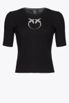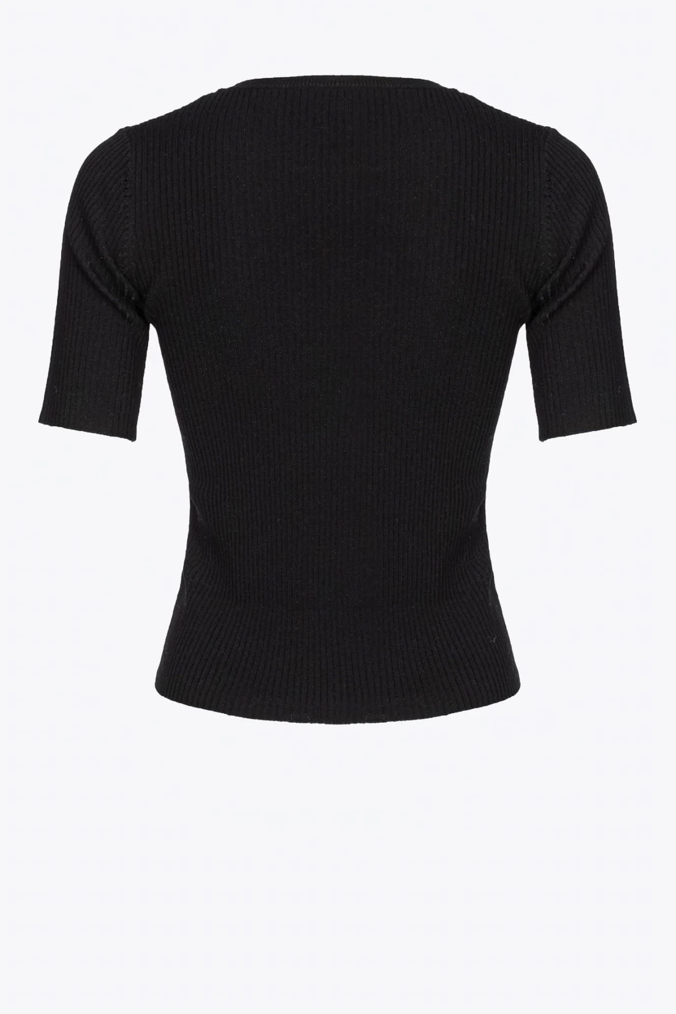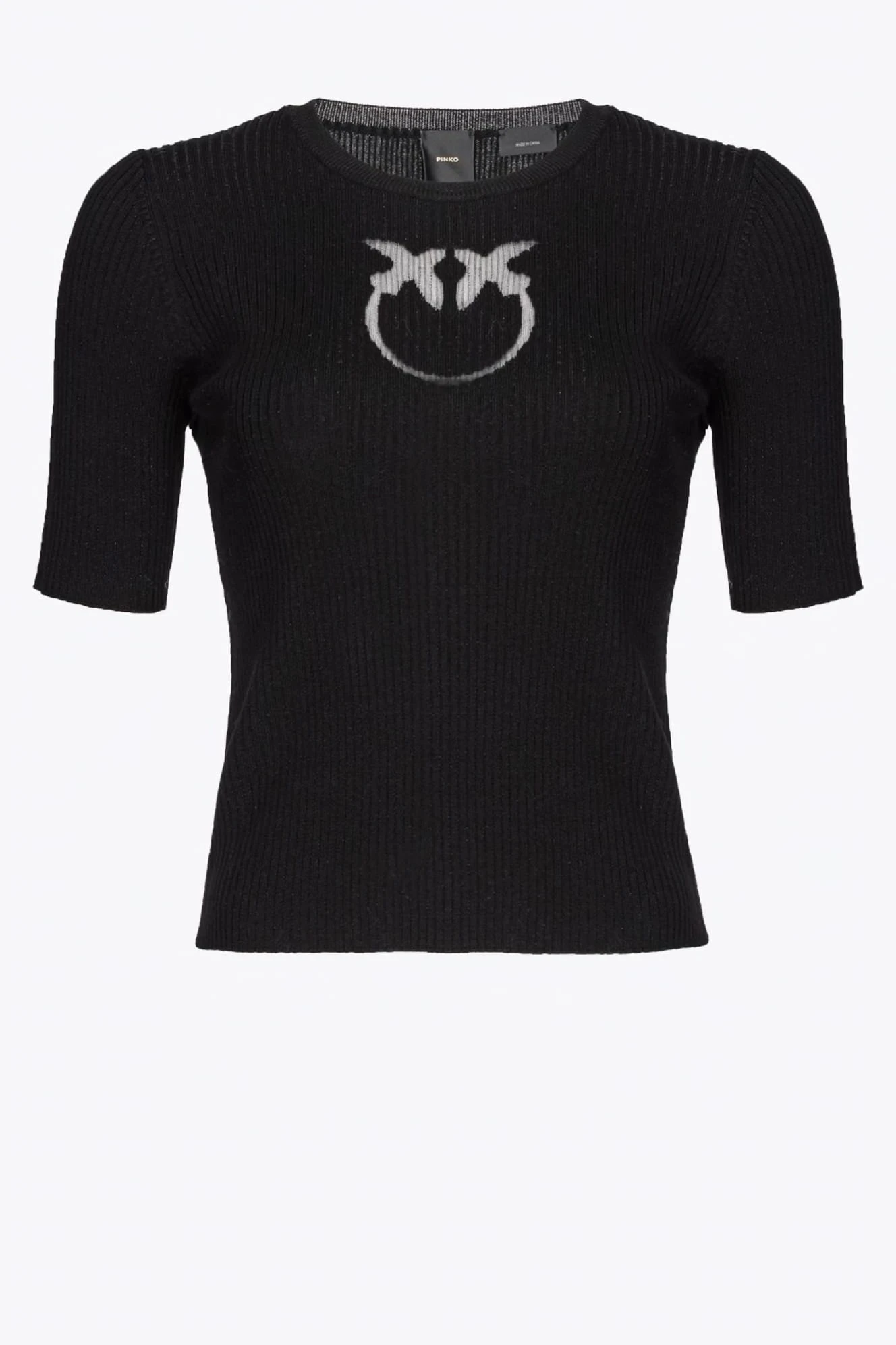 - Krótka koszulka z rękawami do łokcia, wykonana z 100% wełny dzianej splotem ściągaczowym, z detalem w formie prześwitującej intarsji z logo Love Birds na przodzie