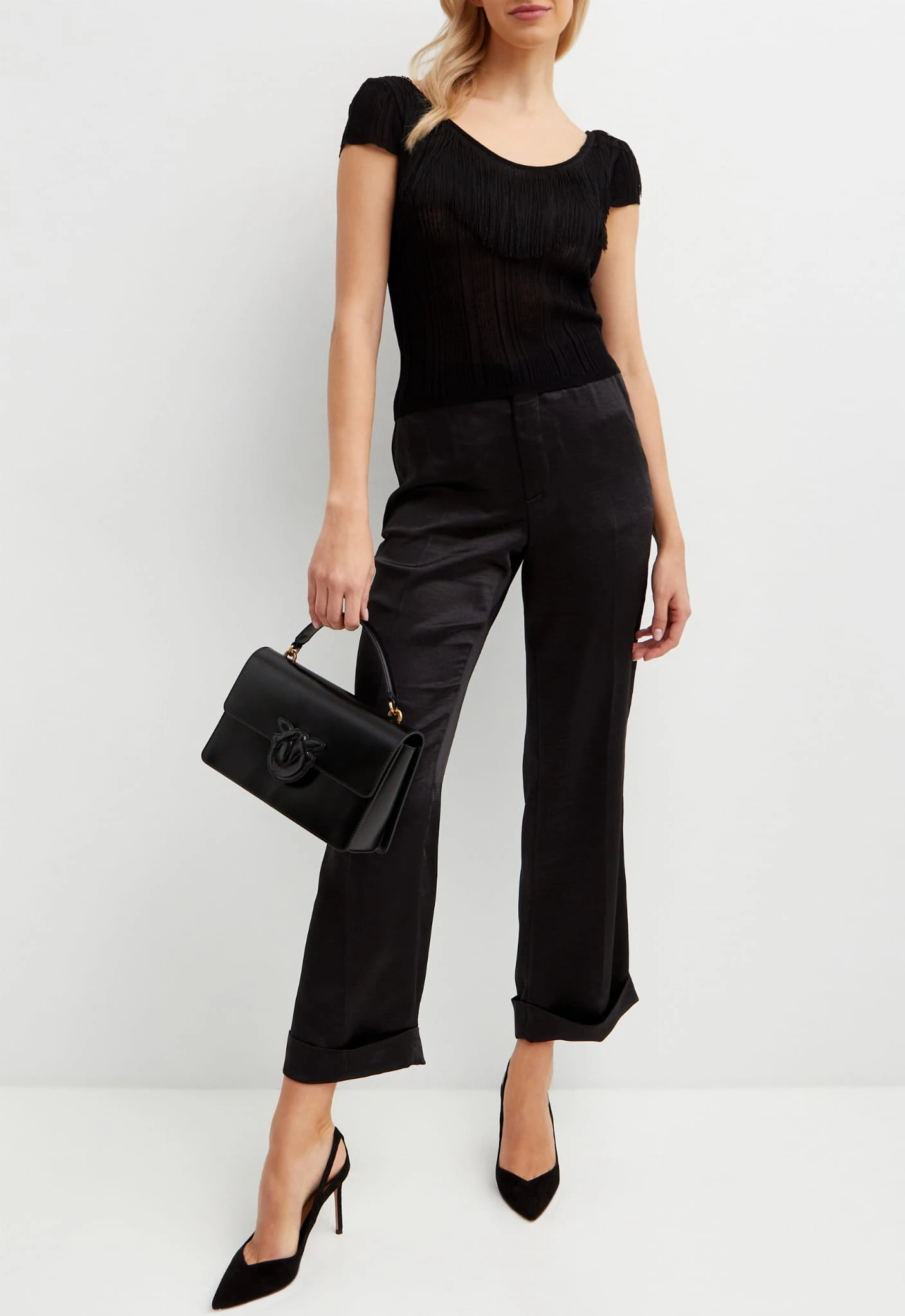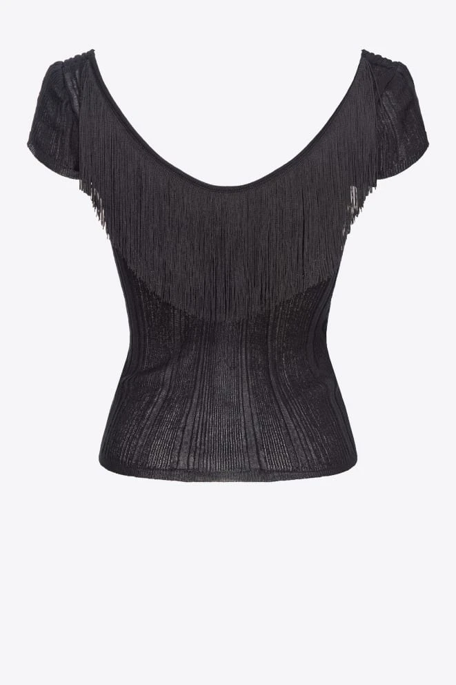 Wyróżniając się spośród innych, top Pinko zachwyca szczegółami. Aplikacja w postaci cienkich frędzli, otaczających duży, okrągły dekolt z tyłu, dodaje mu wyjątkowego charakteru. To subtelne, ale zauważalne detale, które sprawią, że staniesz się w centrum uwagi.