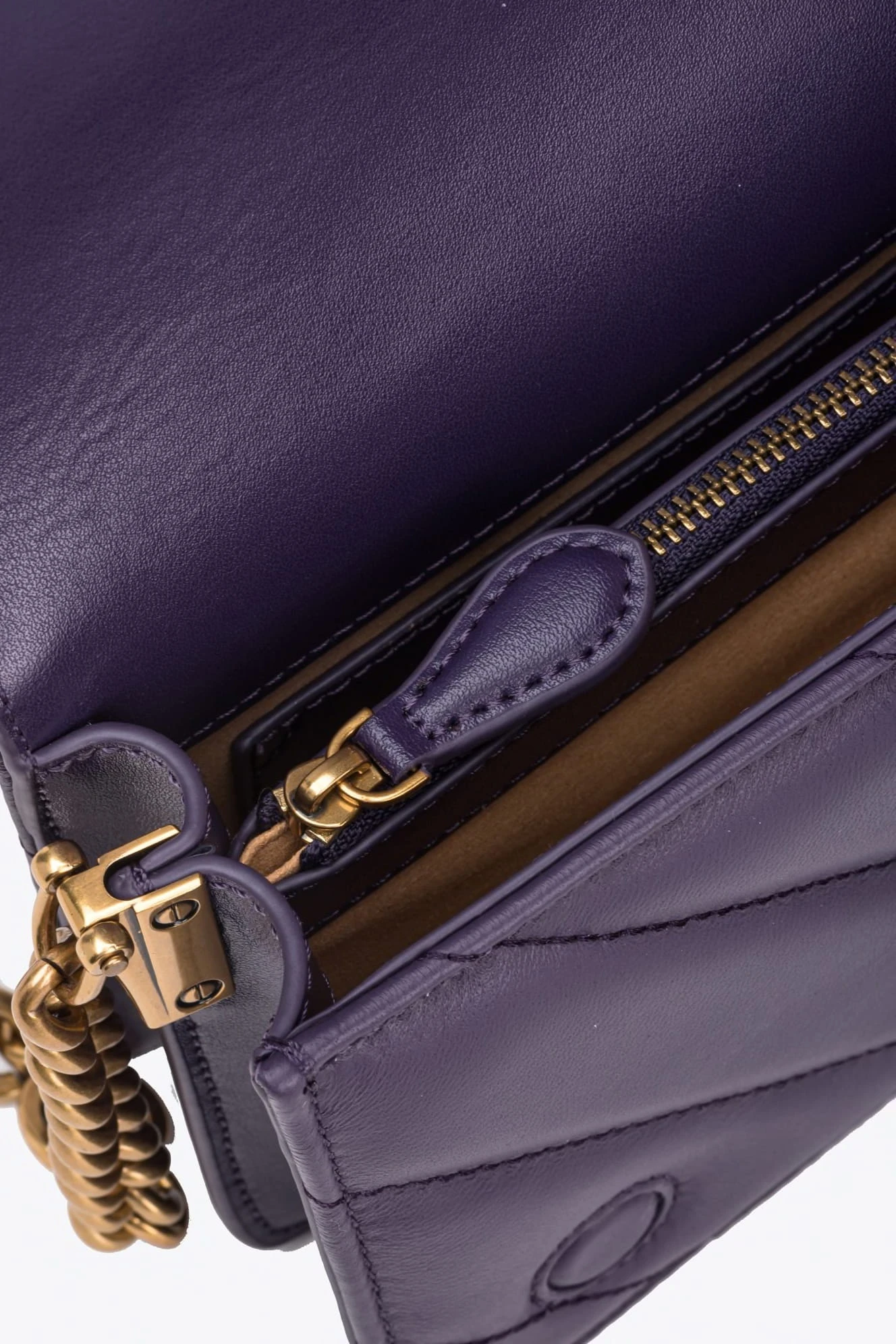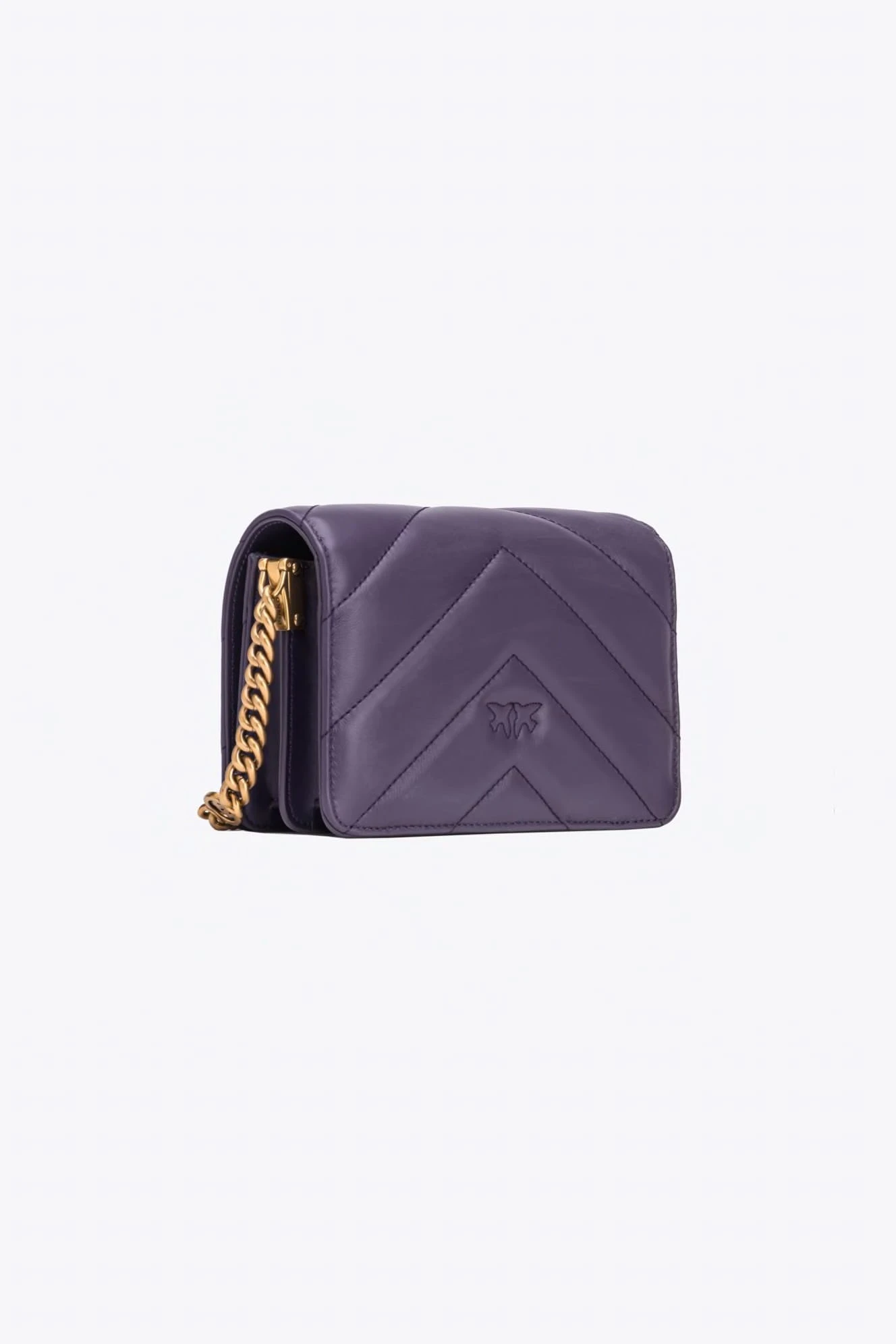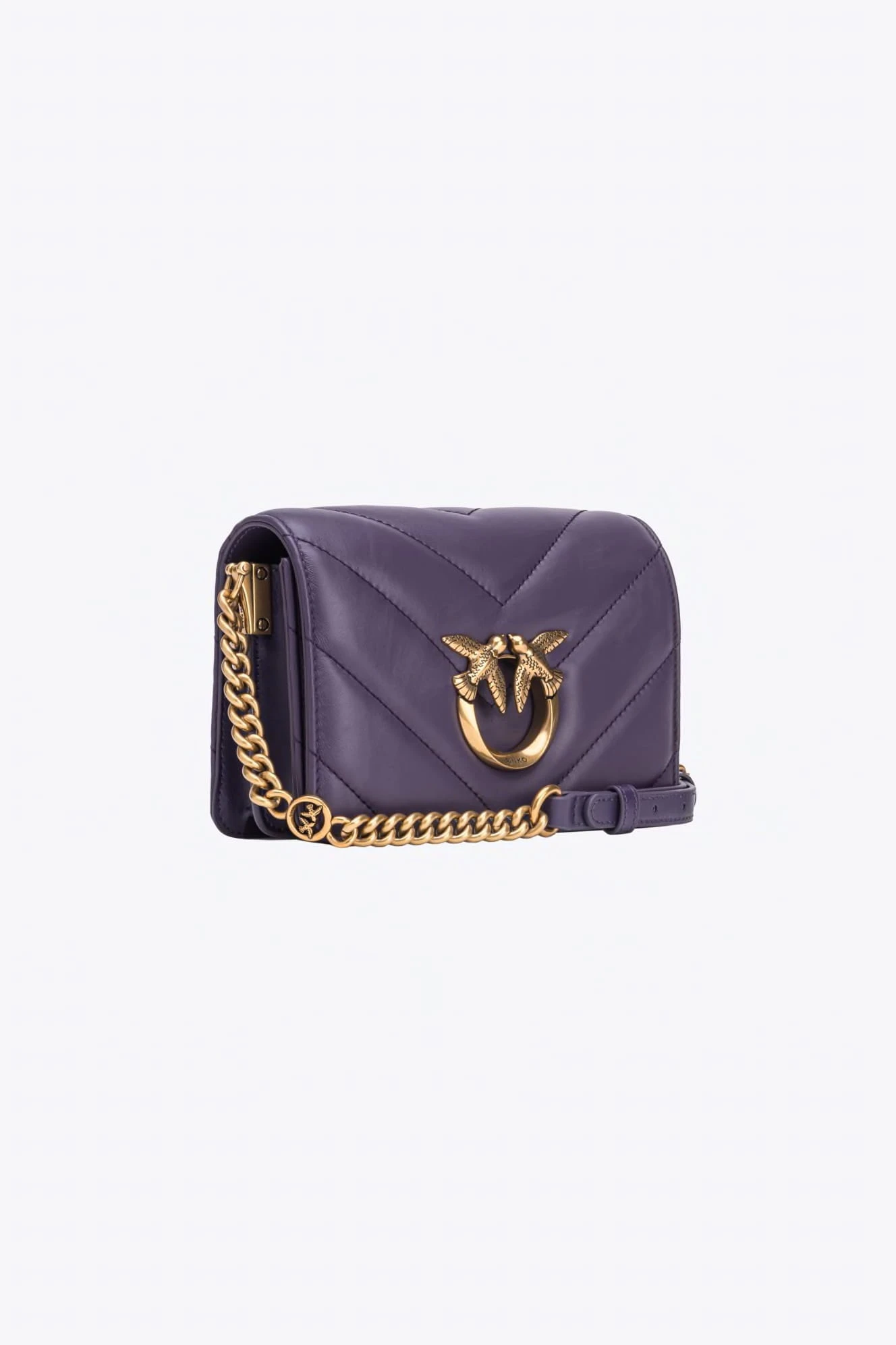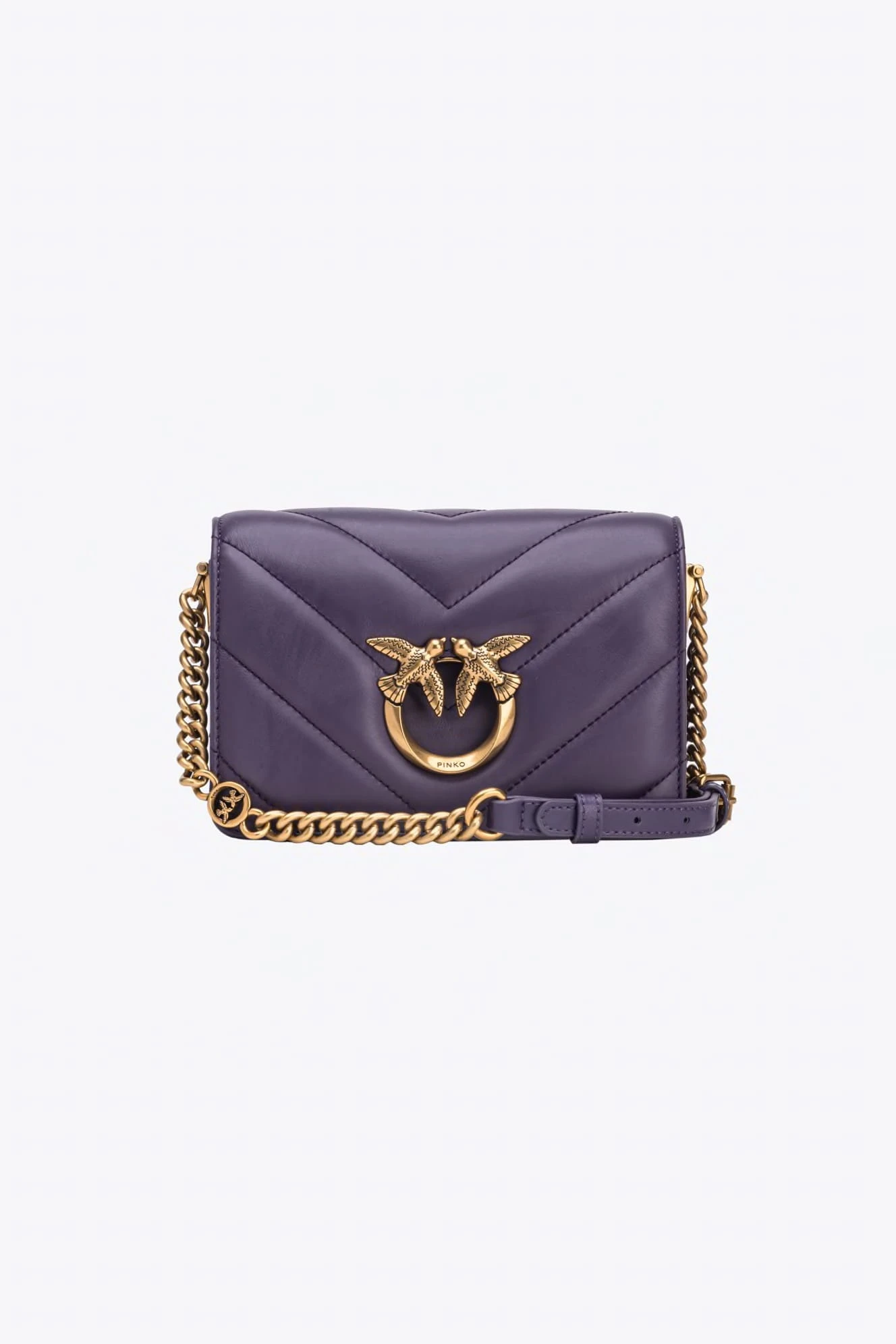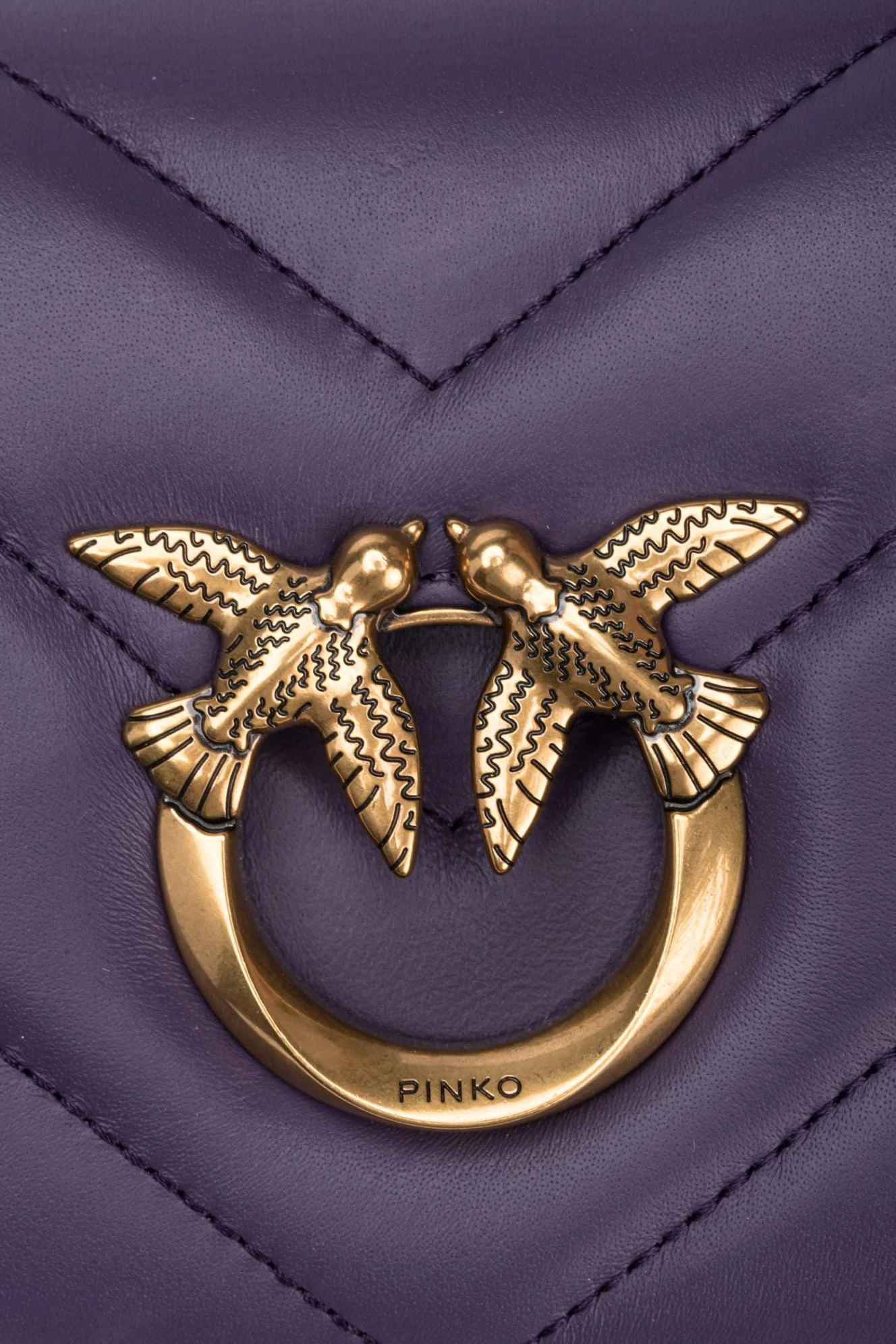 Torebka Mini Love Bag Click marki Pinko to elegancka opcja z nappy pikowanej dużym motywem chevron. Ukryte zapięcie na zatrzask uzupełnia kultowa metalowa klamra Love Birds Diamond Cut w kolorze starego złota. Wnętrze wykończone podszewką z zamszowej mikrofibry, z przegródką na zamek i płaską kieszonką ze skóry. Pasek na ramię łączy klasyczny okrągły łańcuszek z regulowanym skórzanym naramiennikiem. Dodatkowo, dzięki haftowi Love Birds z tyłu torebki, możesz aktywować swoją torebkę i sprawdzić jej autentyczność przez smartfon, włączając spersonalizowane wrażenia!