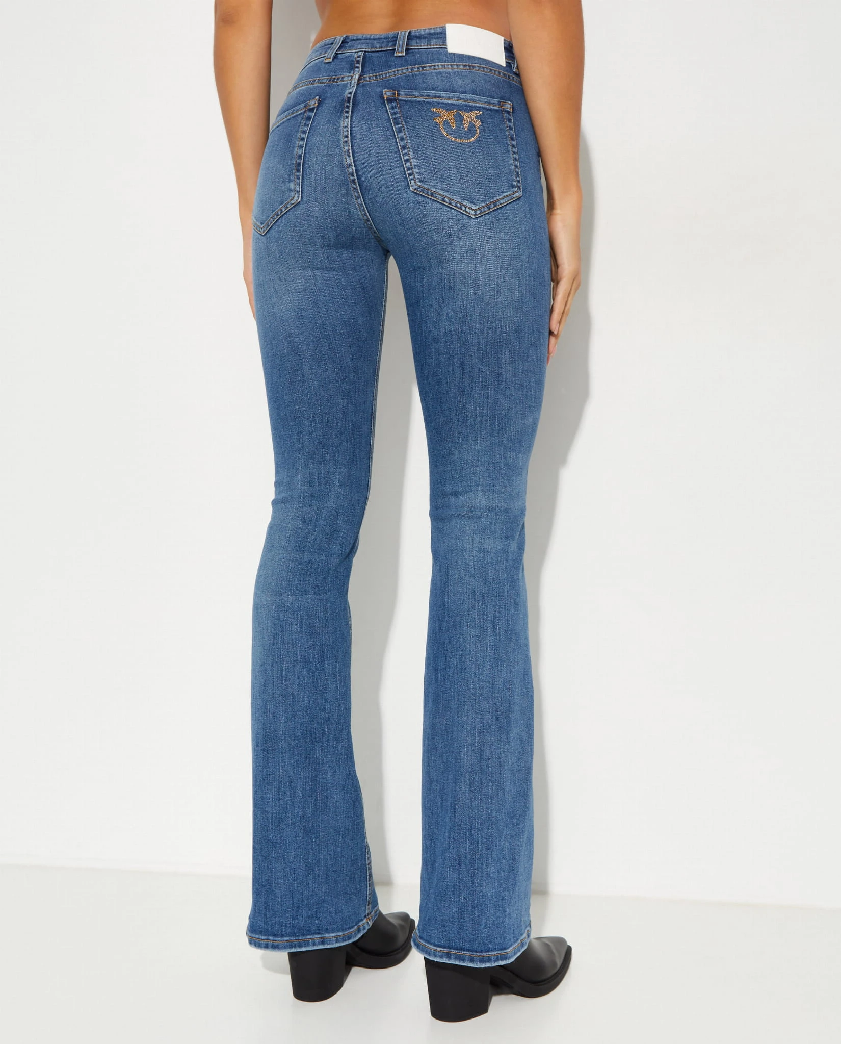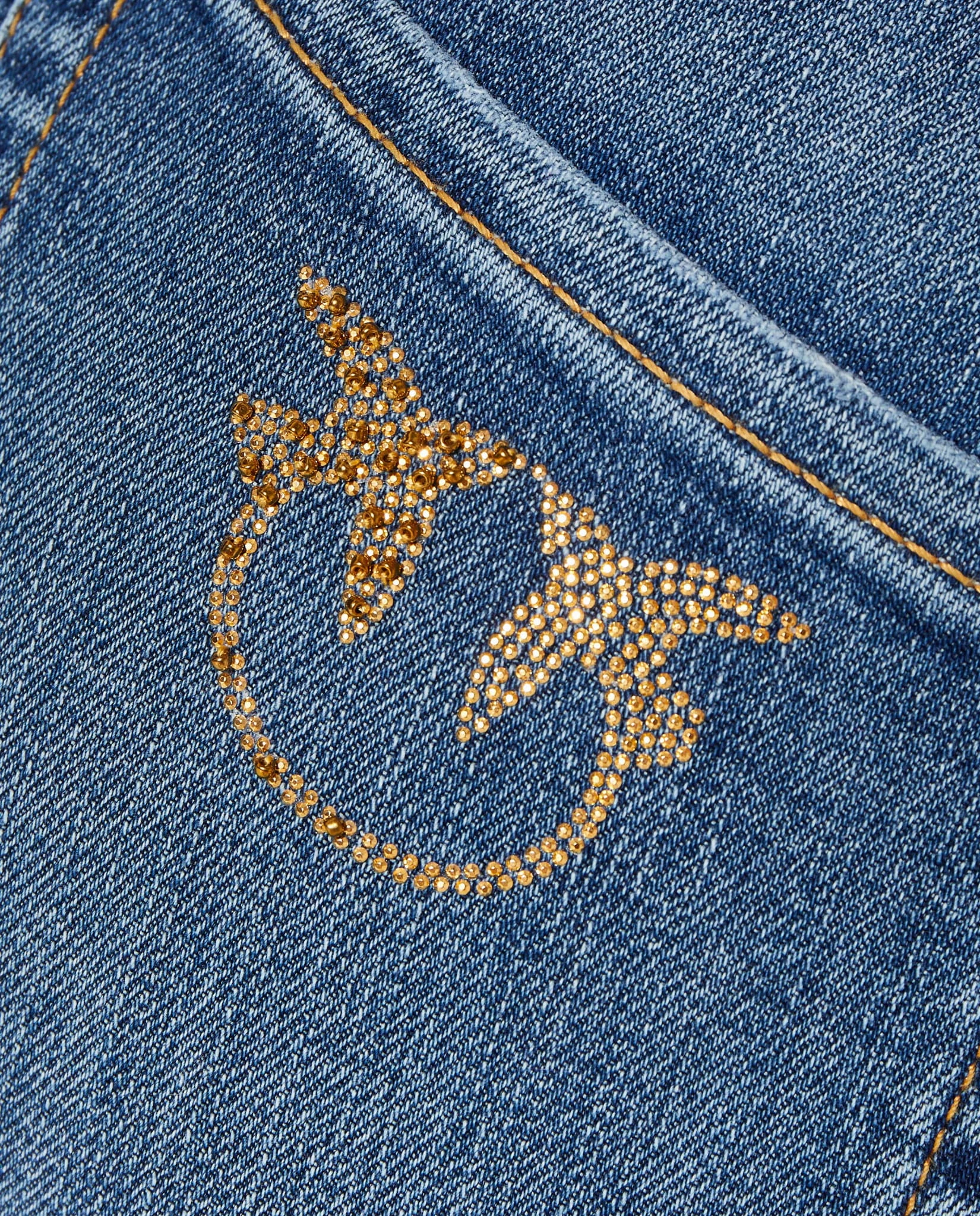 - Regularny stan ze szlufkami na pasek, obcisła rozszerzana u dołu nogawka, z błyszczącym haftem Love Birds na jednej z dwóch kieszeni z tyłu