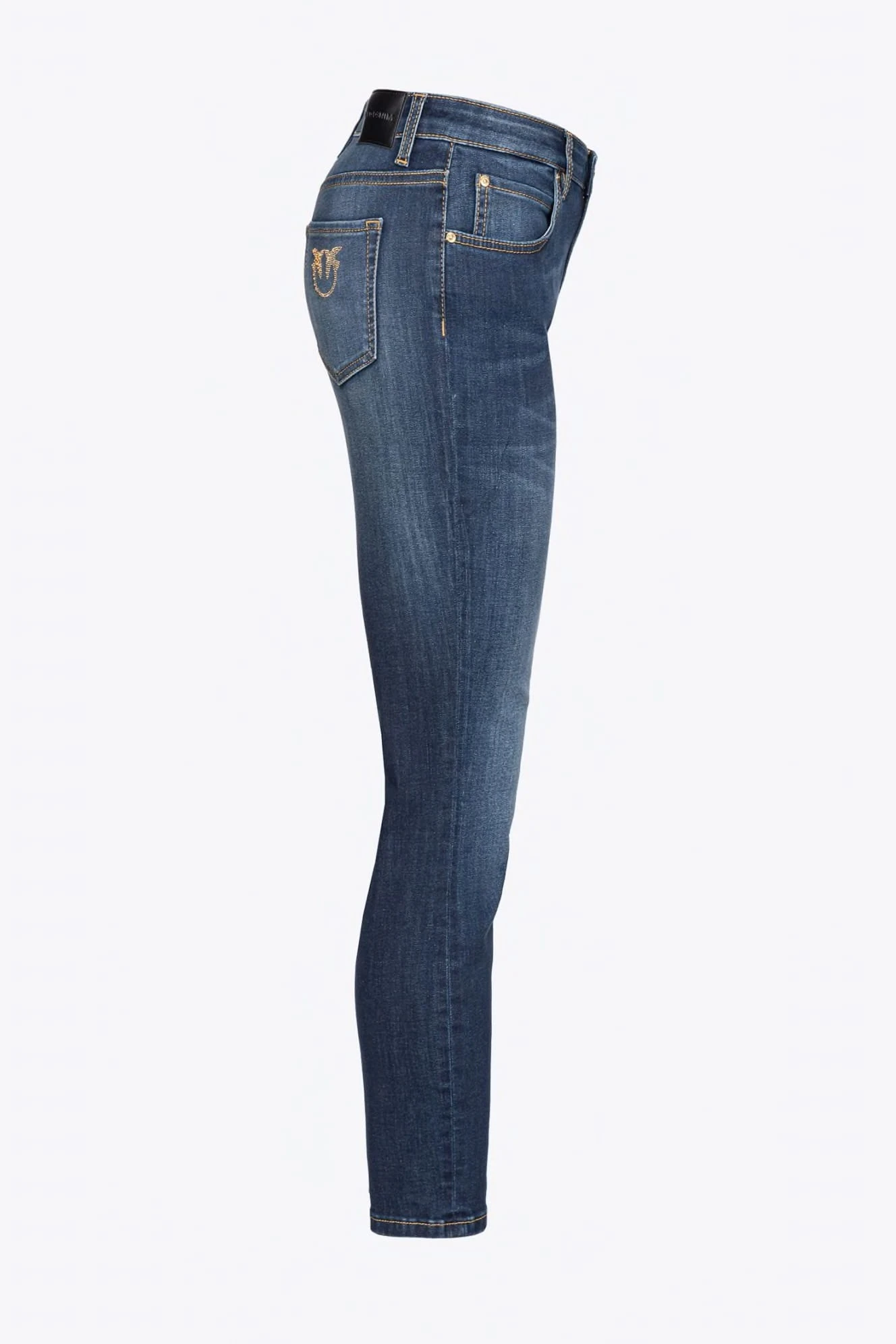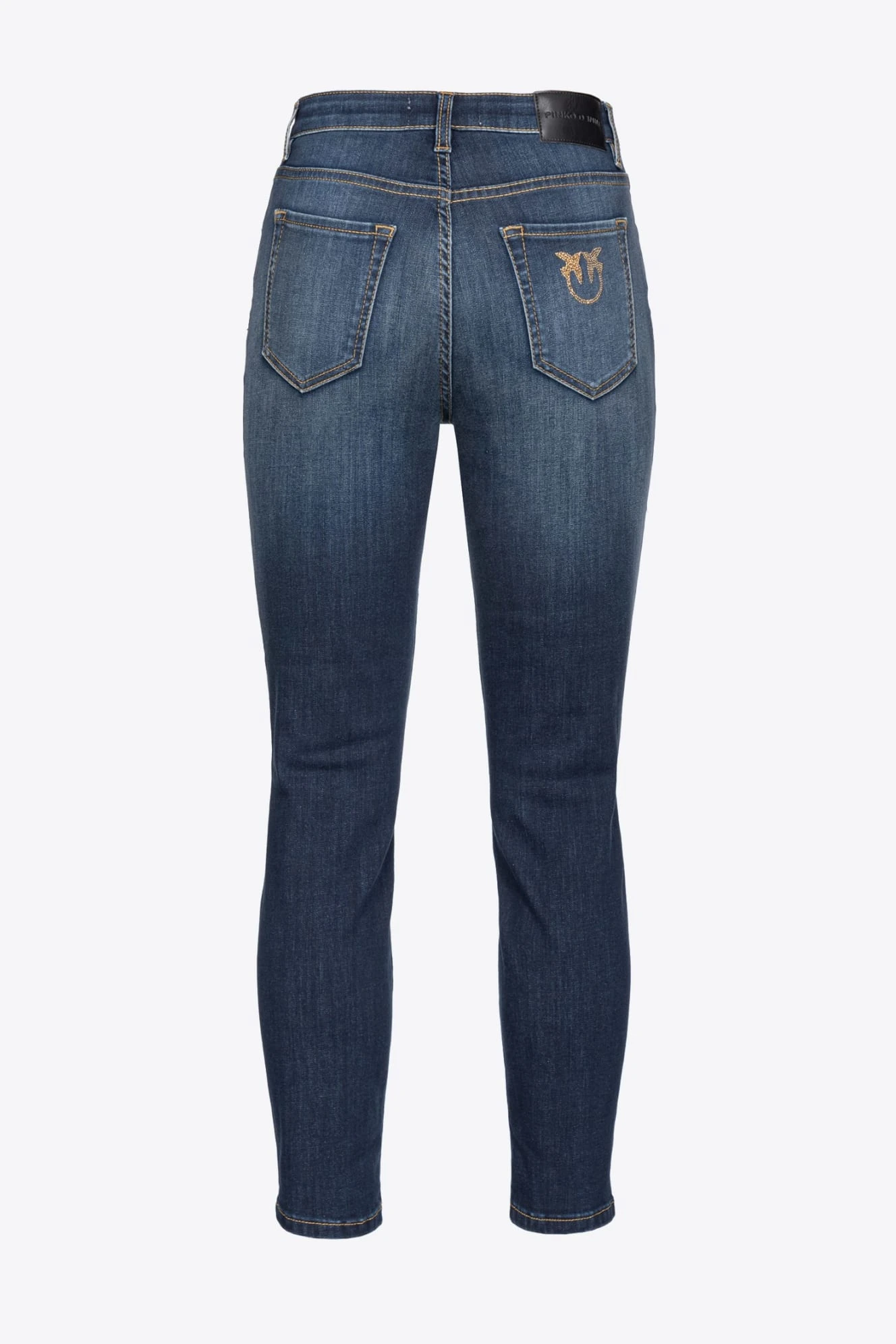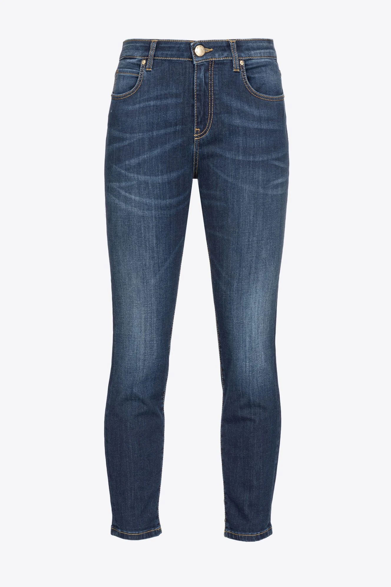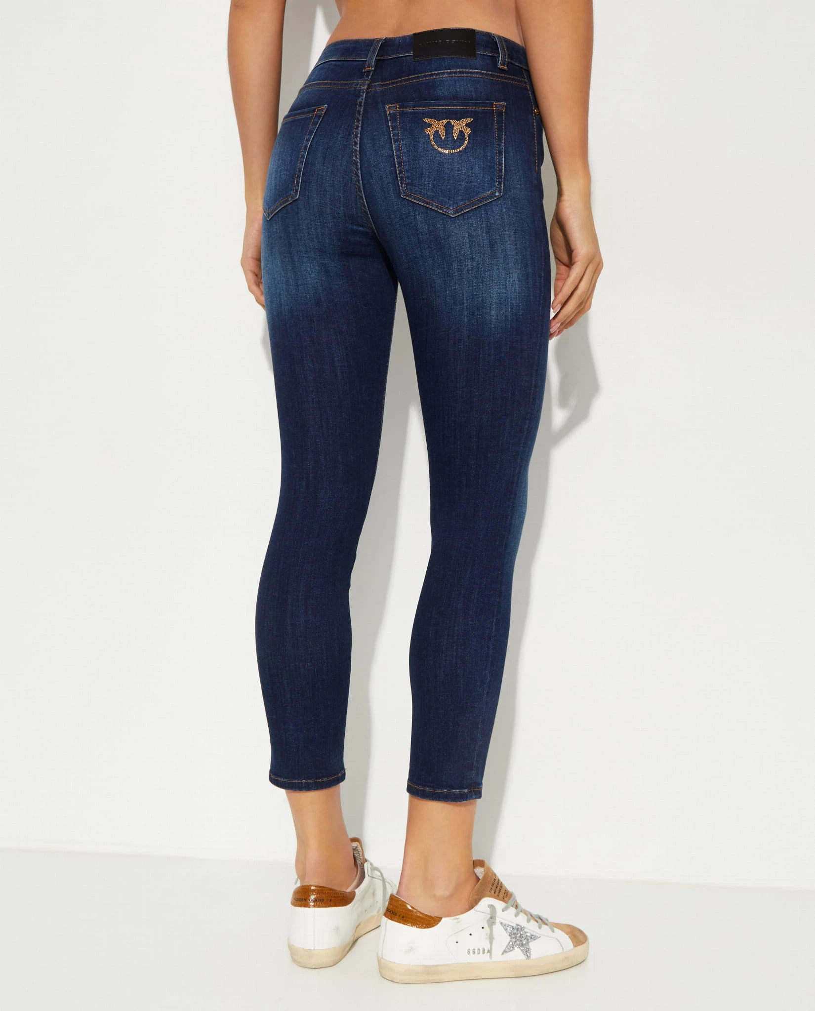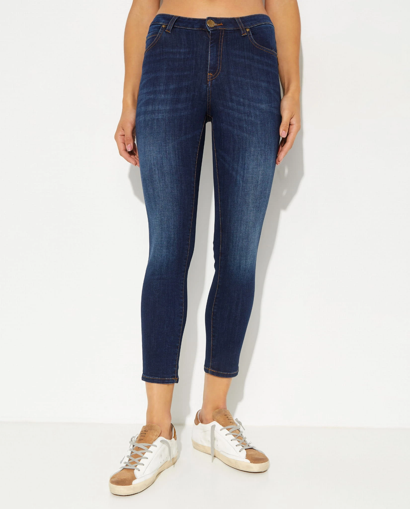 - Dżinsy cropped z pięcioma kieszeniami o kroju skinny, uszyte z elastycznego niebieskiego denimu w ciemnym odcieniu sprania