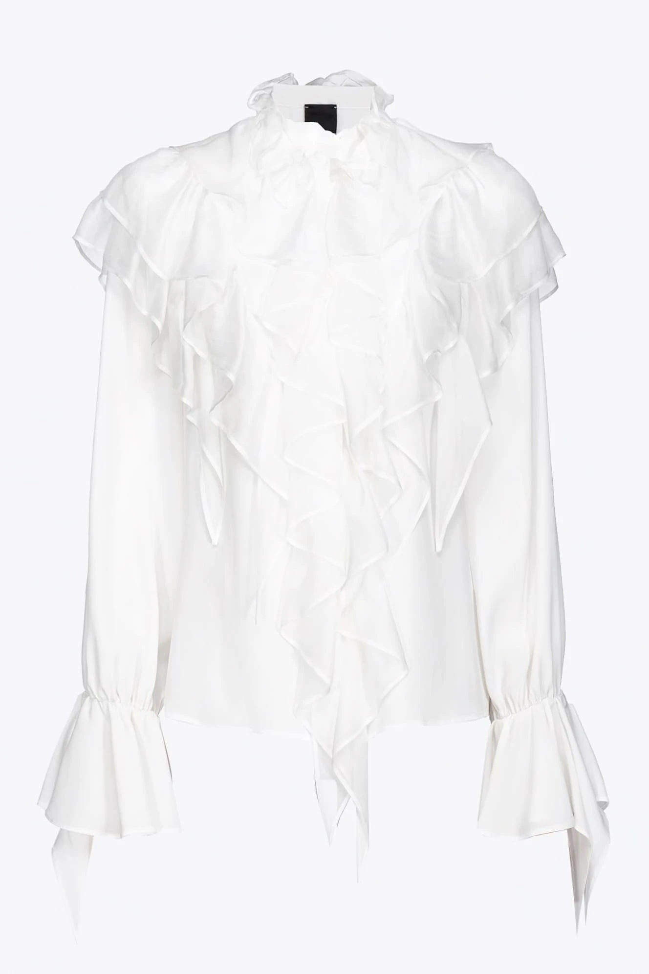 - Górna część modelu wyróżnia się kaskadą szyfonowych falban z jedwabiu w tym samym odcieniu