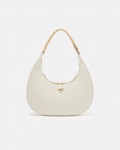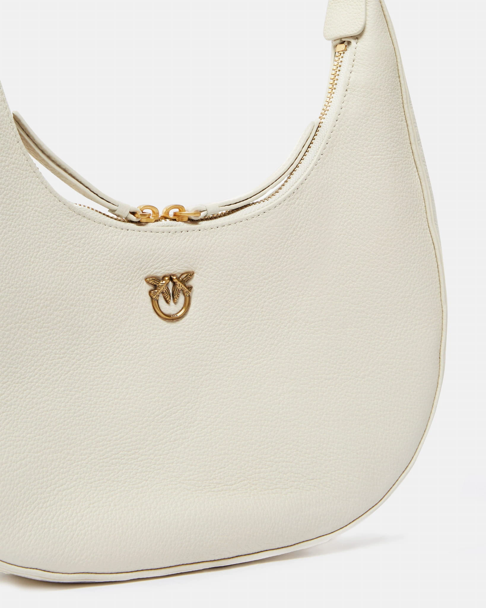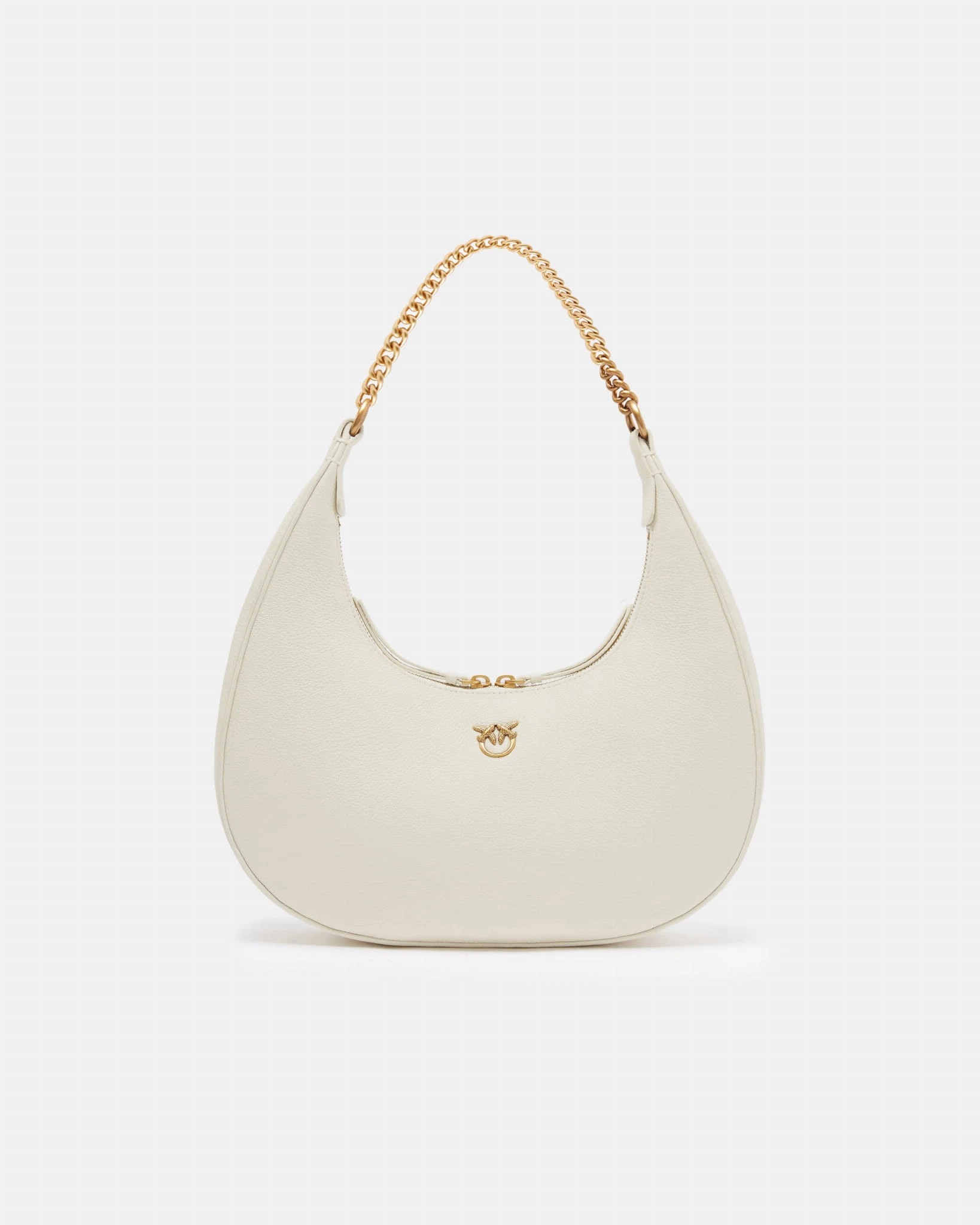 Torebka Pinko w kolorze białym, w stylu brioche, o zaokrąglonym kształcie. Wyposażona w uchwyt z metalowego łańcuszka oraz kieszeń zamykaną na zamek. Złote logo Love Birds Diamond Cut na przodzie. Elegancka i funkcjonalna.