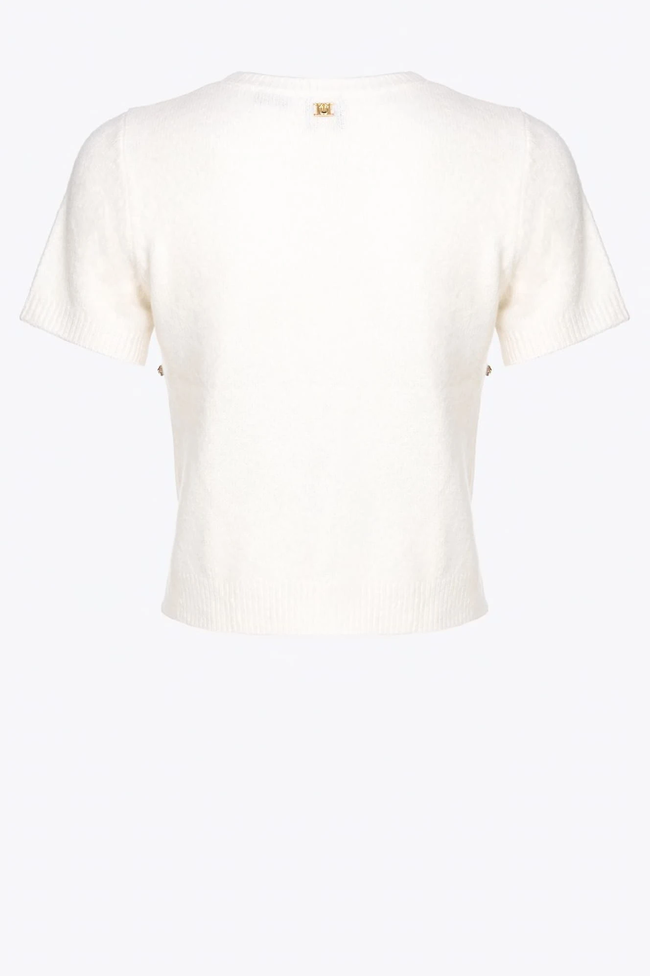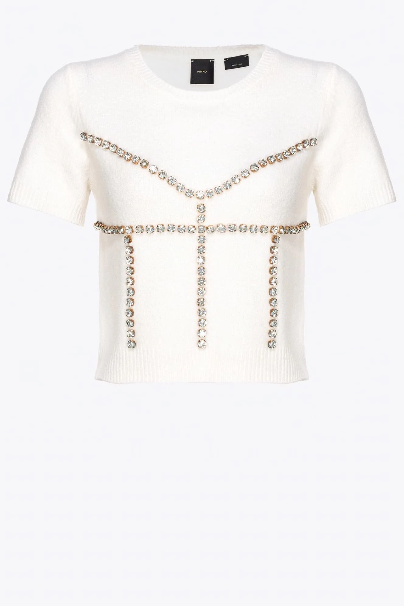 - Koszulka z krótkim rękawem, wykonana z super delikatnej miękkiej wełnianej przędzy, wzbogacona motywem kryształków z przodu
