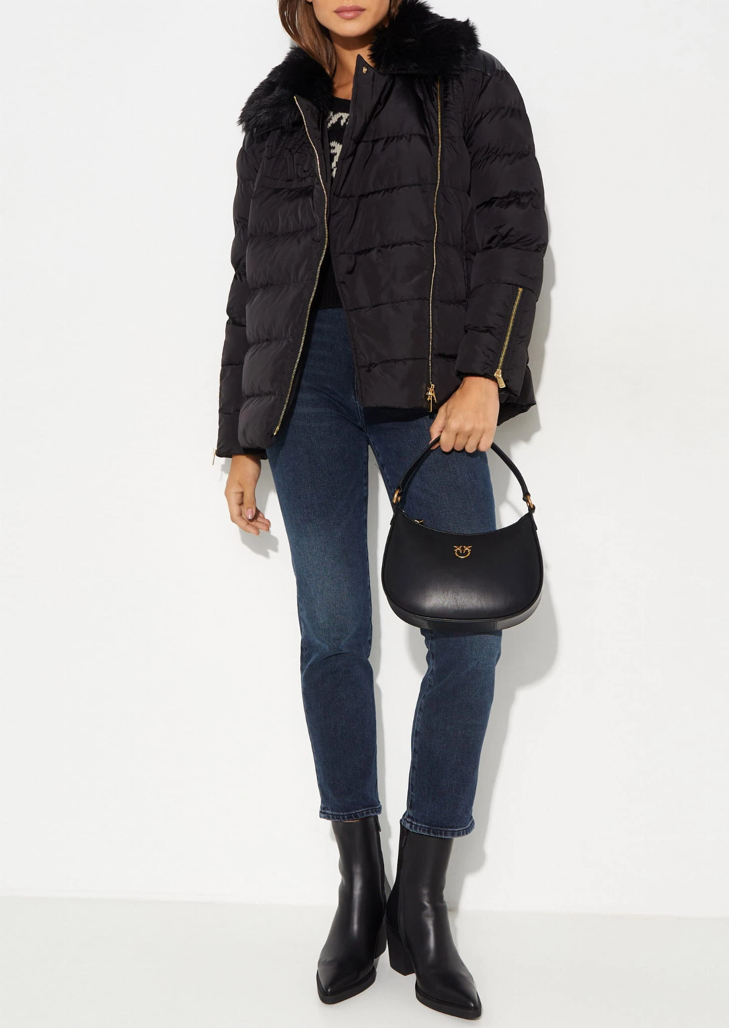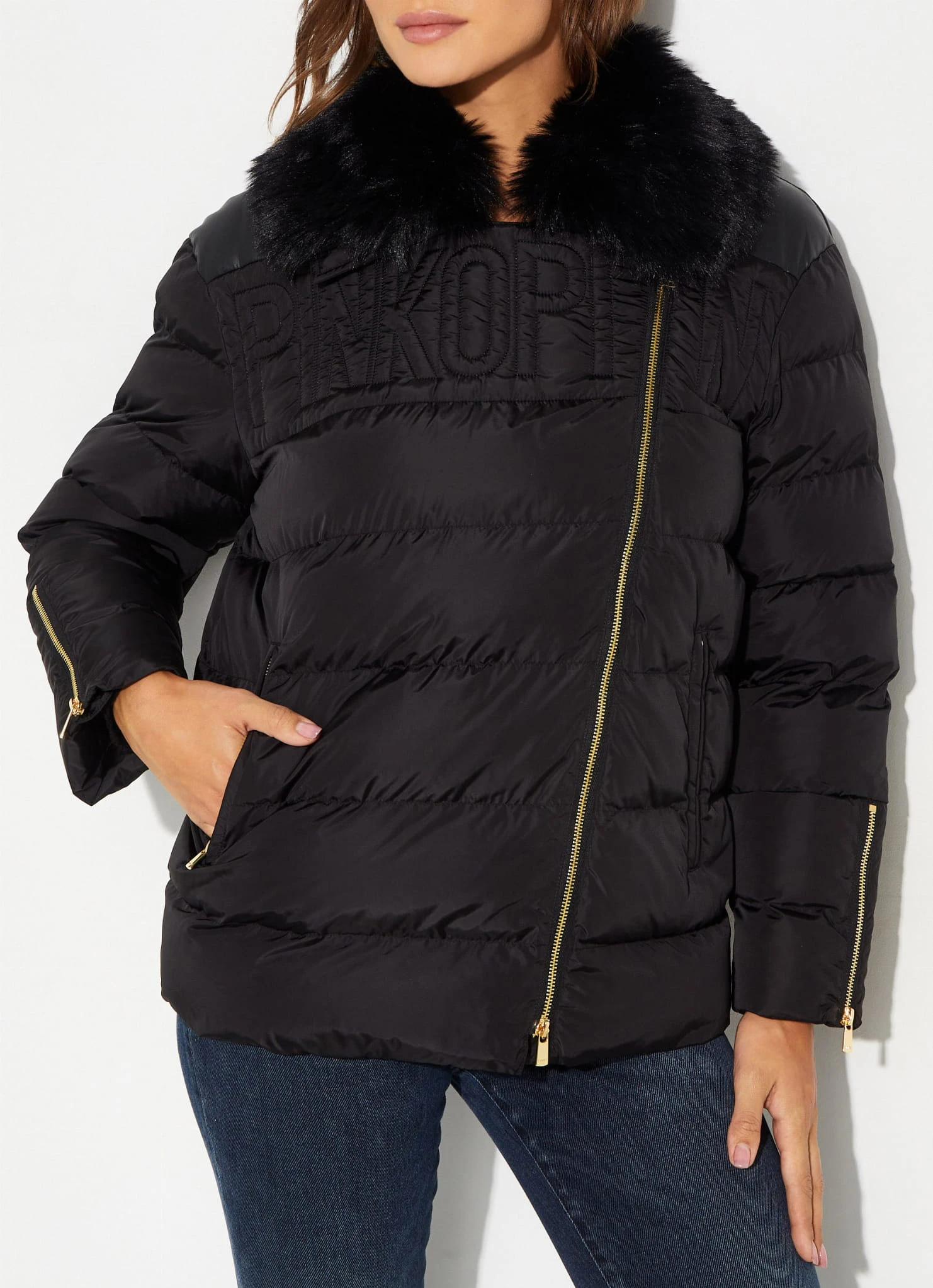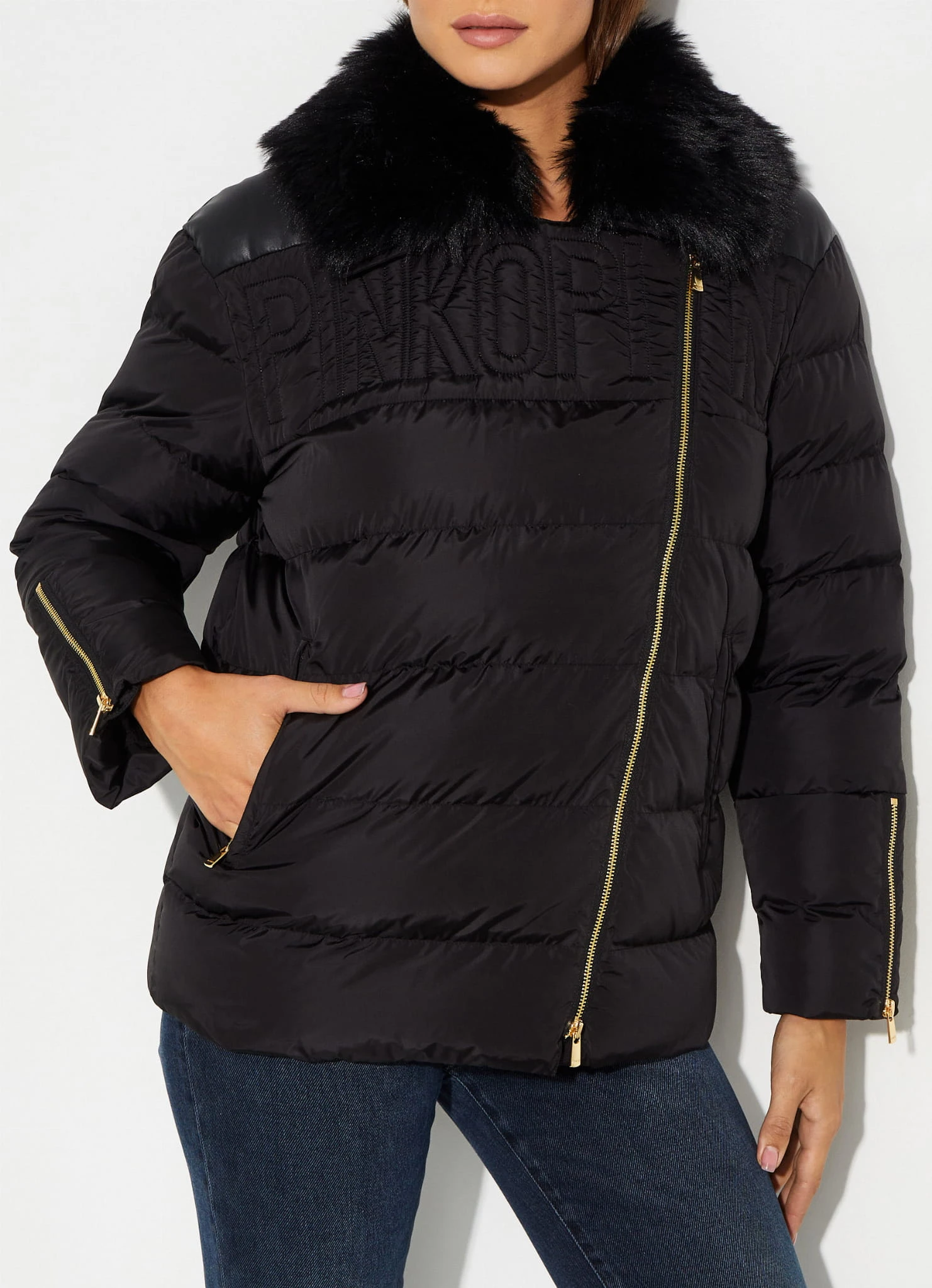 Czarna kurtka zimowa Pecora projektu marki Pinko, łącząca elegancję z funkcjonalnością. Wyposażona w futrzany kołnierz, który dodaje jej ciepła i luksusowego charakteru. Skośne zapięcie na suwak nadaje kurtce nowoczesnego wyglądu, a dwie boczne kieszenie na suwak zapewniają wygodę i praktyczność. Suwaki na rękawach to modny detal, który pozwala na regulację, a poziome pikowanie nadaje całości stylowego akcentu. Kurtka wypełniona syntetycznym materiałem zapewnia doskonałą izolację, czyniąc ją idealnym wyborem na zimowe dni.
